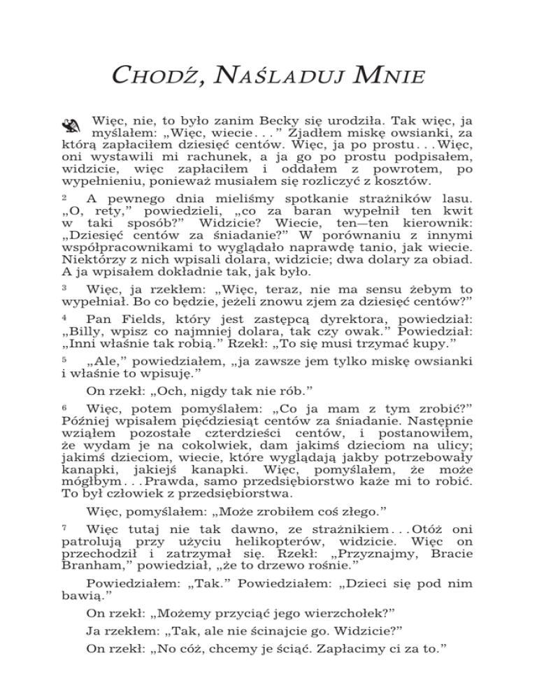 C HODŹ, NA ŚLA DUJ M NIE Więc, nie, to było zanim Becky się urodziła. Tak więc, ja myślałem: „Więc, wiecie…” Zjadłem miskę owsianki, za którą zapłaciłem dziesięć centów. Więc, ja po prostu…Więc, oni wystawili mi rachunek, a ja go po prostu podpisałem, widzicie, więc zapłaciłem i oddałem z powrotem, po wypełnieniu, ponieważ musiałem się rozliczyć z kosztów. 2 A pewnego dnia mieliśmy spotkanie strażników lasu. „O, rety,” powiedzieli, „co za baran wypełnił ten kwit w taki sposób?” Widzicie? Wiecie, ten—ten kierownik: „Dziesięć centów za śniadanie?” W porównaniu z innymi współpracownikami to wyglądało naprawdę tanio, jak wiecie. Niektórzy z nich wpisali dolara, widzicie; dwa dolary za obiad. A ja wpisałem dokładnie tak, jak było. 3 Więc, ja rzekłem: „Więc, teraz, nie ma sensu żebym to wypełniał. Bo co będzie, jeżeli znowu zjem za dziesięć centów?” 4 Pan Fields, który jest zastępcą dyrektora, powiedział: „Billy, wpisz co najmniej dolara, tak czy owak.” Powiedział: „Inni właśnie tak robią.” Rzekł: „To się musi trzymać kupy.” 5 „Ale,” powiedziałem, „ja zawsze jem tylko miskę owsianki i właśnie to wpisuję.” On rzekł: „Och, nigdy tak nie rób.” 6 Więc, potem pomyślałem: „Co ja mam z tym zrobić?” Później wpisałem pięćdziesiąt centów za śniadanie. Następnie wziąłem pozostałe czterdzieści centów, i postanowiłem, że wydam je na cokolwiek, dam jakimś dzieciom na ulicy; jakimś dzieciom, wiecie, które wyglądają jakby potrzebowały kanapki, jakiejś kanapki. Więc, pomyślałem, że może mógłbym…Prawda, samo przedsiębiorstwo każe mi to robić. To był człowiek z przedsiębiorstwa. Więc, pomyślałem: „Może zrobiłem coś złego.” 7 Więc tutaj nie tak dawno, ze strażnikiem…Otóż oni patrolują przy użyciu helikopterów, widzicie. Więc on przechodził i zatrzymał się. Rzekł: „Przyznajmy, Bracie Branham,” powiedział, „że to drzewo rośnie.” Powiedziałem: „Tak.” Powiedziałem: „Dzieci się pod nim bawią.” On rzekł: „Możemy przyciąć jego wierzchołek?” Ja rzekłem: „Tak, ale nie ścinajcie go. Widzicie?” On rzekł: „No cóż, chcemy je ściąć. Zapłacimy ci za to.” 2 MÓWIONE SŁOWO Powiedziałem: „Nie. Nie. Nie chcę go ścinać.” Więc, ja też znam przepisy gospodarki drogowej, jak wiesz, bo miałem z tym do czynienia przez siedem lat. Powiedziałem: „Nie.” Rzekłem: „Nie chcę go ścinać, lecz można je przyciąć u góry.” Powiedziałem: „Ja przycinam je u góry, lecz,” rzekłem, „ty możesz. Możesz je podciąć u góry, jeśli chcesz.” Powiedziałem: „Ja, Brat Woods i ja zamierzamy je przyciąć u góry. Przycinamy wierzchołki im wszystkim, tam wzdłuż.” I rzekłem: „Ale to drzewo chcemy trzymać ze względu na dzieci, Joe i inne dzieciaki, wiecie, małe dzieci, które się pod tym drzewem bawią.” 9 A potem wyjechałem w podróż. Kiedy wróciłem, to drzewo było ścięte i usunięte. Och, mogłem przeciwko temu przedsiębiorstwu wnieść skargę, widzicie, za to, że ścięli to drzewo, widzicie. I tak sobie pomyślałem: „No cóż,” powiedziałem, „Panie, ja nawet o tym nie wspomnę.” Widzicie? „Więc, jeśli chodzi o coś, co ja—co ja na tym czasami wpisywałem, zjadając tylko za dziesięć centów, a musiałem wpisywać ‚pięćdziesiąt centów.’” Widzicie? Powiedziałem: „Jeżeli w tym jest coś nie tak, chcę to naprawić, widzicie, żebym—żebym ja—żebym ja to uregulował, widzicie. Żebym ja…” I ja wtedy przestałem marzyć o tym, żeby być w tym Przedsiębiorstwie Usług Komunalnych, widzicie, ponieważ tam musiało być coś nie tak. Musimy uważać na to, co robimy. Pewnego dnia się z tym spotkamy. 10 Dzieci, one tu przychodzą. Tamtego dnia nie było waszej matki, Trudy, w domu. Myślę, że wy o tym, wy o tym nie wiedziałyście. Jest to dla was, jak widzę, pewnym zaskoczeniem. I wy niedługo kończycie szkołę. A my odbyliśmy razem tę podróż tutaj. Natychmiast po tym zgromadzeniu udajemy się na inne zgromadzenie. Potem wracamy do domu. 11 Pomyślałem, że to by była niezła okazja żeby mówić do was wszystkich, a także pomyślałem, że byłoby dobrze mówić do tych dzieci na krótko przed zakończeniem szkoły. Przeczytać jakiś werset z Biblii, i po prostu do was mówić, tak z serca, przez jakieś dziesięć minut. Potem macie mnie z głowy. Widzicie? 12 Zanim będę mówił do dzieci, chciałbym najpierw przez chwilę mówić też do dorosłych, do wszystkich. Być może, ta podróż jest bardzo napięta, jak dotąd. Ale to przeżycie, którego nauczyłem się od Boga, nie zamieniłbym tego, czego się nauczyłem od Pana, kiedy tutaj byłem, nawet za dziesięć tysięcy dolarów. Szczerze wierzę, że przybyłem tutaj w pełnym posłuszeństwie, wykonując rozkaz Wszechmogącego, i mam nadzieję, że tak będzie ze mną do końca. I tutaj jest… 13 Kiedy przybyłem, po pierwsze, było to na podstawie wizji, że stałem powyżej Tucson, u góry, kiedy odezwał 8 CHODŹ, NAŚLADUJ MNI E 3 się ten—ten—ten wybuch. Więc, był tam Brat Fred, gdy to wybuchło. A oni wykonali zdjęcie, wiecie, tam na niebie. A ja o tym wiele nie myślałem, nigdy nie zwracałem na to uwagi. Ale pewnego dnia to zaczęło robić na mnie jakieś wrażenie. A tutaj Brat Norman, ojciec Normy, powiedział: „Czy zwróciłeś na to uwagę?” 14 I właśnie kiedy spojrzałem, właśnie tam byli ci Aniołowie, tak wyraźnie, jak tylko możliwe, byli Oni umiejscowieni wprost na tym zdjęciu. Widzicie? Spojrzałem, żeby zobaczyć kiedy to się stało, a to był ten czas, ten sam, około dzień lub dwa przed, albo dzień lub dwa po tym, jak tam byłem. Spojrzałem na miejsce, gdzie to się stało. „Północny wschód od Flagstaff, lub Prescott, które leży na południe od Flagstaff.” No cóż, to jest dokładnie