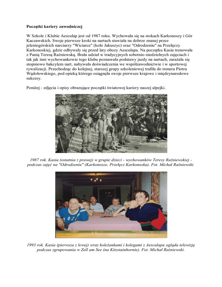 Początki kariery zawodniczej W Szkole i Klubie Aesculap jest od 1987 roku. Wychowała się na stokach Karkonoszy i Gór Kaczawskich. Swoje pierwsze kroki na nartach stawiała na dobrze znanej przez jeleniogórskich narciarzy "Wiciarce" (koło Jakuszyc) oraz "Odrodzeniu" na Przełęczy Karkonoskiej, gdzie odbywały się przed laty obozy Aesculapa. Na początku Kasia trenowała z Panią Teresą Rażniewską. Brała udział w tradycyjnych sobotnio-niedzielnych zajęciach i tak jak inni wychowankowie tego klubu poznawała podstawy jazdy na nartach, zarażała się stopniowo bakcylem nart, nabywała doświadczenia we współzawodnictwie i w sportowej rywalizacji. Przechodząc do kolejnej, starszej grupy szkoleniowej trafiła do trenera Piotra Wądołowskiego, pod opieką którego osiągnęła swoje pierwsze krajowe i międzynarodowe sukcesy. Poniżej - zdjęcia i opisy obrazujące początki światowej kariery naszej alpejki. 1987 rok. Kasia (ostatnia z prawej) w grupie dzieci - wychowanków Teresy Rażniewskiej podczas zajęć na "Odrodzeniu" (Karkonosze, Przełęcz Karkonoska). Fot. Michał Rażniewski. 1993 rok. Kasia (pierwsza z lewej) wraz koleżankami i kolegami z Aesculapa ogląda telewizję podczas zgrupowania w Zell am See (na Kitzstainhornie). Fot. Michał Rażniewski. 1994 rok. Kasia (druga z prawej) po zakończeniu Mistrzostw Tatrzańskiego Okręgowego Związku Narciarskiego 25-25. 01. 1994 r. (Nosal w Tatrach). Fot. Michał Rażniewski. 1995 rok. Aesculap w Kanadzie. Kasia i Piotr po sukcesach w prestiżowych zawodach Trofeo Topolino we Włoszech otrzymali zaproszenie do Kanady na zawody o podobnej renomie - Air Canada Whistler Cup. Na zdjęciu od lewej stoją: Tomasz Rażniewski (na stałe w Kanadzie opiekował się naszą ekipą podczas zawodów), Piotr Kaczmarek, Katarzyna Karasińska i Piotr Wądołowski (trener). Fot. Tomasz Rażniewski. 1995 rok. Air Canada Whistler Cup. Kasia ze srebrnym medalem na podium! Fot. Tomasz Rażniewski. 1995 rok. Uroczyste Zakończenie Sezonu 1994/1995. Na scenie Teatru Zdrojowego w Jeleniej Górze - Cieplicach stoją: Teresa Rażniewska (przy mównicy), Maria Kaczmarek, Piotr Kaczmarek, Piotr Wądołowski, Katarzyna Karasińska, Andrzej Karasiński. Fot. Michał Rażniewski. 1995 rok. Karpacz, Kopa. Piotr Wądołowski ze swoimi pupilami pozuje do fotografii (po lewej - Piotr Kaczmarek, po prawej Katarzyna Karasinska). Fot. Michał Rażniewski. 1997 rok. Air Canada Whistler Cup. Na zdjęciu: Jan Bisaga (trener), Katarzyna Karasińska, Piotr Kaczmarek, Jarosław Markl (trener). Fot. Tomasz Rażniewski. Michał Rażniewski Gazeta Wrocławska z dnia 13 marca 2001 roku tak pisze o Kasi. Po wywalczeniu olimpijskiej nominacji w Sankt Anton, Kasia Karasińska (SN i SKS AESCULAP) najlepsza w mistrzostwach Polski w narciarstwie alpejskim. Olimpijska nadzieja (Szczyrk) Niezwykle miła informacja dotarła do nas ze Szczyrku, gdzie na Skrzycznem odbyły się międzynarodowe mistrzostwa Polski w narciarstwie alpejskim. Otóż, jak doniosły agencje sportowe mieszkanka Zgorzelca, Katarzyna Karasińska wywalczyła złoty medal w slalomie oraz wicemistrzostwo kraju w slalomie gigancie. Tak więc, czyniąca stałe postępy utalentowana alpejka, stała się kolejną naszą nadzieją olimpijską. Zimowe igrzyska odbędą się w przyszłym roku w amerykańskim Salt Lake City. 6 marca odbył się slalom gigant. Na starcie stanęło 49 alpejek z Polski, Czech i Słowacji aby walczyć o tytuł mistrzyni naszego kraju. Zawody wygrała Dagmara Krzyżyńska, kolejne miejsca zajęły: Zuzana Smerciakova (Slowacja), Eva Kurfurstowa (Czechy). Na IV miejscu w klasyfikacji generalnej uplasowała się Katarzyna Karasińska. To był dobry start naszej alpejki, lecz to co się stało nazajutrz, zdumiało wszystkich. Oczywiście Karasińska należy do czołówki kraju, więc jej zwycięstwo nie jest sensacją. Niespodzianką jest styl, w jakim sięgnęła po złoto. Katarzyna wystartowała z numerem 3. i uzyskała bardzo dobry czas 51.89 sek. To jakby dodatkowo obciążyło startującą z numerem 7. Krzyżyńską, która nie wytrzymała roli faworytki i wypadła z trasy pierwszego przejazdu. Ostatecznie Karasińska zajęła bezapelacyjnie I. miejsce, deklasując wszystkie rywalki. Druga na mecie, ze strata ponad dwóch sekund uplasowała się Smerciakova, a trzecia Lubica Lopusna (obie ze Słowacji). Druga wśród Polek, Anna Klimek zanotowała do Karasińskiej 2,4 sek. straty a trzecia, Magdalena Kozik straciła aż 12,5 sek. Trasa była bardzo trudna, a świadczy o tym fakt, że zawodów nie ukończyły 23 zawodniczki. Tym większe słowa uznania należą się naszej młodziutkiej alpejce, która łączy postępy techniczne z odpornością na stres. Fot. archiwum Aesculapa Katarzyna Karasińska Katarzyna Karasińska Kasia druga na podium srebro w slalomie gigancie Złoto w slalomie na Międzynarodowych Mistrzostwach Polski Seniorów Tak się zaczęło Katarzyna Karasińska 24 listopada ubiegłego roku skończyła 18 lat. Po ukończeniu Szkoły Podstawowej nr 3 w Zgorzelcu podjęła naukę w Liceum Sportowym w Karpaczu. W tym roku zdaje maturę. Pierwszy raz stanęła na nartach w wieku 4 lat w Wałbrzychu, skąd pochodzi. Zaczęło się od rodzinnych wyjazdów weekendowych na narty. Prawie od początku swojej kariery należy do szkoły i klubu Aesculap Jelenia Góra Szybko zaczęły się wyjazdy i starty zagraniczne. Pierwszy międzynarodowy sukces miał miejsce we Włoszech na mistrzostwach świata juniorów młodszych (Trofeo Topolino) gdzie zajęła 2. miejsce w slalomie. Błyskawiczne postępy Od 5 lat w kadrze Polski. Należy do czołówki kraju seniorek, chociaż także w następnym sezonie (olimpijskim) będzie jeszcze juniorką. W ubiegłym sezonie w Szczyrku na Ogólnopolskiej Olimpiadzie Młodzieży zajęła 3. miejsce w slalomie, 3 . w gigancie i 2. w super gigancie. To dało jej w kombinacji (slalom i super gigant) 2. miejsce w kraju. Sezon 2000/2001 zaczęła od za
