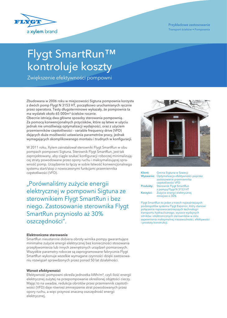 Przykładowe zastosowanie 7UDQVSRUWĘFLHNµZŘ3RPSRZQLD Flygt SmartRun™ kontroluje koszty Zwiększenie efektywności pompowni Zbudowana w 2006 roku w miejscowości Sigtuna pompownia korzysta z dwóch pomp Flygt N 3153 HT, początkowo uruchamianych ręcznie przez operatora. Testy długoterminowe wykazały, że pompownia ta ma wydatek około 65 000m³ ścieków rocznie. Obecnie istnieją dwa główne sposoby sterowania pompownią. Za pomocą konwencjonalnych przycisków, które są łatwe w użyciu jednak nie umożliwiają optymalizacji wydajności, oraz z użyciem przemienników częstotliwości - variable frequency drive (VFD) dających duże możliwości ustawiania parametrów pracy, jednak wymagających skomplikowanego montażu i trudnych w konfiguracji. W 2011 roku, Xylem zainstalował sterowniki Flygt SmartRun w obu pompach pompowni Sigtuna. Sterownik Flygt SmartRun, jest tak zaprojektowany, aby ciągle szukać konfiguracji roboczej minimalizującej straty powodowane przez opory ruchu i maksymalizującej sprawność pomp. Urządzenie to łączy w sobie łatwość konwencjonalnego systemu start/stop z nowoczesnymi funkcjami przemiennika częstotliwości (VFD). „Porównaliśmy zużycie energii elektrycznej w pompowni Sigtuna ze sterownikiem Flygt SmartRun i bez niego. Zastosowanie sterownika Flygt SmartRun przyniosło aż 30% oszczędności”. Elektroniczne sterowanie SmartRun nieustannie dobiera obroty wirnika pompy gwarantujące minimalne zużycie energii elektrycznej bez konieczności stosowania przepływomierza lub innych zewnętrznych urządzeń pomiarowych. Wszystkie parametry robocze są zaprogramowane fabrycznie.Flygt SmartRun wykonuje wszelkie wymagane czynności dzięki zastosowaniu rozwiązań sprawdzonych przez ponad 50 lat działalności. Wzrost efektywności Efektywność pompowni określa jednostka kWh/m³, czyli ilość energii elektrycznej zużytej na przepompowanie określonej objętości cieczy. Mając to na uwadze, redukcja obrotów przez przemiennik częstotliwości (VFD) daje również zmniejszenie strat powodowanych przez opory ruchu, a więc przynosi znaczną oszczędność energii elektrycznej. Klient: Gmina Sigtuna w Szwecji Wyzwanie: Optymalizacja efektywności poprzez zastosowanie przemiennika częstotliwości VFD Produkty: Sterownik Flygt SmartRun z pompą Flygt N 3153 HT Korzyści: Zużycie energii elektrycznej mniejsze o 30% Flygt SmartRun to jeden z trzech najważniejszych podzespołów systemu Flygt Experior, który stanowi połączenie najnowocześniejszych technologii transportu hydraulicznego, wysoce wydajnych silników i elektronicznych sterowników w celu zapewnienia maksymalnej niezawodności, efektywości i prostoty konstrukcji. Średnia efektywność energetyczna przed i po instalacji sterownika wyniosła odpowiednio 0,113 kWh/m³ i 0,079 kWh/m³, co oznacza oszczędność rzędu 30%. W okresie testowym, sterownik Flygt SmartRun samodzielnie dostosował się do minimalnej częstotliwości pracy napędu wynoszącej 37Hz. Roczne zużycie energii elektrycznej kWh 8000 7000 6000 5000 4000 3000 2000 1000 0 Sterowanie start/stop przy 50 Hz Flygt SmartRun Płynniejsza praca Zużycie energii elektrycznej ma znaczenie zarówno dla małych, jak i dużych pompowni lub oczyszczalni ścieków. Im jest mniejsze, tym lepiej, gdyż maleją wtedy koszty eksploatacji, a zanieczyszczenie środowiska naturalnego jest mniejsze. „Możemy mieć pewność, że Flygt zaoferuje nam innowacyjne rozwiązania i fachową obsługę – dopasowaną do naszych potrzeb”. Oprócz oszczędności energii elektrycznej, Flygt SmartRun zapewnia również prostszą i łatwiejszą obsługę. Rozruch instalacji jest bardzo prosty. Zaprogramowane właściwości urządzenia umożliwiają czyszczenie pomp, komory czerpnej i rurociągów, co pozwala zredukować wiele czynności konserwacyjnych. Osadzanie się tłuszczu na pompie i ścianach komory czerpnej zdarza się często w pompowniach ścieków. Flygt SmartRun może przeprowadzić cykl czyszczenia instalacji, podczas którego pompa nie zatrzymuje się na dolnym poziomie wyłączania, lecz obniża poziom ścieków na tyle nisko, że zasysa i usuwa sedymentujące osady, tłuszcze, oleje oraz zanieczyszczenia pływające i unoszące się na powierzchni. Dodatkowo, rozpoczynanie pompowania przy różnych poziomach ścieków w komorze czerpnej zmniejsza ilość osadu gromadzącego się na jej ścianach. Przy stosowaniu konwencjonalnych przemienników częstotliwości, czasem problemem jest zbyt mała prędkość przepływu, co powoduje gromadzenie się osadu w rurach. Podczas cyklu czyszczenia, Flygt SmartRun przepłukuje rurociąg w celu ograniczenia sedymentacji zanieczyszczeń i zarastania rurociągów. Sterownik Flygt SmartRun umożliwia też dokładniejsze monitorowanie pracy. Za pośrednictwem szyny ModbusRTU, komunikuje się ze sterownikami APP, MAS lub innymi jednostkami sterującymi, co umożliwia przesył i zdalne przeglądanie informacji o pracy systemu. Za pomocą przeglądarki w komputerze, smartfonie lub tablecie, użytkownik może sprawdzać wszystkie dane, zmieniać niektóre parametry i zarządzać alarmami. xyleminc.com © 2012 Xylem, Inc. Xylem Water Solutions Polska Sp. z o. o. Dawidy, ul. Warszawska 49 05-090 Raszyn Tel +48 22 735 81 00 www.xylem.pl Flygt SmartRun oferuje szereg zalet w jednym zautomatyzowanym pakiecie. Jest łatwy w instalacji. Ustawienie parametrów roboczych nie wymaga informatycznej wiedzy fachowej. 1529 . Flygt SmartRun™ kontroluje koszty . 1 . Master . 1 . 20120925 W celu udowodnienia tej tezy, w pompowni Sigtuna umieszczono instalację do przeprowadzenia testów. Efektywność energetyczną określono poprzez pomiar zużycia energii elektrycznej i objętości cieczy przepompowanej w konkretnym czasie, przed zainstalowaniem sterownika Flygt SmartRun i po jego zainstalowaniu, a następnie wykonano prognozę rocznego zużycia energii.