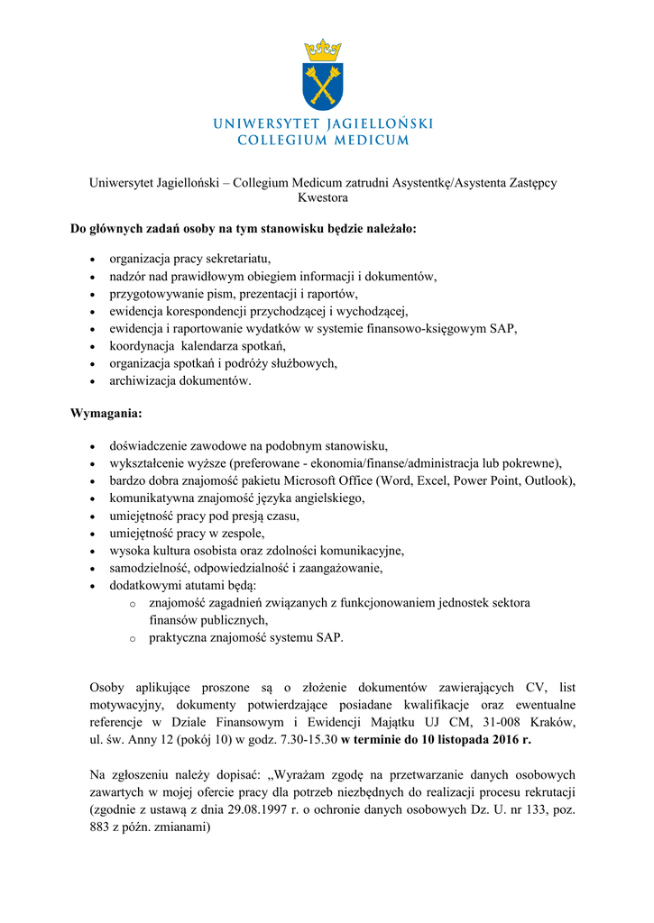 Uniwersytet Jagielloński – Collegium Medicum zatrudni Asystentkę/Asystenta Zastępcy Kwestora Do głównych zadań osoby na tym stanowisku będzie należało: organizacja pracy sekretariatu, nadzór nad prawidłowym obiegiem informacji i dokumentów, przygotowywanie pism, prezentacji i raportów, ewidencja korespondencji przychodzącej i wychodzącej, ewidencja i raportowanie wydatków w systemie finansowo-księgowym SAP, koordynacja kalendarza spotkań, organizacja spotkań i podróży służbowych, archiwizacja dokumentów. Wymagania: doświadczenie zawodowe na podobnym stanowisku, wykształcenie wyższe (preferowane - ekonomia/finanse/administracja lub pokrewne), bardzo dobra znajomość pakietu Microsoft Office (Word, Excel, Power Point, Outlook), komunikatywna znajomość języka angielskiego, umiejętność pracy pod presją czasu, umiejętność pracy w zespole, wysoka kultura osobista oraz zdolności komunikacyjne, samodzielność, odpowiedzialność i zaangażowanie, dodatkowymi atutami będą: o znajomość zagadnień związanych z funkcjonowaniem jednostek sektora finansów publicznych, o praktyczna znajomość systemu SAP. Osoby aplikujące proszone są o złożenie dokumentów zawierających CV, list motywacyjny, dokumenty potwierdzające posiadane kwalifikacje oraz ewentualne referencje w Dziale Finansowym i Ewidencji Majątku UJ CM, 31-008 Kraków, ul. św. Anny 12 (pokój 10) w godz. 7.30-15.30 w terminie do 10 listopada 2016 r. Na zgłoszeniu należy dopisać: „Wyrażam zgodę na przetwarzanie danych osobowych zawartych w mojej ofercie pracy dla potrzeb niezbędnych do realizacji procesu rekrutacji (zgodnie z ustawą z dnia 29.08.1997 r. o ochronie danych osobowych Dz. U. nr 133, poz. 883 z późn. zmianami) Uniwersytet Jagielloński - Collegium Medicum zastrzega sobie możliwość kontaktu jedynie z wybranymi kandydatami oraz prawo do powiadomienia o podjętej decyzji w sprawie obsadzenia stanowiska jedynie wybranych kandydatów.