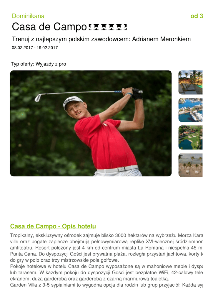 Dominikana od 3715 Casa de Campo Trenuj z najlepszym polskim zawodowcem: Adrianem Meronkiem 08.02.2017 - 19.02.2017 Typ oferty: Wyjazdy z pro Casa de Campo - Opis hotelu Tropikalny, ekskluzywny ośrodek zajmuje blisko 3000 hektarów na wybrzeżu Morza Karaibski ville oraz bogate zaplecze obejmują pełnowymiarową replikę XVI-wiecznej śródziemnomorsk amfiteatru. Resort położony jest 4 km od centrum miasta La Romana i niespełna 45 min od Punta Cana. Do dyspozycji Gości jest prywatna plaża, rozległa przystań jachtowa, korty teniso do gry w polo oraz trzy mistrzowskie pola golfowe. Pokoje hotelowe w hotelu Casa de Campo wyposażone są w mahoniowe meble i dysponują lub tarasem. W każdym pokoju do dyspozycji Gości jest bezpłatne WiFi, 42-calowy telewizor ekranem, duża garderoba oraz garderoba z czarną marmurową toaletką. Garden Villa z 3-5 sypialniami to wygodna opcja dla rodzin lub grup przyjaciół. Każda sypialni łazienką, przestronny salon z kuchnią i jadalnią, serwis sprzątający 07-16:00, powitalny pak (3rumy, piwa, napoi i kosz owoców, dwa 4 os. Melexy do użytku na terenie resortu. Casa De Campo to również „podróży kulinarna” w rożne zakątki świata. 12 barrów i restaurac nocny zapewnią niesamowite doznania nie tylko smakowe, każdego dnia. Goście mają do dyspozycji czteroosobowe wózki, którymi można poruszać się po terenie ośro zapewnia wiele atrakcji, konne przejażdżki oraz możliwość uprawiania sportów wodnych. Obi również zabiegi spa, liczne zajecia fitness i jogę oraz wieczorne programy rozrywkowe. http://www.casadecampo.com.do/ Program oferty Trenuj z najlepszym polskim zawodowcem - Adrianem Meronkiem Najlepszy ośrodek golfowy na Karaibach w towarzystwie najlepszego polskiego zawodowca! W golfa gra odkąd pamięta. Od paru lat miał możliwość rywalizacji z najlepszymi amatorami n Również jako pierwszy Polak zagrał w turnieju z cyklu European Tour oraz reprezentow Europy w Palmers Cup. „Zachęcam wszystkich do wyjazdu ze mną na słoneczną Dominikanę. Oferuje wsp wskazówki na rangu, tajniki course management, a także pokażę różne ćwiczenia na oraz puttowanie”. Pola w pakiecie W klubie Casa de Campo, wielokrotnie nagradzanym, są trzy 18-dołkowe pola, gdzie m.in. z słynnym Teeth of The Dog, wielokrotnie nagradzany i będący w top 100 najlepszych pól na dołków będzie rozgrywanych bezpośrednio nad Morzem Karaibskim. Dye Fore jest rozgry kanionem o wysokości 300 stóp. Kolejne pole – The Links zostało oddane do użytku po renowacji w 2012 roku. http://www.casadecampo.com.do/golf Propozycja przelotu Czarter z WAW: 08.02 WAW PUJ 06:20 13:00 18.02 PUJ WAW 14:10 05:10 + 1 cena za bilet od 2650 zł Udogodnienia hotelu Bar Bar z przekąskami Całodobowa recepcja Całoroczny basen Centrum biznesowe Centrum Fitness Internet Wi-Fi Klimatyzacja Żelazko i deska do prasowania Masaż Mini Bar Obsługa pokoju Obsługa VIP Opieka nad dziećmi Pokój z tarasem Pokoje dla niepalących Pokoje dzwiękoszczelne Prasa Przechowalnia bagażu Restauracja Restauracja z wyborem dań z karty Sejf Sklepy w hotelu Suszarka Telewizja Telewizja satelitarna Urządzenia do przyrządzania kawy i herbaty Usługi pralni Usługi Spa & Wellness Wymiana walut Zaplecze bankietowe/konferencyjne Casa de Campo 5* Golfer DBL Golfer S 10 nocy/ BB/ cena w $ od os 08-18.02.17 3880.00 USD 5325.00 Promo przy rezerwacji do 15.12.17 3715.00 USD 5090.00 cena ważna przy grupie min 8 os! Zapytaj o cenę dla osoby towarzyszącej! Oferta zawiera 10 nocy w pokoju DBL lub SGL Elite Patio, Śniadania, PAKIET 8 GREEN FEE na polach Teath of The Dog Course, Dye Fore, Links, Piłki na DR i malex na 2 os., Trening i wspólna gra z Adrianem Meronkiem, 4 osobowe wózki do poruszania się na terenie ośrodka, Oferta nie zawiera Przelotu na Dominikanę, Napiwków dla caddy, kierowcy, wózków, Opłaty za caddy (obowiązkowy na Teeth of The Dog) – od 25 $ (2 os) lub 40$ (4 os), Dopłata do Half Board 965 $ lub All Inclusive 2125$/os/pobyt., VIP transfer lotniskowy, Ubezpieczenie KL NNW z OC, Lokalne podatki, Katarzyna Bobińska tel: +48 600 88 55 44 e-mail: kbobinska@travel