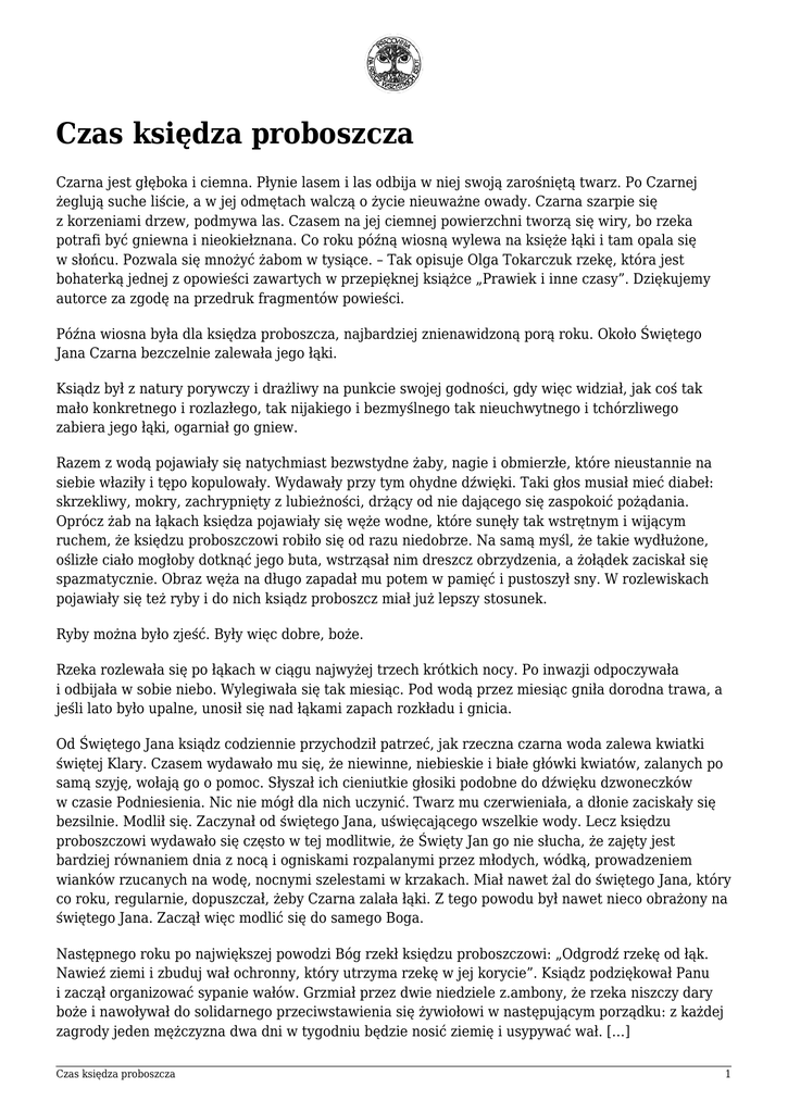 Czas księdza proboszcza Czarna jest głęboka i ciemna. Płynie lasem i las odbija w niej swoją zarośniętą twarz. Po Czarnej żeglują suche liście, a w jej odmętach walczą o życie nieuważne owady. Czarna szarpie się z korzeniami drzew, podmywa las. Czasem na jej ciemnej powierzchni tworzą się wiry, bo rzeka potrafi być gniewna i nieokiełznana. Co roku późną wiosną wylewa na księże łąki i tam opala się w słońcu. Pozwala się mnożyć żabom w tysiące. – Tak opisuje Olga Tokarczuk rzekę, która jest bohaterką jednej z opowieści zawartych w przepięknej książce „Prawiek i inne czasy”. Dziękujemy autorce za zgodę na przedruk fragmentów powieści. Późna wiosna była dla księdza proboszcza, najbardziej znienawidzoną porą roku. Około Świętego Jana Czarna bezczelnie zalewała jego łąki. Ksiądz był z natury porywczy i drażliwy na punkcie swojej godności, gdy więc widział, jak coś tak mało konkretnego i rozlazłego, tak nijakiego i bezmyślnego tak nieuchwytnego i tchórzliwego zabiera jego łąki, ogarniał go gniew. Razem z wodą pojawiały się natychmiast bezwstydne żaby, nagie i obmierzłe, które nieustannie na siebie właziły i tępo kopulowały. Wydawały przy tym ohydne dźwięki. Taki głos musiał mieć diabeł: skrzekliwy, mokry, zachrypnięty z lubieżności, drżący od nie dającego się zaspokoić pożądania. Oprócz żab na łąkach księdza pojawiały się węże wodne, które sunęły tak wstrętnym i wijącym ruchem, że księdzu proboszczowi robiło się od razu niedobrze. Na samą myśl, że takie wydłużone, oślizłe ciało mogłoby dotknąć jego buta, wstrząsał nim dreszcz obrzydzenia, a żołądek zaciskał się spazmatycznie. Obraz węża na długo zapadał mu potem w pamięć i pustoszył sny. W rozlewiskach pojawiały się też ryby i do nich ksiądz proboszcz miał już lepszy stosunek. Ryby można było zjeść. Były więc dobre, boże. Rzeka rozlewała się po łąkach w ciągu najwyżej trzech krótkich nocy. Po inwazji odpoczywała i odbijała w sobie niebo. Wylegiwała się tak miesiąc. Pod wodą przez miesiąc gniła dorodna trawa, a jeśli lato było upalne, unosił się nad łąkami zapach rozkładu i gnicia. Od Świętego Jana ksiądz codziennie przychodził patrzeć, jak rzeczna czarna woda zalewa kwiatki świętej Klary. Czasem wydawało mu się, że niewinne, niebieskie i białe główki kwiatów, zalanych po samą szyję, wołają go o pomoc. Słyszał ich cieniutkie głosiki podobne do dźwięku dzwoneczków w czasie Podniesienia. Nic nie mógł dla nich uczynić. Twarz mu czerwieniała, a dłonie zaciskały się bezsilnie. Modlił się. Zaczynał od świętego Jana, uświęcającego wszelkie wody. Lecz księdzu proboszczowi wydawało się często w tej modlitwie, że Święty Jan go nie słucha, że zajęty jest bardziej równaniem dnia z nocą i ogniskami rozpalanymi przez młodych, wódką, prowadzeniem wianków rzucanych na wodę, nocnymi szelestami w krzakach. Miał nawet żal do świętego Jana, który co roku, regularnie, dopuszczał, żeby Czarna zalała łąki. Z tego powodu był nawet nieco obrażony na świętego Jana. Zaczął więc modlić się do samego Boga. Następnego roku po największej powodzi Bóg rzekł księdzu proboszczowi: „Odgrodź rzekę od łąk. Nawieź ziemi i zbuduj wał ochronny, który utrzyma rzekę w jej korycie”. Ksiądz podziękował Panu i zaczął organizować sypanie wałów. Grzmiał przez dwie niedziele z.ambony, że rzeka niszczy dary boże i nawoływał do solidarnego przeciwstawienia się żywiołowi w następującym porządku: z każdej zagrody jeden mężczyzna dwa dni w tygodniu będzie nosić ziemię i usypywać wał. […] Czas księdza proboszcza 1 Mieli tylko jedną furmankę, więc praca szła powoli. Ksiądz martwił się, że wiosenna pogoda pokrzyżuje plany. Popędzał chłopów, jak mógł. Sam też podwijał sutannę – ale uważał na porządne skórzane buty – i biegał między chłopami, potrącał worki, okładał batem konia. Następnego dnia do pracy przyszedł tylko Serafin ze złamanym palcem. Zagniewany ksiądz proboszcz objechał bryczką całą wieś, lecz okazało się, że robotników albo nie ma w domu, albo leżą zmożeni chorobą. To był dzień, kiedy ksiądz proboszcz znienawidził wszystkich chłopów z Prawieku – leniwych, gnuśnych i żądnych pieniędzy. Żarliwie tłumaczył się przed Panem z tego uczucia niegodnego sługi bożego. Poprosił znowu Boga o radę. „Podnieś im stawkę” – rzekł do niego Bóg. To była mądra rada. Praca ruszyła. Najpierw furmankami wożono piasek zza Górki, potem ten piasek ładowano w jutowe worki i okładano nimi rzekę, jakby była ranna. Dopiero wtedy zasypywano wszystko ziemią i siano na niej trawę. Ksiądz proboszcz z radością przyglądał się własnemu dziełu. Rzeka była teraz całkiem oddzielona od łąki. Rzeka nie widziała łąki. Łąka nie widziała rzeki. Rzeka nie próbowała już wyrywać się z wyznaczonego jej miejsca. Płynęła sobie spokojna i zamyślona, nieprzejrzysta dla wzroku ludzi. Wzdłuż obu jej brzegów łąki zazieleniły się, a potem zakwitły mniszkami. Na księżowskich łąkach kwiaty modlą się nieustannie. Modlą się te wszystkie kwiatki świętej Małgorzatki i dzwoneczki świętego Rocha oraz zwyczajne, żółte mniszki. Od ciągłych modlitw ciała mniszków stają się coraz mniej materialne, coraz mniej żółte, coraz mniej konkretne, aż w czerwcu zamieniają się w subtelne dmuchawce. Wtedy Bóg, wzruszony ich pobożnością, wysyła ciepłe wiatry, które zabierają dmuchawcowe dusze mniszków do nieba. Te same ciepłe wiatry przyniosły na Świętego Jana deszcze. Rzeka wzbierała centymetr po centymetrze. Ksiądz proboszcz nie spał i nie jadł. Biegł groblą i łąkami nad rzekę i patrzył. Mierzył kijem poziom wody i mruczał pod nosem przekleństwa i modlitwy. Rzeka nie zważała na niego. Pł