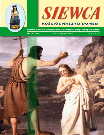KO Ś C I Ó Ł N A S Z YM D O M E M Pismo Parafii p.w. Nawiedzenia Najświętszej Maryi Panny w Sejnach Nr 74 (142) 8 – 21 stycznia 2012 r. Cena 1,- zł MOC SŁOWA Niedziela Chrztu Pańskiego – 8 stycznia 2012 Mk 1,6b-11 J an Chrzciciel tak głosił: „Idzie za mną mocniejszy ode mnie, a ja nie jestem godzien, aby się schylić i rozwiązać rzemyk u Jego sandałów. Ja chrzciłem was wodą, On zaś chrzcić was będzie Duchem Świętym”. W owym czasie przyszedł Jezus z Nazaretu w Galilei i przyjął od Jana chrzest w Jordanie. W chwili, gdy wychodził z wody, ujrzał rozwierające się niebo i Ducha jak gołębicę zstępującego na siebie. A z nieba odezwał się głos: „Tyś jest mój Syn umiłowany, w Tobie mam upodobanie”. Refleksja niedzielna: To jest historyczna, co więcej – święta chwila. Jezus przychodzi z Nazaretu w Galilei i przyjmuje od Jana chrzest. Jan udziela Jezusowi chrztu w Jordanie. Gdy Jezus wychodzi z rzeki, z nieba odzywa się głos: „Tyś jest mój Syn umiłowany, w Tobie mam upodobanie”. Świat milczy. W każdym razie w tym momencie. Potem wszystko zaczyna się kręcić dalej. Ale kręci się już trochę inaczej. Odtąd wszystko kręci się wokół Boga. Nie tylko Izrael i Palestyna. Ale cały świat. Także my. Ta święta chwila jest przeznaczona dla mnie. I dla wszystkich, którzy poszukują Boga, zbawienia, odpowiedzi na pytanie: „Po co żyję?” Żyję, bo tak chce Bóg. Żyję, ponieważ Bóg ma upodobanie we mnie. Żyję, żebym czuł się kochany przez Boga i mógł pełnić Jego wolę. Zostałem ochrzczony jak Jezus. Jestem dzieckiem Bożym jak Jezus. Oczywiście, nie mogę się równać z Jezusem, ale pod jednym względem jestem do Niego podobny. Zostałem ochrzczony. Tak jak On. Zostałem uznany za dziecko przez Pana historii. I nie tylko ja, ale wszyscy, którzy zostali ochrzczeni w imię Jezusa. Wokół tego kręci się teraz świat. Chrzest uświęca mnie. A ja swoim życiem uświęcam wszystko, co żyje. A wszystko to jedynie dzieje się ku większej chwale Boga, Ojca. go szukacie?” Oni powiedzieli do Niego: „Rabbi, to znaczy: Nauczycielu, gdzie mieszkasz?” Odpowiedział im: „Chodźcie, a zobaczycie”. Poszli więc i zobaczyli, gdzie mieszka, i tego dnia pozostali u Niego. Było to około godziny dziesiątej. Jednym z dwóch, którzy to usłyszeli od Jana i poszli za Nim, był Andrzej, brat Szymona Piotra. Ten spotkał najpierw swego brata i rzekł do niego: „Znaleźliśmy Mesjasza”, to znaczy: Chrystusa. I przyprowadził go do Jezusa. A Jezus wejrzawszy na niego rzekł: „Ty jesteś Szymon, syn Jana, ty będziesz się nazywał Kefas”, to znaczy: Piotr. Refleksja niedzielna: Ktoś mówi: „Popatrzcie! Spójrzcie na tego człowieka!” Dwaj mężczyźni usłyszeli, co mówi, i dają posłuch jego słowom. Chcą spotkać tego szczególnego człowieka. Jezus spostrzega ich, zagaduje i zaprasza do siebie: „Chodźcie, a zobaczycie. Sami wyrobicie sobie zdanie”. Dwaj mężczyźni nie dają się długo prosić. Przyjmują zaproszenie Jezusa. Idą za Nim. Pozostają u Niego. Pozwalają się zarazić atmosferą Jego domu, Jego wiarą, Jego słowami. I to tak bardzo, że nie mogą tego, co zobaczyli i czego doświadczyli, zatrzymać dla siebie. Andrzej opowiada o spotkaniu z Jezusem swemu bratu Szymonowi. Zachęca go, żeby także poszedł i zobaczył. Szymon także zdaje się na słowa brata, pozwala się zaprowadzić do Jezusa. I jego życie otrzymuje nową, głębszą jakość. Stanie się człowiekiem, którego ujrzał w nim Bóg - Szymonem Piotrem, Skałą. My też jesteśmy zaproszeni, by dać posłuch słowom zachęcającym do spojrzenia na owego szczególnego człowieka - Baranka Bożego, Mesjasza, Jezusa. I zdać się na historię, jaką Bóg zamierzył dla nas i z nami. Przyjąć zaproszenie do odkrycia prawdziwego człowieka, który w nas tkwi z wszystkimi uczuciami, z wszystkimi światłami i cieniami. I możemy być przekonani, że gdy tylko rzeczywiście zdamy się na nasze prawdziwe życie - na to, co spotyka nas każdego dnia: miłość, wyzwania, ludzie, znaki… - z pewnością znajdziemy człowieka, którego widzi w nas sam Bóg. Niedziela II Zwykła, 15 stycznia 2012 J 1,35-42 J an stał wraz z dwoma swoimi uczniami i gdy zobaczył przechodzącego Jezusa, rzekł:„Oto Baranek Boży”. Dwaj uczniowie usłyszeli, jak mówił, i poszli za Jezusem. Jezus zaś odwróciwszy się i ujrzawszy, że oni idą za Nim, rzekł do nich: „Cze- SIEWCA Wśród ruin kościoła Św. Cypriana w Kartaginie odnaleziono dobrze zachowaną płaskorzeźbę z pierwszych wieków chrześcijaństwa, przedstawiającą Świętą Rodzinę. Rodzina Święta Na pierwszym planie jest postać Matki Bożej, trzymającej Dzieciątko Jezus na kolanach. Z tyłu stoi św. Józef. Oczy ma wzniesione ku niebu. Z postawy jego widać, że pogrążony jest w modlitwie. Pod płaskorzeźbą widnieje napis: „Święta Maryjo, wspomagaj nas”. Kto umieścił ten napis? Nie wiadomo. Co jednak można powiedzieć z całą pewnością? To, że płaskorzeźba jest wyrazem wiary chrześcijan pierwszych wieków. Przeżywamy okres Bożego Narodzenia. W kościołach widzimy szopki, są oświetlone choinki. W piątek po Bożym Narodzeniu jest uroczystość Świętej Rodziny, czyli tej wspólnoty, jaką tworzyli Jezus, Maryja, Józef. Bóg chciał, by Jego Syn wzrastał w środowisku rodzinnym i wszedł w nie tak ściśle, aby patrząc z zewnątrz można było dostrzec jedynie zwyczajną ludzką codzienność. Rodzina, w której przyszedł na świat Chrystus, była narażona na liczne niebezpieczeństwa. Św. Mateusz opisuje, jak to Józef, Maryja i Dziecię Jezus uciekali przed gniewem Heroda do Egiptu. Rodzice na tułaczce, wśród obcych ludzi, na pewno zaznali tam głodu i niejednej przykrości. Rodzina Święta, w której narodził się Chrystus, zachowywała wiernie przykazania Boże wyrażone w Prawie Mojżeszowym. Św. Łukasz opisuje w swe