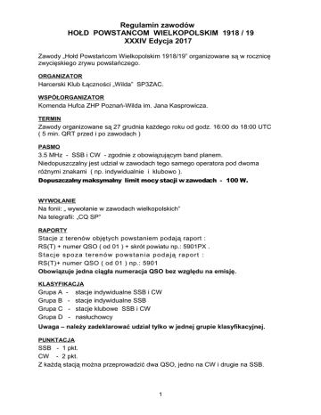 Regulamin zawodów HOŁD POWSTANCOM WIELKOPOLSKIM 1918 / 19 XXXIV Edycja 2017 Zawody „Hołd Powstańcom Wielkopolskim 1918/19” organizowane są w rocznicę zwycięskiego zrywu powstańczego. ORGANIZATOR Harcerski Klub Łączności „Wilda” SP3ZAC. WSPÓŁORGANIZATOR Komenda Hufca ZHP Poznań-Wilda im. Jana Kasprowicza. TERMIN Zawody organizowane są 27 grudnia każdego roku od godz. 16:00 do 18:00 UTC ( 5 min. QRT przed i po zawodach ) PASMO 3.5 MHz - SSB i CW - zgodnie z obowiązującym band planem. Niedopuszczalny jest udział w zawodach tego samego operatora pod dwoma różnymi znakami ( np. indywidualnie i klubowo ). Dopuszczalny maksymalny limit mocy stacji w zawodach - 100 W. WYWOŁANIE Na fonii: „ wywołanie w zawodach wielkopolskich” Na telegrafii: „CQ SP” RAPORTY Stacje z terenów objętych powstaniem podają raport : RS(T) + numer QSO ( od 01 ) + skrót powiatu np.: 5901PX . S ta c je s po za te re n ó w po ws ta n i a p o da j ą ra po rt : RS(T)+ numer QSO ( od 01 ) np.: 5901 Obowiązuje jedna ciągła numeracja QSO bez względu na emisję. KLASYFIKACJA Grupa A Grupa B Grupa C Grupa D - stacje indywidualne SSB i CW stacje indywidualne SSB stacje klubowe SSB i CW nasłuchowcy Uwaga – należy zadeklarować udział tylko w jednej grupie klasyfikacyjnej. PUNKTACJA SSB - 1 pkt. CW - 2 pkt. Z każdą stacją można przeprowadzić dwa QSO, jedno na CW i drugie na SSB. 1 Nasłuchowcy: Nasłuch powinien zawierać znaki i raporty obu korespondentów. Zaliczane są punkty dawane przez obie stacje. Jedna stacja może być wykazana w nasłuchach tylko dwa razy. Punktacja jak dla nadawców, z tym, że punkty dają obydwie stacje wykazane w nasłuchu. MNOŻNIK Mnożnikiem są skróty powiatów objętych Powstaniem Wielkopolskim : CO, CR, GB, GQ, GZ, IN, JC, KA, KT, LE, LS, MH, MO, NA, NV, OD, OF, OI, ON, PO, PW, PX, RW, SI, SR, SX, WF, WH, WT, ZN. Każdy powiat liczony jest tylko jeden ( 1 ) raz niezależnie od emisji. WYNIK KOŃCOWY Suma punktów za QSO x mnożnik . DYPLOMY Za zajęcie miejsc I-III w każdej grupie klasyfikacyjnej. DZIENNIKI Przyjmowane będą tylko logi elektroniczne w formacie /Cabrillo/ .cbr przesłane na adres e-mail: [email protected] UWAGA W nagłówku pliku Cabrillo w pozycji Kategora ( CATEGORY ) należy umieścić oznaczenie jednoliterowe grupy klasyfikacyjnej w której startowaliśmy np. : CATEGORY : A Przypominamy, że w temacie mail’a oraz w opisie pliku Cabrillo umieszczamy tylko znak wywoławczy bez nazwy zawodów np. : SP3XYZ.cbr . MANAGER hm. Jerzy Szkudlarz S P 3 D J S - l WYNIKI ZAWODÓW Zostaną sprawdzone przez organizatoró w w ciągu max. 2 miesięcy od ich zakończenia i opublikowane będą w prasie krótkofalarskiej oraz na stronie www.sp3zac.republika.pl . www.facebook.pl/SP3ZAC/ Decyzje komisji są ostateczne i nie podlegają zaskarżeniu. 2