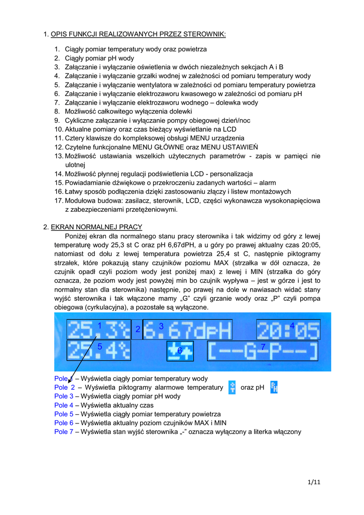 1. OPIS FUNKCJI REALIZOWANYCH PRZEZ STEROWNIK: 1. Ciągły pomiar temperatury wody oraz powietrza 2. Ciągły pomiar pH wody 3. Załączanie i wyłączanie oświetlenia w dwóch niezależnych sekcjach A i B 4. Załączanie i wyłączanie grzałki wodnej w zależności od pomiaru temperatury wody 5. Załączanie i wyłączanie wentylatora w zależności od pomiaru temperatury powietrza 6. Załączanie i wyłączanie elektrozaworu kwasowego w zależności od pomiaru pH 7. Załączanie i wyłączanie elektrozaworu wodnego – dolewka wody 8. Możliwość całkowitego wyłączenia dolewki 9. Cykliczne załączanie i wyłączanie pompy obiegowej dzień/noc 10. Aktualne pomiary oraz czas bieżący wyświetlanie na LCD 11. Cztery klawisze do kompleksowej obsługi MENU urządzenia 12. Czytelne funkcjonalne MENU GŁÓWNE oraz MENU USTAWIEŃ 13. Możliwość ustawiania wszelkich użytecznych parametrów - zapis w pamięci nie ulotnej 14. Możliwość płynnej regulacji podświetlenia LCD - personalizacja 15. Powiadamianie dźwiękowe o przekroczeniu zadanych wartości – alarm 16. Łatwy sposób podłączenia dzięki zastosowaniu złączy i listew montażowych 17. Modułowa budowa: zasilacz, sterownik, LCD, części wykonawcza wysokonapięciowa z zabezpieczeniami przetężeniowymi. 2. EKRAN NORMALNEJ PRACY Poniżej ekran dla normalnego stanu pracy sterownika i tak widzimy od góry z lewej temperaturę wody 25,3 st C oraz pH 6,67dPH, a u góry po prawej aktualny czas 20:05, natomiast od dołu z lewej temperatura powietrza 25,4 st C, następnie piktogramy strzałek, które pokazują stany czujników poziomu MAX (strzałka w dół oznacza, że czujnik opadł czyli poziom wody jest poniżej max) z lewej i MIN (strzałka do góry oznacza, że poziom wody jest powyżej min bo czujnik wypływa – jest w górze i jest to normalny stan dla sterownika) następnie, po prawej na dole w nawiasach widać stany wyjść sterownika i tak włączone mamy „G” czyli grzanie wody oraz „P” czyli pompa obiegowa (cyrkulacyjna), a pozostałe są wyłączone. 1 5 2 4 3 6 7 Pole 1 – Wyświetla ciągły pomiar temperatury wody Pole 2 – Wyświetla piktogramy alarmowe temperatury oraz pH Pole 3 – Wyświetla ciągły pomiar pH wody Pole 4 – Wyświetla aktualny czas Pole 5 – Wyświetla ciągły pomiar temperatury powietrza Pole 6 – Wyświetla aktualny poziom czujników MAX i MIN Pole 7 – Wyświetla stan wyjść sterownika „-” oznacza wyłączony a literka włączony 1/11 3. OPIS STANÓW WYJŚĆ Poniżej ekran w sytuacji kiedy wszystkie wyjścia są włączone i występuje na nich napięcie 230V. Literki oznaczają wyjścia sterownika: A – Wyjście dla oświetlenia A B – Wyjście dla oświetlenia B G – Wyjście dla grzałki wodnej W – Wyjście dla wentylatora chłodzącego P – Wyjście dla pompy cyrkulacyjnej K – Wyjście dla elektrozaworu kwasu D – Wyjście dla elektrozaworu wody „-” oznacza wyłączony a dowolna literka „X” włączony 3.1. WSZYSTKIE WYJŚCIA WYŁĄCZONE Stan w którym wszystkie wyjścia są wyłączone czyli brak jest napięcia sterującego urządzeniami 230V. 3.2. OPIS WYJŚĆ URZĄDZENIA: 1. Kanał A i B – OŚWIETLENIE załączane i wyłączane timerem (zegar czasu rzeczywistego podtrzymany bateryjnie 3V, działa nawet po wyłączeniu zasilania i nie gubi godziny) ustawianym w trybie dzień – włączony, noc - wyłączony, - zasilanie 230V, maksymalna moc 1000W na każdy z kanałów. 2. Kanał G – GRZANIE załączane i wyłączane w zależności od pomiaru temperatury, jeśli temperatura mierzona przez czujnik wody jest niższa niż ustawiona w pamięci urządzenia Tmin, to grzałka automatycznie jest włączana i grzeje do wartości średniej ustawionej przedziału np.: Tmin=26, Tmax=28 to Tśr= 27, - zasilanie 230V, maksymalna moc (300W) zależna od oświetlenia A i B. Kanały A, B, G zasilane są poprzez bezpiecznik 10A dla 230V to około 2300W dla wszystkich kanałów, i tak jeśli na kanały A i B przeznaczymy po 1000W to 2*1000=2000W czyli na grzałkę zostanie 300W, jeśli na kanały A i B przeznaczymy po 900 W to na grzałkę zostanie 500W, należy tak dobierać moc urządzeń, aby nie przekraczała dopuszczalnej mocy 2300W. 2/11 3. Kanał W – WENTYLATOR załączany wtedy, gdy temperatura mierzona przez czujnik powietrza jest wyższa niż ustawiona w pamięci urządzenia Tmax i schładza do wartości średniej ustawionej przedziału np.: Tmin=26, Tmax=28 to Tśr= 27, - zasilanie 230V, max moc 200W. 4. Kanał P – POMPA załączana i wyłączana cyklicznie od 0-99minut, niezależne ustawienie czasu włączenia oraz ustawienie czasu wyłączenia. Praca w trybach dzień/noc oddzielnie ustawiane i zapisywane do pamięci urządzenia. Cykle pompy uruchamiane są automatycznie przy pierwszym włączeniu i trwają nieprzerwanie ze zmianą w godzinach dzień/noc, - zasilanie 230V , max moc 200W. 5. Kanał K – KWAS załącza elektrozawór kwasu, który grawitacyjnie spływa do pojemnika mieszającego, jeśli pomiar pH jest wyższy od PHmax ustawionego w pamięci urządzenia to elektrozawór jest otwierany jeśli PH zmaleje do PHmin ustawionego w pamięci urządzenia to elektrozawór jest zamykany, - zasilanie 230V , max moc 200W. 6. Kanał D – DOLEWKA załącza i wyłącza elektrozawór wody która grawitacyjnie spływa do zbiornika mieszającego wyrównując poziom w przypadku, gdy jest zbyt niski. Sposób działania jest taki, że jeśli poziom wody spadnie poniżej minimum, które jest wykrywane przez czujnik poziomu cieczy MIN to automatycznie elektrozawór jest otwierany, gdy czujnik poziomu MAX wykryje, że poziom został wyrównany do maksymalnego elektrozawór jest zamykany, - zasilanie 230V , max moc 200W. 4. OPIS MENU Menu urządzenia składa się z dwóch podmenu Menu głównego i Menu ustawień. 4.1. Menu główne zawiera następujące elementy: - pierwsza pozycja menu głównego to „Oświetlenie A” po naciśnięciu przycisku OK. nas