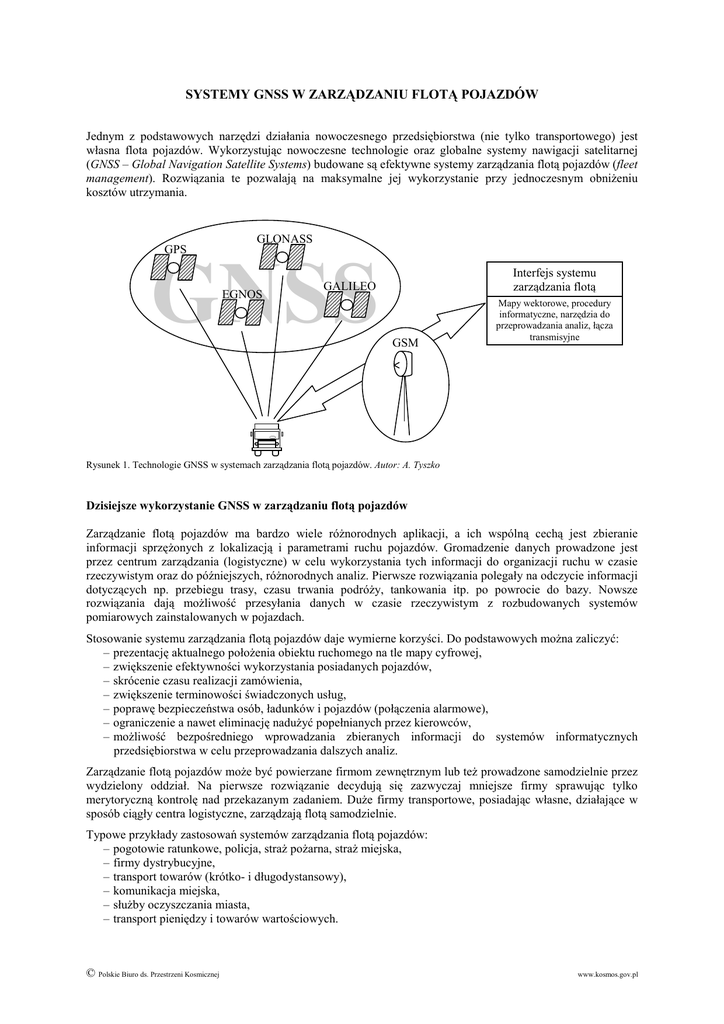 SYSTEMY GNSS W ZARZĄDZANIU FLOTĄ POJAZDÓW Jednym z podstawowych narzędzi działania nowoczesnego przedsiębiorstwa (nie tylko transportowego) jest własna flota pojazdów. Wykorzystując nowoczesne technologie oraz globalne systemy nawigacji satelitarnej (GNSS – Global Navigation Satellite Systems) budowane są efektywne systemy zarządzania flotą pojazdów (fleet management). Rozwiązania te pozwalają na maksymalne jej wykorzystanie przy jednoczesnym obniŜeniu kosztów utrzymania. GPS GLONASS GNSS EGNOS Interfejs systemu zarządzania flotą GALILEO GSM Mapy wektorowe, procedury informatyczne, narzędzia do przeprowadzania analiz, łącza transmisyjne Rysunek 1. Technologie GNSS w systemach zarządzania flotą pojazdów. Autor: A. Tyszko Dzisiejsze wykorzystanie GNSS w zarządzaniu flotą pojazdów Zarządzanie flotą pojazdów ma bardzo wiele róŜnorodnych aplikacji, a ich wspólną cechą jest zbieranie informacji sprzęŜonych z lokalizacją i parametrami ruchu pojazdów. Gromadzenie danych prowadzone jest przez centrum zarządzania (logistyczne) w celu wykorzystania tych informacji do organizacji ruchu w czasie rzeczywistym oraz do późniejszych, róŜnorodnych analiz. Pierwsze rozwiązania polegały na odczycie informacji dotyczących np. przebiegu trasy, czasu trwania podróŜy, tankowania itp. po powrocie do bazy. Nowsze rozwiązania dają moŜliwość przesyłania danych w czasie rzeczywistym z rozbudowanych systemów pomiarowych zainstalowanych w pojazdach. Stosowanie systemu zarządzania flotą pojazdów daje wymierne korzyści. Do podstawowych moŜna zaliczyć: – prezentację aktualnego połoŜenia obiektu ruchomego na tle mapy cyfrowej, – zwiększenie efektywności wykorzystania posiadanych pojazdów, – skrócenie czasu realizacji zamówienia, – zwiększenie terminowości świadczonych usług, – poprawę bezpieczeństwa osób, ładunków i pojazdów (połączenia alarmowe), – ograniczenie a nawet eliminację naduŜyć popełnianych przez kierowców, – moŜliwość bezpośredniego wprowadzania zbieranych informacji do systemów informatycznych przedsiębiorstwa w celu przeprowadzania dalszych analiz. Zarządzanie flotą pojazdów moŜe być powierzane firmom zewnętrznym lub teŜ prowadzone samodzielnie przez wydzielony oddział. Na pierwsze rozwiązanie decydują się zazwyczaj mniejsze firmy sprawując tylko merytoryczną kontrolę nad przekazanym zadaniem. DuŜe firmy transportowe, posiadając własne, działające w sposób ciągły centra logistyczne, zarządzają flotą samodzielnie. Typowe przykłady zastosowań systemów zarządzania flotą pojazdów: – pogotowie ratunkowe, policja, straŜ poŜarna, straŜ miejska, – firmy dystrybucyjne, – transport towarów (krótko- i długodystansowy), – komunikacja miejska, – słuŜby oczyszczania miasta, – transport pieniędzy i towarów wartościowych. © Polskie Biuro ds. Przestrzeni Kosmicznej www.kosmos.gov.pl Nowoczesny monitoring floty pojazdów z wykorzystaniem GNSS nie ogranicza się tylko do biernego śledzenia pozycji pojazdu i jego ochrony przed kradzieŜą. Dzisiejsze rozwiązania pozwalają weryfikować wydajność i czas pracy kierowców, określać spalanie paliwa, prowadzić nawigację, wyznaczać dystans do najbliŜszej stacji tankowania. Zasadniczym narzędziem wykorzystywanym w systemach zarządzania flotą jest amerykański system Navigation Satellite Timing and Ranging Global Positioning System w skrócie nazywany NAVSTAR GPS lub po prostu GPS. System ten składa się z trzech ściśle powiązanych ze sobą segmentów: kosmicznego, naziemnego – kontroli i uŜytkownika. Pierwszy z nich – segment kosmiczny utoŜsamiany jest ze standardową konstelacją 30 aktywnych obecnie satelitów umieszczonych na orbitach okołoziemskich na wysokości około 20 180 km. KaŜda z sześciu orbit, po której poruszają się satelity, jest nachylona do płaszczyzny równika pod kątem około 55°. Kąt dwuścienny między sąsiednimi orbitami wynosi 60°. Po kaŜdej orbicie poruszają się cztery lub pięć satelitów. Równomierne rozłoŜenie satelitów na stałych orbitach kołowych zapewnia dostęp do sygnałów co najmniej czterech z nich w kaŜdej chwili i z kaŜdego miejsca na powierzchni Ziemi. Drugi z omawianych segmentów – segment kontroli spełnia rolę nadzorująco-kontrolującą a zarazem wspierającą pracę systemu. Polega to na ciągłym monitoringu i odbiorze przez naziemne stacje sygnałów z satelitów, sprawdzaniu poprawności działania satelitów, jak równieŜ komunikowaniem się ze stacją główną znajdującą się w Bazie Sił Powietrznych USA Falcon Base w Colorado Springs. Segment uŜytkowników składa się z róŜnorodnych wojskowych i cywilnych odbiorników satelitarnych zaprojektowanych w taki sposób, aby odbierać, dekodować i przetwarzać sygnały nadawane z satelitów. Są to odbiorniki funkcjonujące samodzielnie lub zintegrowane z innymi systemami. Ze względu na przeznaczenie i sposób wykorzystania, odbiorniki GPS róŜnią się cechami uŜytkowymi dotyczącymi wymagań środowiska, w którym mają działać, moŜliwościami pomiarowymi na róŜnych obiektach, w tym takŜe ruchomych, odpornością na zakłócenia itd. Dokładności sytemu GPS dla pozycji autonomicznej wynoszą około 10 metrów. Odbiorniki odbierające korekty z satelitarnych systemów wspomagających lub naziemnych stacji referencyjnych mogą wyznaczać swoje połoŜenie z dokładnością rzędu kilku metrów. NaleŜy jednak zaznaczyć, Ŝe dokładność wyznaczanej pozycji zaleŜna jest od wielu parametrów i moŜe ulegać zmianie. Rosyjski system satelitarny GLONASS (Globalnaja Nawigacjonnaja Sputnikowa Sistema) stanowi funkcjonalny odpowiednik wyŜej omawianego amerykańskiego systemu GPS. Segment kosmiczny stanowi obecnie konstelacja 12 aktywnych satelitów (docelowo 24 satelitów) rozmieszczonych na trzech orbitach kołowych. Średnia wysokość satelity wynosi 19 100 km. 