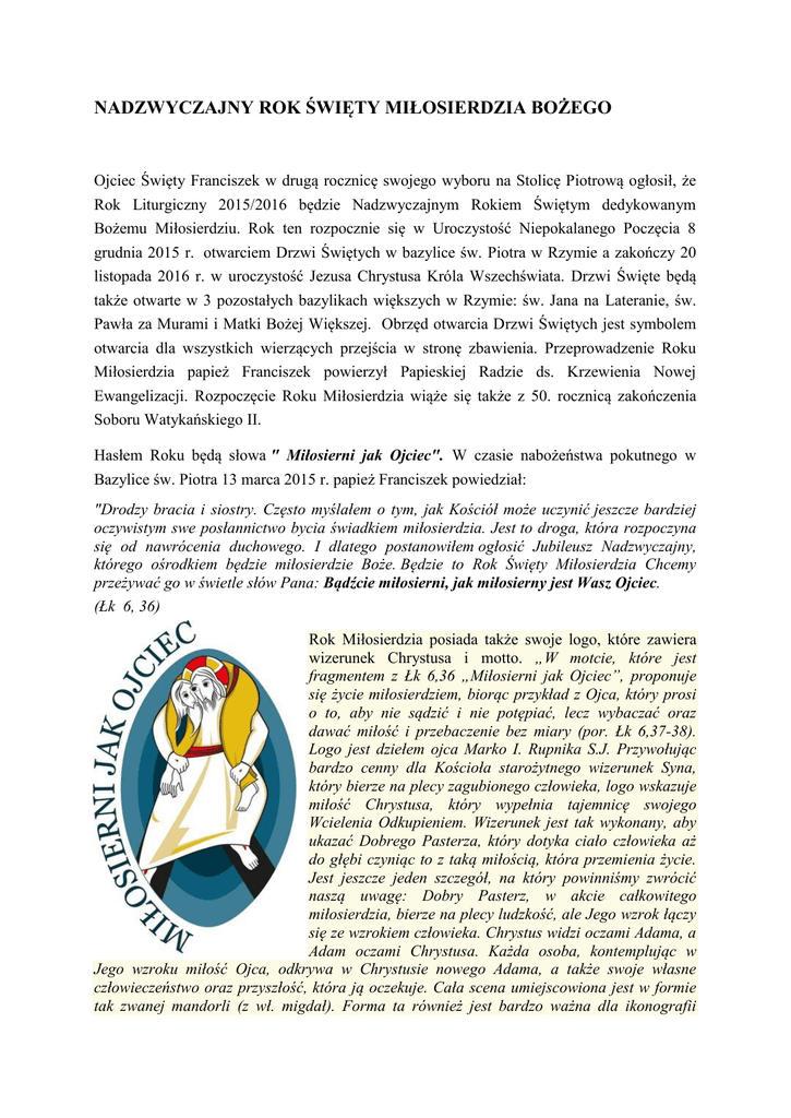 NADZWYCZAJNY ROK ŚWIĘTY MIŁOSIERDZIA BOŻEGO Ojciec Święty Franciszek w drugą rocznicę swojego wyboru na Stolicę Piotrową ogłosił, że Rok Liturgiczny 2015/2016 będzie Nadzwyczajnym Rokiem Świętym dedykowanym Bożemu Miłosierdziu. Rok ten rozpocznie się w Uroczystość Niepokalanego Poczęcia 8 grudnia 2015 r. otwarciem Drzwi Świętych w bazylice św. Piotra w Rzymie a zakończy 20 listopada 2016 r. w uroczystość Jezusa Chrystusa Króla Wszechświata. Drzwi Święte będą także otwarte w 3 pozostałych bazylikach większych w Rzymie: św. Jana na Lateranie, św. Pawła za Murami i Matki Bożej Większej. Obrzęd otwarcia Drzwi Świętych jest symbolem otwarcia dla wszystkich wierzących przejścia w stronę zbawienia. Przeprowadzenie Roku Miłosierdzia papież Franciszek powierzył Papieskiej Radzie ds. Krzewienia Nowej Ewangelizacji. Rozpoczęcie Roku Miłosierdzia wiąże się także z 50. rocznicą zakończenia Soboru Watykańskiego II. Hasłem Roku będą słowa " Miłosierni jak Ojciec". W czasie nabożeństwa pokutnego w Bazylice św. Piotra 13 marca 2015 r. papież Franciszek powiedział: "Drodzy bracia i siostry. Często myślałem o tym, jak Kościół może uczynić jeszcze bardziej oczywistym swe posłannictwo bycia świadkiem miłosierdzia. Jest to droga, która rozpoczyna się od nawrócenia duchowego. I dlatego postanowiłem ogłosić Jubileusz Nadzwyczajny, którego ośrodkiem będzie miłosierdzie Boże. Będzie to Rok Święty Miłosierdzia Chcemy przeżywać go w świetle słów Pana: Bądźcie miłosierni, jak miłosierny jest Wasz Ojciec. (Łk 6, 36) Rok Miłosierdzia posiada także swoje logo, które zawiera wizerunek Chrystusa i motto. „W motcie, które jest fragmentem z Łk 6,36 „Miłosierni jak Ojciec”, proponuje się życie miłosierdziem, biorąc przykład z Ojca, który prosi o to, aby nie sądzić i nie potępiać, lecz wybaczać oraz dawać miłość i przebaczenie bez miary (por. Łk 6,37-38). Logo jest dziełem ojca Marko I. Rupnika S.J. Przywołując bardzo cenny dla Kościoła starożytnego wizerunek Syna, który bierze na plecy zagubionego człowieka, logo wskazuje miłość Chrystusa, który wypełnia tajemnicę swojego Wcielenia Odkupieniem. Wizerunek jest tak wykonany, aby ukazać Dobrego Pasterza, który dotyka ciało człowieka aż do głębi czyniąc to z taką miłością, która przemienia życie. Jest jeszcze jeden szczegół, na który powinniśmy zwrócić naszą uwagę: Dobry Pasterz, w akcie całkowitego miłosierdzia, bierze na plecy ludzkość, ale Jego wzrok łączy się ze wzrokiem człowieka. Chrystus widzi oczami Adama, a Adam oczami Chrystusa. Każda osoba, kontemplując w Jego wzroku miłość Ojca, odkrywa w Chrystusie nowego Adama, a także swoje własne człowieczeństwo oraz przyszłość, która ją oczekuje. Cała scena umiejscowiona jest w formie tak zwanej mandorli (z wł. migdał). Forma ta również jest bardzo ważna dla ikonografii starożytnej i średniowiecznej, gdyż odwołuje się do obecności dwóch natur: boskiej i ludzkiej, w Chrystusie. Trzy koncentryczne kształty owalne o kolorze stopniowo jaśniejszym w kierunku zewnętrznym sugerują ruch Chrystusa, który wyciąga człowieka z nocy grzechu i śmierci. Z drugiej strony, głębia ciemniejszego koloru sugeruje również niepoznawalność miłości Ojca, który wszystko przebacza.” (cytat z artykułu zamieszczonego w Gościu Niedzielnym) Z okazji Roku Miłosierdzia powstał specjalny Hymn Jubileuszu Miłosierdzia, którego Kompozytorem jest Paul Inwood, diecezjalny koordynator do spraw liturgii i muzyki w brytyjskiej diecezji Portsmouth. Tekst jest autorstwa o. Eugenio Costa, włoskiego jezuity pracujący w Kurii Generalnej Towarzystwa Jezusowego. Hymn został zaprezentowany w Watykanie 5 sierpnia. Jest on formą litanii. Refren jest w języku łacińskim i nawiązuje do wersetu z Ewangelii św. Łukasza „Bądźcie miłosierni jak Ojciec Wasz jest miłosierny” (Łk 6, 36). Zwrotki hymnu zostały przetłumaczone różne języki. Hymn Roku Miłosierdzia został nagrany przez chór Kaplicy Sykstyńskiej pod dyrekcją salezjanina ks. Massimo Palombelli przy współpracy z Radiem Watykańskim. W trakcie prezentacji hymnu autor teksu powiedział: „Pierwsza zwrotka jest poświęcona Bogu Ojcu, druga Synowi Bożemu, trzecia Duchowi Świętemu, a czwarta powtarza wszystkie te tematy. Razem z kompozytorem cieszymy się, że ta pieśń przyczyni się do zrozumienia tajemnicy miłosierdzia. Miłosierdzie to sprawa fundamentalna, bardzo szeroka, której Papież Franciszek poświęca tak wiele uwagi. Celem śpiewu liturgicznego jest pomoc w zrozumieniu tego, w czym się uczestniczy. Ten hymn może być wykorzystywany np. podczas dłuższej procesji wejścia.” Z okazji Roku Miłosierdzia Ojciec Święty wydał specjalny dokument, Bullę Misericordiae vultus. Ceremonia ogłoszenia dokumentu odbyła się w Niedzielę Miłosierdzia Bożego 11 kwietnia w podczas Pierwszych Nieszporów Niedzieli Miłosierdzia Bożego w bazylice watykańskiej. Bulla została uroczyście odczytana w trzech pozostałych papieskich bazylikach Rzymu. Te cztery świątynie będą głównymi miejscami obchodów Roku Świętego. Papież Franciszek w wygłoszonej podczas nieszporów homilii wskazał, że celem tego wyjątkowego czasu jakim jest Rok Miłosierdzia ma być spotkanie z Jezusem i doświadczenie Jego wielkiego miłosierdzia. Obchody Roku Jubileuszowego ojciec święty zawierzył Matce Bożej. W czasie tego spotkania przekazał przedstawicielom Kościoła na całym świecie egzemplarze bulli „Misericordiae vultus”. Otrzymali ją czterej kardynałowie archiprezbiterzy rzymskich bazylik większych, kardynałowie prefekci trzech kongregacji watykańskich oraz pochodzący z różnych stron świata biskupi, będący przedstawicielami swych kontynentów i katolickich Kościołów wschodnich. Ogłaszanie Roku Świętego nawiązuje do czasów biblijnych. Izraelici 