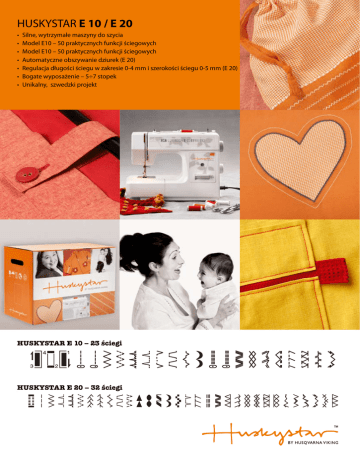 HUSKYSTAR E 10 / E 20 • Silne, wytrzymałe maszyny do szycia • Model E10 – 50 praktycznych funkcji ściegowych • Model E10 – 50 praktycznych funkcji ściegowych • Automatyczne obszywanie dziurek (E 20) • Regulacja długości ściegu w zakresie 0-4 mm i szerokości ściegu 0-5 mm (E 20) • Bogate wyposażenie – 5÷7 stopek • Unikalny, szwedzki projekt Stitches H U S K Y S TA R C10 Hu s k y s t a r C10 c r e a t e s 15 0 s t i t c h f u n c t i o n s . H U S K Y S TA R C 2 0 Hu s k y s t a r C 2 0 c r e a t e s 2 5 0 s t i t c h f u n c t i o n s . H U S K Y S TA R E10 HUSKYSTAR E c10 Hu s k y s t a r E10 r e– a t23 e s ściegi 50 st it ch f u nct ion s. H U S K Y S TA R E 2 0 HUSKYSTAR Hu s k y s t a r E 2E 0 20 c r e– a t32 e s ściegi 70 s t i t c h f u n c t i o n s . H U S K Y S T A R E 20 Łatwość obsługi , bogactwo funkcji – Huskystar E10/E20 Doskonałe maszyny dla początkujących, z szerokim i proste obszywanie dziurek automatyczne lub w 4 etapach zakresem ściegów i funkcji. Mocne i wytrzymałe, bez obracania materiału. Regulowana długość ściegu zapewnią przyjemność szycia przez długie lata. w zakresie 0 – 4 mm oraz szerokość 0-5 mm (E 20). W wyposażeniu wszystkie niezbędne akcesoria do Regulowany docisk stopki zapewnia doskonały rezultat rozpoczęcia szycia – 5 lub 7 stopek, igły, szpulki, szycia. pokrowiec itp. UNIKALNY, SZWEDZKI PROJEKT. PIĘKNE ŚCIEGI, BOGACTWO FUNKCJI. Atrakcyjny wygląd zewnętrzny maszyny oraz jej budowa 50 lub 70 praktycznych funkcji ściegowych, w tym ściegi i funkcje zaprojektowane zostały w Szwecji . użytkowe, dekoracyjne, do materiałów elastycznych w w w.husqvar na-vik ing.pl