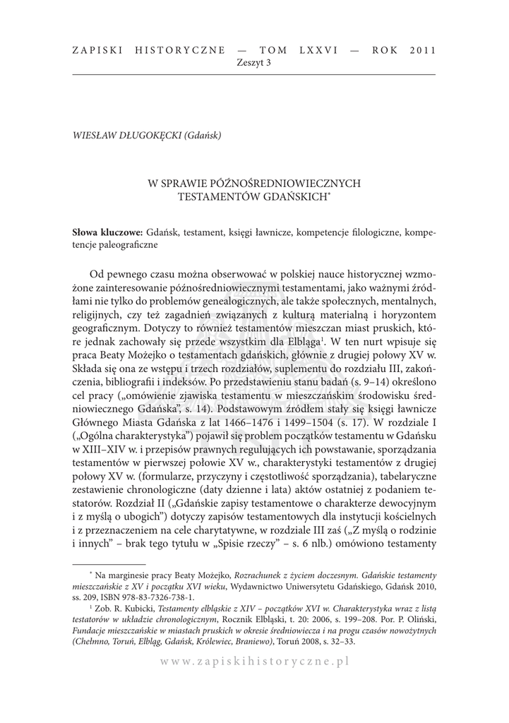 ZAPISKI HISTORYCZNE — TOM Zeszyt 3 LXXVI — ROK 2011 WIESŁAW DŁUGOKĘCKI (Gdańsk) W SPRAWIE PÓŹNOŚREDNIOWIECZNYCH TESTAMENTÓW GDAŃSKICH* Słowa kluczowe: Gdańsk, testament, księgi ławnicze, kompetencje filologiczne, kompetencje paleograficzne Od pewnego czasu można obserwować w polskiej nauce historycznej wzmożone zainteresowanie późnośredniowiecznymi testamentami, jako ważnymi źródłami nie tylko do problemów genealogicznych, ale także społecznych, mentalnych, religijnych, czy też zagadnień związanych z kulturą materialną i horyzontem geograficznym. Dotyczy to również testamentów mieszczan miast pruskich, które jednak zachowały się przede wszystkim dla Elbląga1. W ten nurt wpisuje się praca Beaty Możejko o testamentach gdańskich, głównie z drugiej połowy XV w. Składa się ona ze wstępu i trzech rozdziałów, suplementu do rozdziału III, zakończenia, bibliografii i indeksów. Po przedstawieniu stanu badań (s. 9–14) określono cel pracy („omówienie zjawiska testamentu w mieszczańskim środowisku średniowiecznego Gdańska”, s. 14). Podstawowym źródłem stały się księgi ławnicze Głównego Miasta Gdańska z lat 1466–1476 i 1499–1504 (s. 17). W rozdziale I („Ogólna charakterystyka”) pojawił się problem początków testamentu w Gdańsku w XIII–XIV w. i przepisów prawnych regulujących ich powstawanie, sporządzania testamentów w pierwszej połowie XV w., charakterystyki testamentów z drugiej połowy XV w. (formularze, przyczyny i częstotliwość sporządzania), tabelaryczne zestawienie chronologiczne (daty dzienne i lata) aktów ostatniej z podaniem testatorów. Rozdział II („Gdańskie zapisy testamentowe o charakterze dewocyjnym i z myślą o ubogich”) dotyczy zapisów testamentowych dla instytucji kościelnych i z przeznaczeniem na cele charytatywne, w rozdziale III zaś („Z myślą o rodzinie i innych” – brak tego tytułu w „Spisie rzeczy” – s. 6 nlb.) omówiono testamenty * Na marginesie pracy Beaty Możejko, Rozrachunek z życiem doczesnym. Gdańskie testamenty mieszczańskie z XV i początku XVI wieku, Wydawnictwo Uniwersytetu Gdańskiego, Gdańsk 2010, ss. 209, ISBN 978-83-7326-738-1. 1 Zob. R. Kubicki, Testamenty elbląskie z XIV – początków XVI w. Charakterystyka wraz z listą testatorów w układzie chronologicznym, Rocznik Elbląski, t. 20: 2006, s. 199–208. Por. P. Oliński, Fundacje mieszczańskie w miastach pruskich w okresie średniowiecza i na progu czasów nowożytnych (Chełmno, Toruń, Elbląg, Gdańsk, Królewiec, Braniewo), Toruń 2008, s. 32–33. w w w. z a p i s k i h i s t o r y c z n e . p l 116 Wiesław Długokęcki [458] wzajemne, zapisy dla spadkobierców z kręgu rodziny, innych osób, czy też wyliczające geradę. Z kolei „Suplement do rozdziału III” dotyczy testamentu Henryka Eggerda, Ottona Angermünde i Mikołaja Schwichtenberga2. Przedstawienie stanu badań jest w zasadzie oderwane od głównego tematu. Powinno się ono koncentrować na literaturze „testamentowej”, która dotyczy miast strefy hanzeatyckiej, do której przecież w tym okresie Gdańsk należał. Jest ona już stosunkowo bogata. Tymczasem wymieniono tylko rozprawę Birgitt Noodt o religii i rodzinie w Lubece w świetle testamentów jej mieszkańców3 oraz kilka innych prac. Brak też wyraźnych śladów inspiracji przywołaną literaturą w analitycznej części pracy. Gdy autorka stwierdza, że w źródłach gdańskich z pierwszej połowy brak większej liczby informacji o testamentach „i w tym wypadku ogólny obraz nie odbiega od danych z innych ośrodków” (s. 28 i przyp. 41), to zaskakuje pominięcie wydawnictw źródłowych dla XIV w., w których wzmianki o testamentach już można znaleźć4. Przez analogię z Lubeką i Elblągiem początków testamentów w Gdańsku autorka dopatruje się już w pierwszej połowie XIV, a nawet w końcu XIII w. (s. 21). Na podstawie postanowienia komtura krzyżackiego w Gdańsku z 5 III 1363 r. w jednej z kwestii spornych między radą głównomiejską o proboszczem kościoła Mariackiego konkluduje, że „rajcy nie respektowali zapisów testamentowych na rzecz tego kościoła. Na tej podstawie można przyjąć, że takie zapisy już od dłuższego czasu były znane w Gdańsku i traktowano je jako coś oczywistego” (s. 22). Jednak wniosek ten nie jest taki oczywisty, ponieważ mogło chodzić nie o wykonywanie testamentów, ale uniemożliwianie ich spisywania, gdy zawierały zapisy dla proboszcza lub fary5. Na poparcie tezy o upowszechnieniu się pisemnego testamentu już w pierwszej połowie XIV w. autorka omawia testament z 24 VIII 1365 r. księdza Mikołaja Schonze, który „czynił testament, za zgodą swych krewnych Petera Swydenicz i Juty. Na wypadek śmierci spadkobiercami miały być ich dzieci, z których każde miało otrzymać po 100 grz. Zapis o charakterze dewocyjnym dotyczył mszy za jego duszę, na ten cel przeznaczył 10 grz. z tytułu należnej mu renty” (s. 22–23)6. 2 Dwa ostatnie zostały opublikowane: P. Simson, Das Testament des Danziger Schöffen und Ratsherrn Otto Angermünde von 1492, Mitteilungen des Westpreussischen Geschichtsvereins (dalej cyt. MWG), Jg. 14: 1915, H. 3, s. 42–48; H. Haßbargen, Das Testament des Danziger Offizials Nicolaus Schwichtenberg, ibid., Jg. 25: 1926, H. 4, s. 78–94. Ponadto wykorzystano kilka testamentów wydanych w różnej formie przez Gotthilfa Löschina w: Beiträge zur Geschichte Danzigs und seiner Umgebungen, H. 1, Danzig 1837. 3 B. Noodt, Religion und Familie in der Hansestadt Lübeck anhand der Bürgertestamente des 14. Jahrhunderts, Lübeck 2000. 4 Liber scabinorum Veteris Civitatis Thoruniensis 1363–1428, wyd. K. Kaczmarczyk, Toruń 1936; Das Elbinger Stadtbuch, Bd. 1–2, hrsg. v. H. Hoppe, Osnabrück 1976–1986. 5 P. Simson, Geschichte der Stadt Danzig, Bd. IV, Danzig 1918, nr 90: „Daz sye [tj. rajcy – W. D.] testamente hinderen. Hir umme dunket uns gut, daz