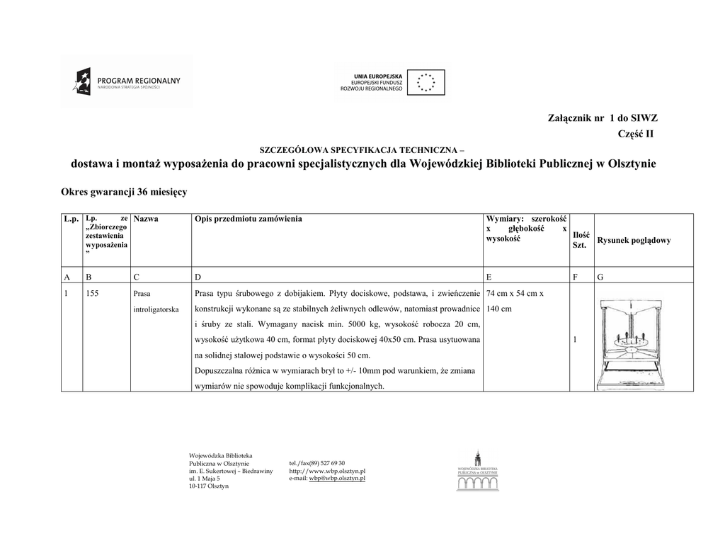 Załącznik nr 1 do SIWZ Część II SZCZEGÓŁOWA SPECYFIKACJA TECHNICZNA – dostawa i montaŜ wyposaŜenia do pracowni specjalistycznych dla Wojewódzkiej Biblioteki Publicznej w Olsztynie Okres gwarancji 36 miesięcy L.p. Lp. ze Nazwa „Zbiorczego zestawienia wyposaŜenia ” Opis przedmiotu zamówienia Wymiary: szerokość x głębokość x Ilość wysokość Rysunek poglądowy Szt. A B C D E 1 155 Prasa Prasa typu śrubowego z dobijakiem. Płyty dociskowe, podstawa, i zwieńczenie 74 cm x 54 cm x introligatorska konstrukcji wykonane są ze stabilnych Ŝeliwnych odlewów, natomiast prowadnice 140 cm F i śruby ze stali. Wymagany nacisk min. 5000 kg, wysokość robocza 20 cm, wysokość uŜytkowa 40 cm, format płyty dociskowej 40x50 cm. Prasa usytuowana na solidnej stalowej podstawie o wysokości 50 cm. Dopuszczalna róŜnica w wymiarach brył to +/- 10mm pod warunkiem, Ŝe zmiana wymiarów nie spowoduje komplikacji funkcjonalnych. Wojewódzka Biblioteka Publiczna w Olsztynie im. E. Sukertowej – Biedrawiny ul. 1 Maja 5 10-117 Olsztyn tel./fax(89) 527 69 30 http://www.wbp.olsztyn.pl e-mail: [email protected] 1 G 2 156 Kauter termostatem z Kauter – podgrzewana szpachla do prac konserwatorskich: malarstwa 15cm x11cm x15 cm sztalugowego i ściennego, kamienia, papieru, pieczęci. Posiadający lekką ergonomiczną wytrzymałą rączkę. Precyzyjna regulacja temperatury w zakresie od 20 do min.200ºC. Zasilanie 230V/50Hz, transformator separujący 40W/24V, moc grzałki min.40W, min. II klasa izolacji. Przystosowany do pracy z wymiennymi 2 końcówkami. WyposaŜony w następujące końcówki: kształt Ŝelazka dł. 50 mm x 1 szt. końcówka tygielek 10 cm³ x 1 szt. • • Dopuszczalna róŜnica w wymiarach brył kautera : +/- 10mm pod warunkiem, Ŝe zmiana wymiarów nie spowoduje komplikacji funkcjonalnych. 3 159 4 Gumka Gumka o napędzie elektrycznym, źródło prądu baterie, z wymiennymi wkładami elektryczna (gumkami). 1 Mikroszlifierka Szlifierka zasilana prądem stałym 12V – 18V o mocy znamionowej min 40W, elektroniczne sterowana prędkość obrotowa w zakresie 5 tys - 20 tys obr/min. 160 Obudowa wykonana z poliamidu wzmocniona włóknem szklanym, posiada uchwyty 3-zaciskowe umoŜliwiające montaŜ narzędzi o trzpieniu od 1-3,2 mm. Wojewódzka Biblioteka Publiczna w Olsztynie im. E. Sukertowej – Biedrawiny ul. 1 Maja 5 10-117 Olsztyn tel./fax(89) 527 69 30 http://www.wbp.olsztyn.pl e-mail: [email protected] 1 5 163 Termohigromet Posiada podwójny wyświetlacz cyfrowy – oddzielnie dla temperatury i r pokojowy wilgotności. Z funkcją zapamiętywania wartości ekstremalnych dla temperatury i wilgotności 1 - pomiar temperatury 0 – 50 stopni - pomiar wilgotności 25 – 95 % 6 169 Stół wyspowy Stół laboratoryjny, stelaŜ wykonany ze skręcanych profili salowych min. 30x30 120cm x150 cm x 90 laboratoryjny mm. cm malowany proszkowo na kolor biały. Blat gr. min. 22 mm. laminowany laminatem z 1 obrzeŜami PCV min. 2 mm. Konstrukcja stołu zapewniająca ewentualny późniejszy montaŜ do niej szafek oraz nadstawek, oraz uzupełnienie mediami (woda, prąd, gaz itp.). Dopuszczalna róŜnica w wymiarach brył to +/- 10mm pod warunkiem, Ŝe zmiana wymiarów nie spowoduje komplikacji funkcjonalnych. 7 243 Stół roboczy Biurko na stelaŜu metalowym z blatem prostokątnym wykonanym z płyty 120cm x70cm x68-82 wyspowy obustronnie laminowanej, grubości 25-28 mm, oklejonej obrzeŜem ABS grubości cm 2 mm w kolorze blatu. Blat wzmocniony prostokątną ramą o przekroju 50-60mm x 25-30mm. Rama łączona z blatem za pomocą śrub wkręcanych w metalowe mufy wklejane w blacie z uŜyciem dystansów pozwalających na uzyskanie dylatacji między ramą a blatem. Krótsze boki ramy wyposaŜone w maskownice umoŜliwiające umieszczenie w środku wkładki z opisem stanowiska. Rama Wojewódzka Biblioteka Publiczna w Olsztynie im. E. Sukertowej – Biedrawiny ul. 1 Maja 5 10-117 Olsztyn tel./fax(89) 527 69 30 http://www.wbp.olsztyn.pl e-mail: [email protected] 2 posiada moŜliwość zwęŜenia rozstawu nóg na głębokości biurka o min 10 cm w porównaniu do pozycji, w której nogi są zlicowane z krawędzią blatu. Rama wsparta na 4 nogach metalowych o przekroju 60-65 x 25-30mm, zapewniających regulację wysokości biurka w zakresie od minimum 70cm do co najmniej 82 cm dzięki moŜliwości wysunięcia nogi z profilu z wewnętrznego i zablokowaniu go w wybranej pozycji z dokładnością co najmniej 20mm. Noga posiada stopki poziomujące o regulacji co najmniej 15mm. Rama i nogi malowane proszkowo na kolor RAL 9006. Wymagane potwierdzenie wytrzymałości stołu w zakresie bezpieczeństwa uŜytkowania według norm PN-EN certyfikatem z wynikiem pozytywnym, wystawionym przez uprawniony do tego organ certyfikujący. 8 224 Stół Stół laboratoryjny, stelaŜ wykonany ze skręcanych profili salowych min. 30x30 45cm x60cm x75 cm laboratoryjny mm. malowany proszkowo na kolor biały. Blat gr. min. 22 mm. laminowany laminatem z obrzeŜami PCV min. 2 mm. Pod blatem szafka laminowana z płyty gr. min. 18 mm. pokryta laminatem i obrzeŜem PCV min. 2 mm. W szafce min. jedna półka gr. min 18 mm. Drzwi w szafce otwierane „na prawo”. Dopuszczalna róŜnica w wymiarach brył to +/- 10mm pod warunkiem, Ŝe zmiana wymiarów nie spowoduje komplikacji funkcjonalnych. Wojewódzka Biblioteka Publiczna w Olsztynie im. E. Sukertowej – Biedrawiny ul. 1 Maja 5 10-117 Olsztyn tel./fax(89) 527 69 30 http://www.wbp.olsztyn.pl e-mail: [email protected] 1 9 170 Stół Blat roboczy wykonany z blachy nierdzewnej z wypełnieniem z płyty z tylnym 160cm x60cm x85 cm warsztatowy ogranicznikiem wysokości min 40 mm, nogi wykonane z blachy nierdzewnej z 1 kształtownika 40x40 mm, stopki z regulacją wysokości min +/- 15 mm, szafki i półki ze stali nierdzewnej. Tolerancja wymiarów +/- 10 mm 10 210 Aerograf z Aerograf do rozpylania farb rozpuszczalnych w wodzie, zasilanie 220-240V 50- kompresorem 60Hz 85W. Wydajność