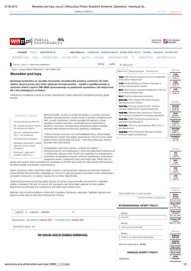 27.06.2012 Menedżer pod lupą. wnp.pl | Oferty pracy Polska, Bezpłatne Szkolenia, Ogłoszenia - Inwestycje Za… Środa, 27 czerw ca 2012 r. FINA NSE ENER GET YKA SZUKAJ W PORTALU PRA CA KONFERENCJE GAZ GÓR NIC T W O INNE S ER W IS Y : H UT NIC T W O Załóż konto S A MO R Z Ą D NAFT A NIER UC H O MO Ś C I C H EMIA BUDOW NIC T W O drukuj w np.pl » praca » najnow sze w iadomości R Y NEK S PO Ż Y W C Z Y w yślij Autor: w np.pl, (Oskar Filipow icz) | 09-11-2006 10:27 Z DR O W IE LOGIST YKA R O LNIC T W O MOT OR YZAC JA W BRANŻY Najnow sze Menedżer pod lupą IT H A NDEL Najpopularniejsze Komentow ane 12:53 Kroll Ontrack powiększa centrum badawczo- Idealnego kandydata na wysokie stanowisko menedżerskie powinny cechować nie tylko wiedza merytoryczna, lecz także zdolności interpersonalne - wynika z opublikowanego w ostatnich dniach raportu TNS OBOP opracowanego na podstawie wywiadów z 50 ekspertami HR z firm działających w Polsce. Podstawowe kwalifikacje prezesa to wyższe wykształcenie i dobra znajomość przynajmniej jednego języka obcego. rozwojowe w Katowicach 11:52 Prezes ZM Silesia: Poziom inwestycji w branży mięsnej będzie spadał 08:51 Resort pracy oczekuje dodatkowych 500 mln zł na walkę z bezrobociem 20:53 Wto PiS: uchwalić Narodowy Program 19:37 Wto Kluby za uszczelnieniem systemu wsparcia zatrudnienia niepełnosprawnych Pozorna aktywizacja emerytów PiS: uchwalić Narodowy Program Zatrudnienia dla młodych 78,6 proc. absolwentów AGH z 2011 r. ma zatrudnienie Jaki podatek płaci menedżer? Budowlańcy poszukiwani - analiza ogłoszeń o pracę z branży budowlanej Kierunek studiów nie jest już jednak decydujący w procesie rekrutacji. Menedżer uzupełnia bowiem zwykle wiedzę na studiach podyplomowych MBA, kursach i szkoleniach. Jednak specjaliści HR zapytani o studia kształcące przyszłych prezesów, wymieniają kierunki ekonomiczne, handlowe oraz prawo. Na stanowisku wiceprezesa chętnie widzieliby natomiast także absolwenta kierunku marketing i zarządzanie. - Dobry menedżer powinien znać profil działalności firmy, którą zarządza. Ważniejsza jest jednak chęć stałego doskonalenia. Powinna to być osoba głodna wiedzy, nieprzestająca się uczyć - mówi Ewa Adamczyk, dyrektor generalny NAJ International. 19:24 Wto Szefowie Axa, Siemensa i Telecom Italia apelują o wspieranie inwestycji prywatnych 16:40 Wto PAIiIZ: Polskie firmy powinny się zainteresować Meksykiem 16:10 Wto 78,6 proc. absolwentów AGH z 2011 r. ma zatrudnienie 12:46 Wto Resort finansów obiecuje korzystne zmiany w ulgach podatkowych W zarządzaniu nadal rośnie rola tzw. umiejętności miękkich (interpersonalnych, komunikacyjnych), które pozwalają lepiej funkcjonować Rynki pracy - gdzie warto w społeczności, jaką jest firma. Wśród cech idealnego top managementu zarabiać w 2010? (cd.) wymieniane są najczęściej charyzma, zdolności negocjacyjne, przywódcze, zarządzanie czasem, umiejętność pracy pod presją czasu. Młody wiek nie zawsze jest atutem. Starsi menedżerowie postrzegani są bowiem jako osoby nie tylko bardziej doświadczone, ale także dojrzałe emocjonalnie i zrównoważone. acebooku 0 WIG20 0.16% 2255.87 WIG 0.20% 40429.15 MWIG40 0.20% 2281.14 SWIG80 0.08% 9486.11 NCINDEX 0.52% 36.46 LPG -1 gr 2.81 zł Surowce, towary OGŁ OSZENIA I KAT ALOGI Zaw ód ZAWÓD Czytaj w ięcej: zatrudnienie » zam ów alert | m enedżerow ie » zam ów alert Branża KOMENT ARZE (0) Giełda E98 -1 gr 5.96 zł W YS ZUKI W ARKA OFERT P RACY w np.pl na CHF -0.14% 3.55 zł E95 -2 gr 5.79 zł WYBIERZ RODZAJ OGŁOSZENIA 0 USD -0.05% 3.41 zł ON -3 gr 5.69 zł Znajomością przynajmniej jednego języka obcego nie zawsze mogą pochwalić się prezesi firm z kapitałem polskim i mieszanym. Nie jest też ona od nich wymagana, gdy firma działa wyłącznie na rynku polskim. Respondenci ocenili także top management pod kątem jego efektywności. Lubię to! EUR -0.15% 4.26 zł Paliwa Raport prezentuje także rozbieżności między modelem a rzeczywistością. Zastrzeżenia niektórych badanych budzą zdolności interpersonalne zarządzających. Dotyczy to głównie sposobu komunikacji i braku opanowania w sytuacjach stresowych, co wpływa negatywnie na relacje międzyludzkie. Najniższe noty otrzymywali głównie prezesi firm z kapitałem mieszanym, najwyższe z kapitałem zagranicznym. Badanie zostało zlecone przez NAJ International i Forbesa. Waluty 05:41 Pozorna aktywizacja emerytów Zatrudnienia dla młodych ZOBACZ TAKŻE Zaloguj się Ropa Brent -0.12% 90.34 USD Ropa WTI 0.6% 79.36 USD Ropa Ural -0.49% 87.14 USD Węgiel RB 1.52% 88.07 USD WSZYSTKIE KATEGORIE NIE NIE DODA DODANO NO JJESZ ESZCZ CZEE ŻŻAADNEGO DNEGO KOM KOMENT ENTAARZ RZAA Region OFERTY ZE WSZYSTKICH REGIONÓW Aktualna liczba ofert: 38 822 Więcej WĘGIEL KW SA WĘGIEL KHW SA Materiały budowlane GORĄCE OFERTY P RACY Ustawiacz www.praca.wnp.pl/menedzer-pod-lupa,16680_1_0_0.php Ceny stali GPW Futures 1/2 27.06.2012 Menedżer pod lupą. wnp.pl | Oferty pracy Polska, Bezpłatne Szkolenia, Ogłoszenia - Inwestycje Za… GRUPA KAN Inżynier wiodący ds. systemów sterowania HRK Energy GPW A kcje NEW CONNECT Inżynier Serwisu Yellow Heads Polska Sp. z o.o. Inżynier Serwisu Yellow Heads Polska Sp. z o.o. Inżynier Serwisu Yellow Heads Polska Sp. z o.o. Inżynier Serwisu Yellow Heads Polska Sp. z o.o. DODAJ OGŁOS ZENI E Reklama Miejsce na Twoją reklamę! Kliknij! AdTaily.pl FORUM W NP .P L WYBIERZ SERWIS Komorowski liderem rankingu zaufania; Palikot nieufności jack: POdoba mi się ta zaćma POlityczna "ankietowanych"? Wam już... Wciąż nie wiadomo, kiedy Stadion Śląski będzie gotowy Gość: No to sobie ze 2 latka poczekamy Komorowski liderem rankingu zaufania; Palikot nieufności obserwator: Kpiny! Manipulacja sondazami! Kto zapłaci za organizację Tour de Pologne? amelie2: A po co to komu? Chyba tlko dla Langa? Fakty i opinie Artykuły Fotogalerie Konferencje Now y Przemysł Polska i św iat Puls g