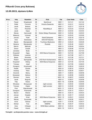 Piłkarski Cross przy Bukowej 12.09.2015, dystans 6,4km M-ce Imię Nazwisko Nr Klub Kat Czas Netto Czas 1 Paweł Smędowski 68 Sportiva.pl M20 \ 1 0:21:41 0:21:42 2 Rafał Formicki 70 Victoria Zawiercie M20 \ 2 0:22:31 0:22:32 3 Jacek Bodora 66 M30 \ 1 0:23:17 0:23:18 4 Artur Rosiński 50 M20 \ 3 0:23:23 0:23:25 5 Jacek Gajos 8 M30 \ 2 0:24:53 0:24:54 6 Maciej Garnowski 83 M30 \ 3 0:25:02 0:25:03 7 Mateusz Ucherek 58 M30 \ 4 0:25:03 0:25:06 8 Janusz Pytel 79 Sokół Zakopane M50 \ 1 0:25:18 0:25:19 9 Artur Dzierzawa 98 UKS 06 Południe M20 \ 4 0:25:37 0:25:40 10 Marek Maciejewski 30 Truchtacz Myslowice M50 \ 2 0:26:23 0:26:26 11 Bożena Macijewska 31 Runeda K30 \ 1 0:26:46 0:26:51 12 Marcin Małczak 32 M30 \ 5 0:26:49 0:26:54 13 Zenon Dudzik 5 M50 \ 3 0:26:58 0:27:00 M20 \ 5 0:26:58 0:27:03 M40 \ 1 0:27:03 0:27:09 NewsMap.pl Dobre Sklepy Rowerowe 14 Jarosław Bryła 71 15 Krzysztof Kępa 18 16 Elżbieta Lewicka 27 K40 \ 1 0:27:08 0:27:11 17 Beata Wrońska 94 K30 \ 2 0:27:28 0:27:31 18 Robert Springwald 73 LKS Ruch Kochanowice M20 \ 6 0:27:30 0:27:36 19 Krzysztof Oleksy 43 ADS Masna Krytyczna M40 \ 2 0:27:40 0:27:45 20 Tomasz Józef 14 M30 \ 6 0:27:59 0:28:03 21 Grzegorz Krzyżowski 91 M30 \ 7 0:28:24 0:28:30 22 Radek Zwolak 88 M30 \ 8 0:28:33 0:28:34 23 Andrzej Plich 45 M30 \ 9 0:28:49 0:28:51 24 Dominik Mokry 38 M20 \ 7 0:28:54 0:28:58 27 Sylwester Szklorz 55 M40 \ 3 0:28:56 0:28:59 26 Damian Kania 75 M30 \ 10 0:28:57 0:28:59 25 Jacek Bogucki 96 M20 \ 8 0:28:57 0:28:58 30 Filip Kieres 19 M20 \ 10 0:28:58 0:29:06 29 Mirosław Skrzypczak 52 night runners M40 \ 4 0:29:02 0:29:06 28 Tomasz Ziajski 64 night runners M20 \ 9 0:29:05 0:29:05 31 Piotr Więczkowski 65 M30 \ 11 0:29:10 0:29:14 33 Grzegorz Powroźnik 48 M40 \ 5 0:29:12 0:29:21 34 Marcin Wiener 80 M40 \ 6 0:29:14 0:29:23 32 Janusz Książek 24 M30 \ 12 0:29:17 0:29:20 35 Jacek Kinel 20 M30 \ 13 0:29:21 0:29:26 36 Maciej Duczyński 89 M40 \ 7 0:29:26 0:29:31 37 Anna Gemza 11 night runners K20 \ 1 0:29:35 0:29:37 38 Michał Fiuk 95 EMERS M30 \ 14 0:29:37 0:29:42 39 Artur Chłopaś 2 WKB Meta Lubliniec M40 \ 8 0:29:44 0:29:49 40 Paweł Kozub 22 M30 \ 15 0:30:14 0:30:17 ADS Masna Krytyczna ADS Masna Krytyczna Timing4U – profesjonalny pomiar czasu – www.timing4u.pl 41 Anna Springwald 72 K20 \ 2 0:30:35 0:30:41 42 Beata Prejs 54 NRT K30 \ 3 0:30:51 0:30:56 43 Marek Szczerbowski 44 GKS Katowice M40 \ 9 0:31:09 0:31:19 44 Michał Kopciński 76 AVE-ALEX Katowice M20 \ 11 0:31:24 0:31:28 45 Wojciech Wydro 87 M20 \ 12 0:31:38 0:31:47 46 47 Krzysztof Racel 99 M30 \ 16 0:31:50 0:31:55 Adam Toporek 57 M20 \ 13 0:31:58 0:31:58 49 Krzysztof Pokwap 47 M30 \ 17 0:32:04 0:32:07 48 Marcin Róg 51 M20 \ 14 0:32:05 0:32:05 50 Tomasz Popielewicz 84 M60 \ 1 0:32:08 0:32:15 51 Marek Popielewicz 85 M50 \ 4 0:32:16 0:32:16 52 Patryk Wychowaniec 62 M20 \ 15 0:32:19 0:32:31 53 Agnieszka Wira 59 K20 \ 3 0:32:29 0:32:39 54 Dawid Woźniak 60 M20 \ 16 0:32:36 0:32:43 55 Marcin Hanasiewicz 12 M20 \ 17 0:32:40 0:32:44 56 Anna Bogusz 1 K30 \ 4 0:32:45 0:32:52 57 Dariusz Kawalec 100 M40 \ 10 0:33:00 0:33:07 58 Rafal Krotecki 23 M30 \ 18 0:33:10 0:33:22 59 Przemysław Markowski 33 M20 \ 18 0:33:27 0:33:34 61 Klaudia Gawinkowska 9 K20 \ 5 0:33:29 0:33:35 night runners Metal Serwis Sport Team Metal Serwis Sport Team biegam bo lubię 60 Karolina Mazij 34 K20 \ 4 0:33:29 0:33:34 62 Agnieszka Piskorz 82 K30 \ 5 0:33:29 0:33:36 63 Agnieszka Kania 74 K30 \ 6 0:33:34 0:33:38 64 Jakub Kobyłka 90 M20 \ 19 0:33:50 0:33:53 66 Przemek Nawrocki 41 M30 \ 19 0:33:55 0:34:05 65 Natalia Nawrocka 40 K30 \ 7 0:33:56 0:34:04 67 Joanna Kumięga 25 K30 \ 8 0:34:09 0:34:14 68 Anna Mroczka 39 K30 \ 9 0:34:12 0:34:15 69 Konrad Gawroński 10 M30 \ 20 0:34:23 0:34:30 71 Dariusz Różewicz 69 M50 \ 5 0:34:38 0:34:49 70 Tadeusz Wójciuk 61 M30 \ 21 0:34:44 0:34:48 72 Łukasz Dziano 67 M30 \ 22 0:35:12 0:35:18 74 Andrzej Labe 26 M60 \ 2 0:35:40 0:35:47 73 Sylwia Frydrysiak 86 K40 \ 2 0:35:40 0:35:46 75 Piotr Domin 3 M20 \ 20 0:36:16 0:36:26 76 Beata Latce 92 K40 \ 3 0:36:36 0:36:41 77 Przemysław Krzan 97 M40 \ 11 0:36:42 0:36:52 78 Rafał Kostka 21 M40 \ 12 0:36:48 0:36:56 80 Piotr Karmański 78 M50 \ 6 0:37:17 0:37:27 79 Katarzyna Frelek 7 K20 \ 6 0:37:23 0:37:27 81 Grzegorz Zabłocki 63 M20 \ 21 0:37:26 0:37:34 82 Agnieszka Tojka 56 K20 \ 7 0:37:31 0:37:38 83 Magdalena Felis 6 K30 \ 10 0:37:38 0:37:42 84 Małgorzata Kazior 16 K30 \ 11 0:37:53 0:37:59 GKS Katowice Pance czeladz tkkf night runners 85 Maciej Książek 49 K20 \ 8 0:38:39 0:38:42 86 Krystian Misztela 36 M40 \ 13 0:38:46 0:38:51 Timing4U – profesjonalny pomiar czasu – www.timing4u.pl 87 Joanna Jureczko 15 88 Agnieszka Mokry 89 Paweł 91 90 biegam bo lubię K20 \ 9 0:39:02 0:39:08 37 K20 \ 10 0:39:20 0:39:24 Lisik 28 M40 \ 14 0:39:46 0:39:54 Aleksander Lech 81 \1 0:40:32 0:40:42 Karol Kuśka 93 M20 \ 22 0:40:39 0:40:41 92 Danuta Kempska 17 K40 \ 4 0:42:23 0:42:27 93 Andrzej 29 KB Józefinka M60 \ 3 0:44:30 0:44:35 94 Agata 46 biegam, bo tak i już K40 \ 5 0:45:18 0:45:20 95 Olgierd Łogiewa Pogorzelskakliks Jędruś 13 M50 \ 7 0:45:31 0:45:41 96 Justyna Pasek 77 K20 \ 11 0:46:52 0:46:56 97 Krystyna Domin 4 K20 \ 12 0:51:20 0:51:27 Timing4U – profesjonalny pomiar czasu – www.timing4u.pl
