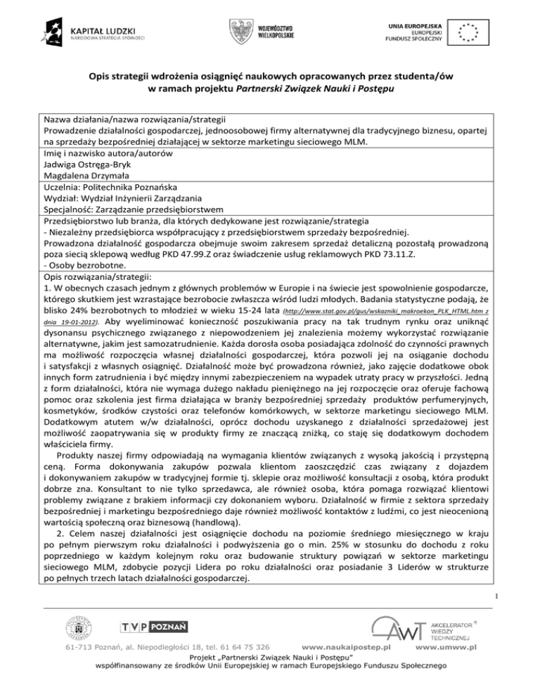 Opis strategii wdrożenia osiągnięć naukowych opracowanych przez studenta/ów w ramach projektu Partnerski Związek Nauki i Postępu Nazwa działania/nazwa rozwiązania/strategii Prowadzenie działalności gospodarczej, jednoosobowej firmy alternatywnej dla tradycyjnego biznesu, opartej na sprzedaży bezpośredniej działającej w sektorze marketingu sieciowego MLM. Imię i nazwisko autora/autorów Jadwiga Ostręga-Bryk Magdalena Drzymała Uczelnia: Politechnika Poznaoska Wydział: Wydział Inżynierii Zarządzania Specjalnośd: Zarządzanie przedsiębiorstwem Przedsiębiorstwo lub branża, dla których dedykowane jest rozwiązanie/strategia - Niezależny przedsiębiorca współpracujący z przedsiębiorstwem sprzedaży bezpośredniej. Prowadzona działalnośd gospodarcza obejmuje swoim zakresem sprzedaż detaliczną pozostałą prowadzoną poza siecią sklepową według PKD 47.99.Z oraz świadczenie usług reklamowych PKD 73.11.Z. - Osoby bezrobotne. Opis rozwiązania/strategii: 1. W obecnych czasach jednym z głównych problemów w Europie i na świecie jest spowolnienie gospodarcze, którego skutkiem jest wzrastające bezrobocie zwłaszcza wśród ludzi młodych. Badania statystyczne podają, że blisko 24% bezrobotnych to młodzież w wieku 15-24 lata (http://www.stat.gov.pl/gus/wskazniki_makroekon_PLK_HTML.htm z dnia 19-01-2012). Aby wyeliminowad koniecznośd poszukiwania pracy na tak trudnym rynku oraz uniknąd dysonansu psychicznego związanego z niepowodzeniem jej znalezienia możemy wykorzystad rozwiązanie alternatywne, jakim jest samozatrudnienie. Każda dorosła osoba posiadająca zdolnośd do czynności prawnych ma możliwośd rozpoczęcia własnej działalności gospodarczej, która pozwoli jej na osiąganie dochodu i satysfakcji z własnych osiągnięd. Działalnośd może byd prowadzona również, jako zajęcie dodatkowe obok innych form zatrudnienia i byd między innymi zabezpieczeniem na wypadek utraty pracy w przyszłości. Jedną z form działalności, która nie wymaga dużego nakładu pieniężnego na jej rozpoczęcie oraz oferuje fachową pomoc oraz szkolenia jest firma działająca w branży bezpośredniej sprzedaży produktów perfumeryjnych, kosmetyków, środków czystości oraz telefonów komórkowych, w sektorze marketingu sieciowego MLM. Dodatkowym atutem w/w działalności, oprócz dochodu uzyskanego z działalności sprzedażowej jest możliwośd zaopatrywania się w produkty firmy ze znaczącą zniżką, co staję się dodatkowym dochodem właściciela firmy. Produkty naszej firmy odpowiadają na wymagania klientów związanych z wysoką jakością i przystępną ceną. Forma dokonywania zakupów pozwala klientom zaoszczędzid czas związany z dojazdem i dokonywaniem zakupów w tradycyjnej formie tj. sklepie oraz możliwośd konsultacji z osobą, która produkt dobrze zna. Konsultant to nie tylko sprzedawca, ale również osoba, która pomaga rozwiązad klientowi problemy związane z brakiem informacji czy dokonaniem wyboru. Działalnośd w firmie z sektora sprzedaży bezpośredniej i marketingu bezpośredniego daje również możliwośd kontaktów z ludźmi, co jest nieocenioną wartością społeczną oraz biznesową (handlową). 2. Celem naszej działalności jest osiągnięcie dochodu na poziomie średniego miesięcznego w kraju po pełnym pierwszym roku działalności i podwyższenia go o min. 25% w stosunku do dochodu z roku poprzedniego w każdym kolejnym roku oraz budowanie struktury powiązao w sektorze marketingu sieciowego MLM, zdobycie pozycji Lidera po roku działalności oraz posiadanie 3 Liderów w strukturze po pełnych trzech latach działalności gospodarczej. 1 61-713 Poznań, al. Niepodległości 18, tel. 61 64 75 326 www.naukaipostep.pl www.umww.pl Projekt „Partnerski Związek Nauki i Postępu” współfinansowany ze środków Unii Europejskiej w ramach Europejskiego Funduszu Społecznego Elementy innowacyjne rozwiązania/strategii, (jeśli istnieją) Forma sprzedaży, jaką proponuje nasza firma jest znaną na rynku. Zwarzywszy jednak na zmieniające się warunki gospodarcze i poszukiwanie innych form uzyskiwania dochodu oraz dokonywania zakupów uważamy, że jest formą atrakcyjną. Produkty, jakie oferuje firma są produktami wykonywanymi z wykorzystaniem innowacyjnych technologii. Środki czystości są koncentratami, posiadają wysoką zawartośd związków powierzchniowo-czynnych a zastosowana w produkcji nanotechnologia wpływa na tworzenie powłoki ochronnej i pielęgnuje czyszczone powierzchnie. Kosmetyki są wykonane na bazie minerałów i naturalnych olejków, co czyni towary atrakcyjnymi na rynku. Spodziewane korzyści dla przedsiębiorstwa wdrażającego rozwiązanie/strategię Korzyści, jakie może osiągnąd właściciel jednoosobowej firmy w branży sprzedaży bezpośredniej to: poniesienie niewielkich kosztów na start działalności, możliwośd dostępu do produktu najwyższej jakości w konkurencyjnej cenie, nieustanny rozwój poprzez dwiczenie marketingu osobistego, umiejętności biznesowych i samomotywujących, pobudzenie i podtrzymanie siły do działania, aby osiągnąd satysfakcję i entuzjazm z wykonywanej pracy, stanie się mentorem dla swojej struktury, przykładem do obserwowania i naśladowania, doradcą i nauczycielem, wypracowanie dochodu pasywnego oraz zarobku na upuście, jaki otrzymuje od firmy produkującej na kupowane towary, comiesięczne premie za obrót płaconych dożywotnio z możliwością dziedziczenia, uzyskanie pozycji lidera nie zależnie od wieku czy wykształcenia, uczestniczenie w mocnych programach motywacyjnych dla liderów, wypracowanie nagrody w postaci darmowych pakietów towarów czy usług, narzędzi wspomagających pracę, wyjazdu na szkolenie czy wycieczki a nawet samochodu. 2 61-713 Poznań, al. Niepodległości 18, tel. 61 64 75 326 www.naukaipostep.pl www.umww.pl Projekt „Partnerski Związek Nauki i Postępu” współfinansowany ze środków Unii Europejskiej w 