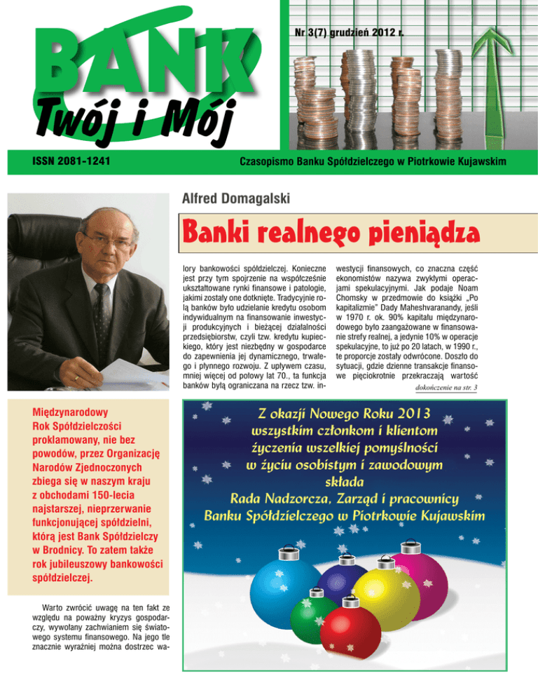 BANK Twój i Mój ISSN 2081-1241 Nr 3(7) grudzień 2012 r. Czasopismo Banku Spółdzielczego w Piotrkowie Kujawskim Alfred Domagalski Banki realnego pieniądza lory bankowości spółdzielczej. Konieczne jest przy tym spojrzenie na współcześnie ukształtowane rynki finansowe i patologie, jakimi zostały one dotknięte. Tradycyjnie rolą banków było udzielanie kredytu osobom indywidualnym na finansowanie inwestycji produkcyjnych i bieżącej działalności przedsiębiorstw, czyli tzw. kredytu kupieckiego, który jest niezbędny w gospodarce do zapewnienia jej dynamicznego, trwałego i płynnego rozwoju. Z upływem czasu, mniej więcej od połowy lat 70., ta funkcja banków byłą ograniczana na rzecz tzw. in- Międzynarodowy Rok Spółdzielczości proklamowany, nie bez powodów, przez Organizację Narodów Zjednoczonych zbiega się w naszym kraju z obchodami 150-lecia najstarszej, nieprzerwanie funkcjonującej spółdzielni, którą jest Bank Spółdzielczy w Brodnicy. To zatem także rok jubileuszowy bankowości spółdzielczej. Warto zwrócić uwagę na ten fakt ze względu na poważny kryzys gospodarczy, wywołany zachwianiem się światowego systemu finansowego. Na jego tle znacznie wyraźniej można dostrzec wa- westycji finansowych, co znaczna część ekonomistów nazywa zwykłymi operacjami spekulacyjnymi. Jak podaje Noam Chomsky w przedmowie do książki „Po kapitalizmie” Dady Maheshvaranandy, jeśli w 1970 r. ok. 90% kapitału międzynarodowego było zaangażowane w finansowanie strefy realnej, a jedynie 10% w operacje spekulacyjne, to już po 20 latach, w 1990 r., te proporcje zostały odwrócone. Doszło do sytuacji, gdzie dzienne transakcje finansowe pięciokrotnie przekraczają wartość dokończenie na str. 3 Z okazji Nowego Roku 2013 wszystkim członkom i klientom życzenia wszelkiej pomyślności w życiu osobistym i zawodowym składa Rada Nadzorcza, Zarząd i pracownicy Banku Spółdzielczego w Piotrkowie Kujawskim KOMENTARZ Dział Księgowości i Informatyki. Od lewej: analityk Marcin Rychłowski, informatycy: Łukasz Marciszewski i Marcin Zientara, pracownice księgowości: Elżbieta Marciniak, Magdalena Michalska i Dorota Neufeldt oraz księgowa Aleksandra Bubacz Oni pracują dla Was Bank to instytucja zaufania publicznego. Na straży aktualności tego stwierdzenia stoją instytucje nadzorcze (Komisja Nadzoru Finansowego), a w przypadku banków spółdzielczych – także bank zrzeszający (SGB-Bank) oraz organa statutowe banku spółdzielczego, jak jego zarząd i rada nadzorcza. Budowanie zaufania i tworzenie trwałych więzi z klientami spoczywa jednak najczęściej na barkach pracowników. To oni najczęściej i w sposób najbardziej bezpośredni mają kontakt z klientami, to od ich cierpliwości, profesjonalizmu oraz wiedzy zależy sukces banku i zadowolenie klientów. Większość kadry Banku Spółdzielczego w Piotrkowie Kujawskim stanowią osoby z wyższym wykształceniem, absolwenci dodatkowych kursów i posiadacze certyfikatów potwierdzających ich umiejętności. Dyskretni, świetnie orientujący się w zdolnościach kredytowych aktualnych i potencjalnych klientów – stąd brak nadmiernych wymagań przy gromadzenia dokumentacji i szybkość podejmowania decyzji kredytowych. To także doradcy, których zadaniem jest proponowanie klientom jak najbardziej korzystnych rozwiązań finansowych dostępnych w Banku. Na nich spoczywa podwójna odpowiedzialność: przed klientami, którym proponują konkretne możliwości skorzystania z oferty kredytowej czy depozytowej oraz przed Bankiem jako pracodawcą i instytucją, na rzecz której pracują. W tym zestawieniu nie ma sprzeczności, jeśli Bank spełnia kryteria określone w zasadach tzw. dobrej praktyki bankowej. W poprzednich numerach przedstawialiśmy pracowników innych placówek BS w Piotrkowie Kujawskim. Obecnie w numerze część pracowników z Działów Księgo- 2 BANK Twój i Mój W Dziale Kredytów pracują także Arleta Rakowska (na pierwszym planie) i Jadwiga Wieczorkowska wości i Informatyki oraz Kredytów, Marketingu i Windykacji placówki macierzystej, czyli Oddziału w Piotrkowie Kujawskim. r. Obawy o stan gospodarki krajowej i lokalnej oraz o jej wpływ na poziom życia, a właściwie na możliwości zaspokojenia potrzeb życiowych mieszkańców naszego regionu, wydają się być uzasadnione. Według ocen analityków jest to rok trudniejszy od minionego, gdyż na poziom wzrostu naszej gospodarki, wpływ ma kolejna rozlewająca się w Europie fala kryzysu, rozregulowane rynki i przepływy finansowe. Widoczny gołym okiem postęp w przekształcaniu się polskiej wsi i unowocześnianiu gospodarstw rolnych ma źródło finansowe w dwóch miejscach, tj. w funduszach unijnych i kredytach w większości udzielanych przez banki spółdzielcze. Podobnie ma się rzecz z pozyskiwaniem środków na rozpoczęcie inwestycji przez samorządy gminne, dla których banki spółdzielcze są sprawdzonymi partnerami. Sytuacja gmin staje się w tym roku jeszcze trudniejsza wobec obostrzeń wprowadzonych decyzjami Ministra Finansów. Oszczędzanie, czyli składanie depozytów w banku spółdzielczym przez jego klientów, osoby fizyczne, przedsiębiorstwa i samorządy ma dwubiegunowy aspekt. Po pierwsze przynosi depozytariuszom dochód w postaci odsetek, a po drugie stanowi główne źródło środków, jakie bank może przeznaczyć na akcję kredytową. Stąd łatwo wysnuć prosty wniosek – oszczędzając we własnym lokalnym banku, sami tworzymy podstawy do finansowania miejscowej gospodarki zarówno w tych dobrych, jak i gorszych dla niej czasach. redakcja Dział Kredytów, Monitoringu i Windykacji. Od lewej: Ewa Wojciechowska, Agnieszka Mańkowska, Julianna Dybalska, Lidia Kurant, Grzegorz Borczyński – kierownik, Ewa Stężewska i Agnieszka Karczewska Tylko w naszym Banku taki dokończenie ze str. 1 Banki realnego pieniądza wszystkich towarów i usług dostarczonych na rynek światowy, a akcje na Wa