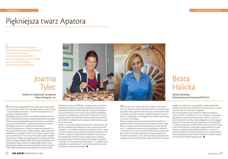 Drużyna A Piękniejsza twarz Apatora Piękniejsza twarz Apatora Z a nami marzec, który wyjątkowo skłania do skupienia uwagi na kobietach. Mimo że w naszej branży, na stanowiskach menedżerskich dominują mężczyźni, jest też tu miejsce dla silnych, kompetentnych, charyzmatycznych menedżerek. Joanna Tylec Beata Halicka Dyrektor ds. Organizacji i Zarządzania Apator Mining Sp. z o.o. Kobiety nie przyznają się podobno do wieku, więc nie jestem pew- na, czy powinnam mówić o tym, jak długo pracuję w Apator Mining – to już niespełna szesnaście lat – choć cały czas wydaje mi się, że zawitałam tu bardzo niedawno. Rozpoczęłam pracę na ostatnim roku Politechniki Śląskiej jako referent ds. ekonomicznych, potem zostałam specjalistą ds. controllingu. Moje ówczesne zajęcia skupiały się przede wszystkim na analizowaniu sytuacji finansowej firmy – jej przychodów, kosztów i wskaźników efektywności oraz na współtworzeniu budżetów. W roku 2003 powierzono mi obszar wewnętrznej organizacji w firmie, sprawy administracyjne i ubezpieczeniowe, organizację imprez dla klientów oraz przygotowania firmy do udziału w targach, wystawach i konferencjach. W tym samym roku pokierowałam zespołem wdrożeniowym i dzięki naszej wspólnej pracy uzyskaliśmy certyfikat Systemu Zarządzania Jakością 9001. Obejmując funkcję Pełnomocnika Zarządu ds. Jakości (obecnie Zintegrowanego Systemu Zarządzania) doprowadziłam do wdrożenia kolejnych dwóch systemów: 14001 i 18001, jednocześnie przejmując nad nimi bieżący nadzór. 22 FLESZ NR 08/KWIECIEŃ 2014 Dyrektor Sprzedaży Fabryka Aparatury Pomiarowej PAFAL SA Dyrektorem zostałam w 2008 roku - od tego momentu mój zakres obowiązków poszerzył się o ochronę środowiska, inwestycje, controlling, sprawy kadrowe i BHP. Nadzoruję też sprawy informatyczne oraz normalizacyjne w firmie. Pracuję z grupą siedmiu specjalistów, różniących się charakterami, zachowaniami i stylem pracy. Ta różnorodność, pomimo tak odmiennych zakresów zadań do wykonania, jest źródłem siły naszego zespołu i sprawia, że znakomicie się uzupełniamy i rozumiemy. Zależy mi na tworzeniu dobrej atmosfery pracy i traktuję innych tak, jak sama chciałabym być traktowana. W pracy staram się kierować rozsądkiem i nie podejmować decyzji pod wpływem emocji – czego nie zawsze udaje się uniknąć. Myślę, że umiejętność zachowania zimnej krwi w sytuacjach „podbramkowych” bardzo mi w tym wszystkim pomaga. Jako menedżer bazuję w dużej mierze na zaufaniu do swojego zespołu. Pozwalam pracownikom działać samodzielnie i korzystać z ich dotychczasowych doświadczeń – to zwiększa odpowiedzialność za swoje zadania. W momentach wątpliwości staramy się wspólnie rozwiązać dany problem. W tym roku minie 15 lat mojej pracy w Pafalu. Zarówno dla mnie, jak i dla pracowników naszej firmy, był to czas dużych zmian. Zaczynałam jako pracownik administracyjny w sekretariacie działu marketingu, a po kilku miesiącach zostałam specjalistą do spraw eksportu i zajmowałam się obsługą klientów zagranicznych, zwłaszcza z rynku niemieckiego. Pierwsze wyjazdy za granicę, podczas których omawialiśmy zagadnienia techniczne dotyczące nowych typów liczników energii elektrycznej, które wówczas wprowadzaliśmy na rynek, były dla mnie – z wykształcenia ekonomisty o specjalizacjach marketing i rachunkowość - pewnym wyzwaniem. Parametry liczników, takie jak rozruch czy chociażby bieg jałowy, stanowiły zagadkę, a konieczność rozmawiania o nich z Niemcami była na początku dość stresująca. Jednak w krótkim okresie, dzięki życzliwości i otwartości kolegów oraz koleżanek z innych działów, mogłam swobodnie udzielać wszechstronnych informacji na temat liczników, nie tylko po polsku, ale i po niemiecku czy angielsku. Gdy rozpoczynałam pracę w eksporcie wielkość sprzedaży na rynku niemieckim wynosiła ok. 5 tys. szt. liczników, a po 10 latach, gdy byłam już kierownikiem działu, prawie 100 tys. szt. Obecnie jestem dyrektorem sprzedaży odpowiadającym za wyniki osiągane zarówno na rynku krajowym, jak i zagranicznym. Mój zespół liczy 27 osób. Są to zarówno wykwalifikowani pracownicy administracyjni, jak również fachowcy wykonujący usługi serwisowe w terenie. Zgodnie z przyjętą strategią Spółki, pozyskujemy i realizujemy zamówienia głównie na liczniki indukcyjne oraz rozwijamy działalność serwisową dotyczącą liczników wszystkich mediów, audytów oraz innych prac elektroenergetycznych. www.apator.com 23 Drużyna A Piękniejsza twarz Apatora P ełnią w swoich firmach odpowiedzialne funkcje, zarządzają ważnymi obszarami działania: inwestycje, controlling, sprzedaż. Na co dzień kierują pracą zespołów ludzi. A przy tym każdy, kto je poznał wie, iż mimo wysokiej pozycji na szczeblu zarządzania są empatyczne, otwarte na ludzi, pełne humoru. J akimi wartościami kierują się współpracując z ludźmi oraz podejmując istotne dla firmy decyzje i czy „kobieca intuicja” może być narzędziem zarządzania...? – zdradzają nasze Menedżerki. Piękniejsza twarz Apatora cd. Monika Pietkiewicz: Czas na chwilę „prawdy” :) Zdradźcie proszę, jak kobiety radzą sobie w „męskiej branży”? JOANNA TYLEC: Bardzo dobrze :) Jesteśmy w mniejszości i to nas wyróżnia. Myślę jednak, że mamy tzw. wyższą „barierę wejścia” polegającą na ograniczonym zaufaniu do fachowości kobiet. Stereotypowo kobiety sprawdzają się w zawodach „miękkich”, ale są wyjątki, które z wielkim sukcesem wykonują zawody tradycyjnie przypisane do mężczyzn - znane są przypadki kobiet będących świetnymi pilotami czy kierowcami Formuły 1. Sądzę, że kobiety z powodzeniem radzą sobie w męskim towarzystwie - przy założeniu, że nie będą starały się za wszelką cenę udowadniać swojej nieomylności, a środowisko pracy i kultura firmy prem