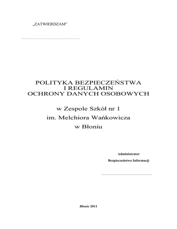 „ZATWIERDZAM” ……………………………………………… POLITYKA BEZPIECZEŃSTWA I REGULAMIN OCHRONY DANYCH OSOBOWYCH w Zespole Szkół nr 1 im. Melchiora Wańkowicza w Błoniu Administrator Bezpieczeństwa Informacji …………………………….… Błonie 2011 S P I S TREŚCI I. POLITYKA BEZPIECZEŃSTWA .........................................................................................4 Pojęcia podstawowe .......................................................................................................................4 Cele ....................................................................................................................................................5 II. ADMINISTRACJA I ORGANIZACJA BEZPIECZEŃSTWA ............................................6 Informacje ogólne ...........................................................................................................................6 Administrator Bezpieczeństwa Informacji ................................................................................7 Użytkownik systemu ......................................................................................................................8 Bezpieczeństwo przetwarzania danych osobowych ................................................................8 III. WYKAZ ZBIORÓW DANYCH OSOBOWYCH WRAZ ZE WSKAZANIEM PROGRAMÓW ZASTOSOWANYCH DO PRZETWARZANIA TYCH DANYCH .............................................................................................................................8 IV. SPOSÓB PRZEPŁYWU DANYCH POMIĘDZY POSZCZEGÓLNYMI SYSTEMAMI.......................................................................................................................9 Komunikacja. ...................................................................................................................................9 V. OKREŚLENIE ŚRODKÓW TECHNICZNYCH I ORGANIZACYJNYCH NIEZBĘDNYCH DLA ZAPEWNIENIA POUFNOŚCI, INTEGRALNOŚCI I ROZLICZALNOŚCI PRZETWARZANYCH DANYCH ................................................9 VI. UDOSTĘPNIANIE POSIADANYCH W ZBIORZE DANYCH OSOBOWYCH............10 VII. BEZPIECZEŃSTWO PERSONELU ................................................................................10 Informacje ogólne .........................................................................................................................10 Użytkownicy systemu ..................................................................................................................10 VIII. BEZPIECZEŃSTWO FIZYCZNE ..................................................................................11 Informacje ogólne .........................................................................................................................11 Pomieszczenia lub części pomieszczeń, tworzących obszar, w którym przetwarzane są dane osobowe - obszar systemu - ................................................................11 Ochrona serwera, stacji roboczych i nośników ......................................................................11 Zasady kontroli sprzętu................................................................................................................12 IX. BEZPIECZEŃSTWO SPRZĘTU I OPROGRAMOWANIA.............................................12 Strona 2/ 25 Informacje ogólne .........................................................................................................................12 Bezpieczeństwo Sprzętowe.........................................................................................................12 Bezpieczeństwo Oprogramowania ............................................................................................12 X. KONSERWACJE I NAPRAWY..........................................................................................13 Konserwacja sprzętu ....................................................................................................................13 Konserwacja oprogramowania ...................................................................................................13 Naprawa sprzętu ............................................................................................................................13 XI. PLANY AWARYJNE I ZAPOBIEGAWCZE ...................................................................13 Zasilanie ..........................................................................................................................................13 Kopie zapasowe.............................................................................................................................14 XII. POLITYKA ANTYWIRUSOWA.....................................................................................14 XIII. UDOSTĘPNIANIE DANYCH OSOBOWYCH .............................................................14 XIV. POSTANOWIENIA KOŃCOWE ...................................................................................15 XV. LISTA ZAŁĄCZNIKÓW .................................................................................................15 Strona 3/ 25 I. POLITYKA BEZPIECZEŃSTWA POJĘCIA PODSTAWOWE 1. Polityka Bezpieczeństwa została utworzona w związku z wymaganiami zawartymi w ustawie z dnia 29 sierpnia 1997 r. o ochronie danych osobowych (tekst jednolity: Dz. U. 2002 r. Nr 101 poz. 926, ze zm.) oraz rozporządzeniu Ministra Spraw Wewnętrznych i Administracji z dnia 29 kwietnia 2004 r. w sprawie dokumentacji przetwarzania danych osobowych oraz warunków technicznych i organizacyjnych, jakim powinny odpowiadać urządzenia i systemy informatyczne służące do przetwarzania danych osobowych Dz. U. z 2004 r. Nr 100, poz. 1024. Opracowany dokument jest zgodny z dyrektywą 2002/58/WE Parlamentu Europejskiego i Rady z dnia 12 lipca 2002 r. w sprawie przetwarzania danych osób oraz ochrony prywatności w sektorze komunikacji elektronicznej. 2. Regulamin nini