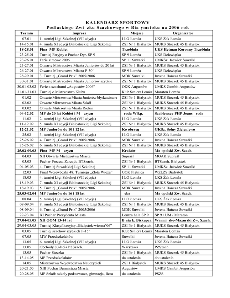 K ALENDARZ SPORTOWY Podlaskiego Związku Szachowego w Białymstoku na 2006 rok Termin Miejsce Organizator 1. turniej Ligi Szkolnej (VII edycja) 4. runda XI edycji Białostockiej Ligi Szkolnej Finał MP Kobiet Turniej Feryjny o Puchar Dyr. SP 9 Ferie zimowe 2006 Otwarte Mistrzostwa Miasta Juniorów do 20 lat Otwarte Mistrzostwa Miasta P-30’ 3. Turniej „Grand Prix” 2005/2006 Otwarte Mistrzostwa Miasta Juniorów szybkie Ferie z szachami „Augustów 2006” Turniej o Mistrzostwo Klubu I LO Łomża ZSI Nr 1 Białystok Trzebinia SP 9 Łomża SP 11 Suwałki ZSI Nr 1 Białystok SP 9 Łomża MDK Suwałki ZSI Nr 1 Białystok ODK Augustów Klub Seniora Łomża UKS Żak Łomża MUKS Stoczek 45 Białystok UKS Hetman Koronny Trzebinia UKS Dziewiątka UMKSz. Jaćwieź Suwałki MUKS Stoczek 45 Białystok UKS Dziewiątka Juvena Hańcza Suwałki MUKS Stoczek 45 Białystok UMKS Gambit Augustów Maraton Łomża 01.02 02.02 03.02 04-12.02 11.02 11-12.02 Otwarte Mistrzostwa Miasta Juniorów błyskawiczne Otwarte Mistrzostwa Miasta Szkół Otwarte Mistrzostwa Miasta Rodzin MP do 20 lat Kobiet i Mężczyzn 2. turniej Ligi Szkolnej (VII edycja) 5. runda XI edycji Białostockiej Ligi Szkolnej ZSI Nr 1 Białystok ZSI Nr 1 Białystok ZSI Nr 1 Białystok Środa Wlkp. I LO Łomża ZSI Nr 1 Białystok MUKS Stoczek 45 Białystok MUKS Stoczek 45 Białystok MUKS Stoczek 45 Białystok Szablewscy PHP Jeans Środa UKS Żak Łomża MUKS Stoczek 45 Białystok 12-21.02 25.02 25-26.02 25-26.02 MP Juniorów do 10 i 12 lat 3. turniej Ligi Szkolnej (VII edycja) 4. Turniej „Grand Prix” 2005/2006 6. runda XI edycji Białostockiej Ligi Szkolnej Kołobrzeg I LO Łomża MDK Suwałki ZSI Nr 1 Białystok GKSz. Solny Zieleniewo UKS Żak Łomża Juvena Hańcza Suwałki MUKS Stoczek 45 Białystok Kraków Małopolski Zw. Szach. Supraśl ZSI Nr 1 Białystok SP 11 Suwałki GOK Piątnica I LO Łomża ZSI Nr 1 Białystok MDK Suwałki MOAK Supraśl BTSzach. Białystok UMKSz. Jaćwieź Suwałki WZLZS Białystok UKS Żak Łomża MUKS Stoczek 45 Białystok Juvena Hańcza Suwałki 25.03-02.04 MP Juniorów do 16 i 18 lat Łeba Małopolski Zw. Szach. 08.04 08-09.04 08-09.04 22-23.04 27.04-05.05 29.04-03.05 5. turniej Ligi Szkolnej (VII edycja) 8. runda XI edycji Białostockiej Ligi Szkolnej 6. Turniej „Grand Prix” 2005/2006 XI Puchar Prezydenta Miasta XII OOM 13-14 lat Turniej Klasyfikacyjny „Białystok-wiosna’06” I LO Łomża ZSI Nr 1 Białystok MDK Suwałki Łomża hala SP 9 Bęsia k. Biskupca ZSI Nr 1 Białystok UKS Żak Łomża MUKS Stoczek 45 Białystok Juvena Hańcza Suwałki SP 9 / UM / Maraton Warmińsko-Mazurski Zw. Szach. MUKS Stoczek 45 Białystok 03.05 07.05 Turniej szachów szybkich P-15’ MW Przedszkolaków Klub Seniora Łomża Maraton Łomża Suwałki Juvena Hańcza Suwałki 13.05 13.05 6. turniej Ligi Szkolnej (VII edycja) Obchody 80-lecia PZSzach. I LO Łomża Warszawa UKS Żak Łomża PZSzach. Puchar Stoczka MP Przedszkolaków Mistrzostwa Województwa Nauczycieli XIII Puchar Burmistrza Miasta MP Szkół: szkoły podstawowe, gimnazja, licea ZSI Nr 1 Białystok do ustalenia ZSI 1 Białystok Augustów do ustalenia MUKS Stoczek 45 Białystok do ustalenia MUKS Stoczek 45 Białystok UMKS Gambit Augustów PSZS 07.01 14-15.01 18-28.01 23-25.01 23-26.01 23-27.01 26-27.01 28-29.01 30-31.01 30.01-03.02 31.01-31.03 Impreza 25.02-09.03 Finał MP Mężczyzn 04.03 05.03 04-05.03 12.03 18.03 18-19.03 18-19.03 13.05 13-14.05 14.05 20-21.05 20-28.05 XII Otwarte Mistrzostwa Miasta Puchar Prezesa Zarządu BTSzach. 4. Turniej Suwalskiej Ligi Szkolnej Finał Wojewódzki 48. Turnieju „Złota Wieża” 4. turniej Ligi Szkolnej (VII edycja) 7. runda XI edycji Białostockiej Ligi Szkolnej 5. Turniej „Grand Prix” 2005/2006 21.05 27.05 27-28.05 27-28.05 III Turniej Rodzin Szach. o Puchar Dyr. MDK Zakończenie XI edycji Białostockiej Ligi Szkolnej Turniej Mistrzów XI ed. Białostockiej Ligi Szkolnej 7. Turniej „Grand Prix” 2005/2006 MDK Białystok ZSI Nr 1 Białystok ZSI Nr 1 Białystok MDK Suwałki MKS-MDK Białystok MUKS Stoczek 45 Białystok MUKS Stoczek 45 Białystok Juvena Hańcza Suwałki 03-04.06 03-04.06 IX Turniej Dzieci i Młodzieży „Suwaliada 2006” Finał Turnieju „Grand Prix” 2005/2006 OSiR Suwałki MDK Suwałki Juvena Hańcza Suwałki Juvena Hańcza Suwałki 09-11.06 10.06 Mistrzostwa Województwa Juniorów do 17 lat SP 11 Suwałki Podsumowanie VII ed. Ligi Szkolnej – Tur. Gwiazd I LO Łomża 17-18.06 23-30.06 24-30.06 MP Juniorów szybkie Turniej Kadry Juniorów Otwarte Mistrzostwa Województwa Podlaskiego Częstochowa UKS Hetman Częstochowa Szklarska Poręba Stilon Gorzów Wlkp. ZSI 1 Białystok MUKS Stoczek 45 Białystok 01-10.07 02-15.07 08-16.07 DMP – I Liga Juniorów Wakacje z szachami DMP – II Liga Juniorów Szklarska Poręba Stilon Gorzów Wlkp. Mielno-Uniście AKS Hetman Polit. Koszalin Lublin Lubelski Związek Szachowy 03-04.08 20-27.08 Indywidualne i Drużynowe MP błyskawiczne „Augustów 2006” Koszalin BPiS Augustów AKSz. Hetman Polit. Koszalińska Juvena Hańcza Suwałki 01-10.09 01-10.09 01-10.09 09-10.09 16-21.09 23-24.09 DMP - Ekstraliga Seniorów DMP - I Liga Seniorów DMP - II Liga Seniorów 1. runda XII edycji Białostockiej Ligi Szkolnej Eliminacje Międzywojewódzkie Juniorów do 17 1. Turniej „Grand Prix” 2006/2007 Chotowa Jarnołtówek Lublin ZSI Nr 1 Białystok Lublin MDK Suwałki Małopolski Związek Szachowy PUKS Rodło Opole Lubelski Związek Szachowy MUKS Stoczek 45 Białystok Lubelski Związek Szachowy Juvena Hańcza Suwałki 07-08.10 14-15.10 14-15.10 21-30.10 21.10-12.11 2. runda XII edycji Białostockiej Ligi Szkolnej 2. Turniej „Grand Prix” 2006/2007 Puchar Edukacji Narodowej Półfinały MP Kobiet, Mężczyzn i do 20 lat Turniej Klasyfikacyjny „Białystok-jesień’06” ZSI Nr 1 Białystok MDK Suwałki ZSI Nr 1 Białystok Poraj ZSI Nr 1 Białystok MUKS Stoczek 45 Białystok Juvena Hańcza Suwałki MUKS Stoczek 45 Białystok LKS Gol-Start Częstochowa M