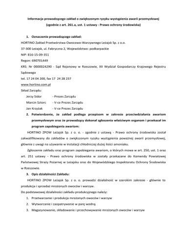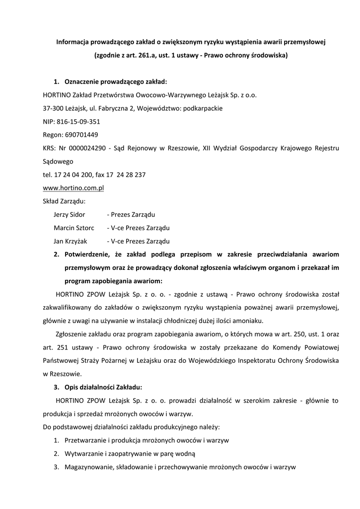 Informacja prowadzącego zakład o zwiększonym ryzyku wystąpienia awarii przemysłowej (zgodnie z art. 261.a, ust. 1 ustawy - Prawo ochrony środowiska) 1. Oznaczenie prowadzącego zakład: HORTINO Zakład Przetwórstwa Owocowo-Warzywnego Leżajsk Sp. z o.o. 37-300 Leżajsk, ul. Fabryczna 2, Województwo: podkarpackie NIP: 816-15-09-351 Regon: 690701449 KRS: Nr 0000024290 - Sąd Rejonowy w Rzeszowie, XII Wydział Gospodarczy Krajowego Rejestru Sądowego tel. 17 24 04 200, fax 17 24 28 237 www.hortino.com.pl Skład Zarządu: Jerzy Sidor - Prezes Zarządu Marcin Sztorc - V-ce Prezes Zarządu Jan Krzyżak - V-ce Prezes Zarządu 2. Potwierdzenie, że zakład podlega przepisom w zakresie przeciwdziałania awariom przemysłowym oraz że prowadzący dokonał zgłoszenia właściwym organom i przekazał im program zapobiegania awariom: HORTINO ZPOW Leżajsk Sp. z o. o. - zgodnie z ustawą - Prawo ochrony środowiska został zakwalifikowany do zakładów o zwiększonym ryzyku wystąpienia poważnej awarii przemysłowej, głównie z uwagi na używanie w instalacji chłodniczej dużej ilości amoniaku. Zgłoszenie zakładu oraz program zapobiegania awariom, o których mowa w art. 250, ust. 1 oraz art. 251 ustawy - Prawo ochrony środowiska w zostały przekazane do Komendy Powiatowej Państwowej Straży Pożarnej w Leżajsku oraz do Wojewódzkiego Inspektoratu Ochrony Środowiska w Rzeszowie. 3. Opis działalności Zakładu: HORTINO ZPOW Leżajsk Sp. z o. o. prowadzi działalność w szerokim zakresie - głównie to produkcja i sprzedaż mrożonych owoców i warzyw. Do podstawowej działalności zakładu produkcyjnego należy: 1. Przetwarzanie i produkcja mrożonych owoców i warzyw 2. Wytwarzanie i zaopatrywanie w parę wodną 3. Magazynowanie, składowanie i przechowywanie mrożonych owoców i warzyw 4. Charakterystyka składowanych substancji niebezpiecznych decydujących o zaliczeniu zakładu do zakładu o zwiększonym ryzyku: W zakładzie znajduje się przemysłowa instalacja chłodnicza, w której amoniak (NH3) w postaci ciekłej i gazowej, jest wykorzystywany, jako jej czynnik. Technologia polega na wytwarzaniu odpowiedniego ciśnienia amoniaku, dzięki sprężarkom tłokowym i śrubowym. Na podstawie karty charakterystyki: AMONIAK BEZWODNY (NH3) Nr CAS: 7664-41-7 ZAGROŻENIE DLA ZDROWIA: H2 - OSTRO TOKSYCZNE H331 - Działa toksycznie w następstwie wdychania. Toksyczność ostra, narażenie inhalacyjne - Kategoria 3 - Acute Tox. 3 H314 - Powoduje poważne oparzenia skóry oraz uszkodzenia oczu Działanie żrące na skórę - Kategoria 1B - Skin Corr. 1B ZAGROŻENIE FIZYCZNE: P2 - GAZY ŁATWOPALNE H221 - Gaz łatwopalny. Gazy łatwopalne - Kategoria 2 - Flam. Gas 2 H280 - Zawiera gaz pod ciśnieniem; ogrzanie grozi wybuchem. Gazy pod ciśnieniem - Gaz skroplony - Press. Gas ZAGROŻENIE DLA ŚRODOWISKA: E1 - Niebezpieczne dla środowiska wodnego H400 - Działa bardzo toksycznie na organizmy wodne. Stwarzające zagrożenie dla środowiska wodnego - Zagrożenie ostre - Kategoria 1- Aquatic Acute 1 H411 - Działa bardzo toksycznie na organizmy wodne, powodując długotrwałe skutki. Stwarzające zagrożenie dla środowiska wodnego - Zagrożenie przewlekłe - Kategoria 2 Aquatic Chronic 2 Z uwagi na ilość znajdującego się na terenie zakładu amoniaku istnieje potencjalne zagrożenie wystąpienia awarii, której skutki mogą wykraczać poza jego teren. Wszystkie posiadane dokumenty potwierdzają, że w zakładzie funkcjonuje odpowiedni system bezpieczeństwa, który ryzyko wystąpienia awarii przemysłowej ogranicza do minimum. Zakład posiada również odpowiednie środki w postaci systemów monitoringu, zabezpieczeń oraz procedur służących zapobieganiu wystąpienia awarii oraz ograniczenia jej skutków. Utrzymuje również dobrze wyszkolonych i wyposażonych w odpowiedni sprzęt ratowników chemicznych zdolnych do podjęcia skutecznych działań ratowniczych w przypadku awarii. Są oni też wspierani w swych działaniach przez inne służby zakładu. W przypadku uwolnienia amoniaku, toksyczna chmura przemieszczająca się z kierunkiem wiatru może stwarzać zagrożenie dla ludzi. Amoniak ma charakterystyczny zapach i jest dobrze wyczuwalny już przy niewielkich stężeniach. W większych stężeniach w powietrzu powoduje podrażnienie dróg oddechowych oraz śluzówek oczu, może stanowić zagrożenie dla zdrowia lub życia w zależności od stężenia i czasu oddziaływania. 5. Informacje dotyczące sposobów ostrzegania i postępowania społeczeństwa w przypadku wystąpienia awarii przemysłowej: W razie wystąpienia niebezpieczeństwa w postaci zagrożenia chemicznego pracownik, który to zauważył, w miarę swoich możliwości ocenia stopień zagrożenia i powiadamia za pomocą dostępnych środków (radiotelefon, telefon, Ręczny Sygnalizator Pożaru) swoich współpracowników, przełożonych, członków ekip ratunkowych HORTINO ZPOW Leżajsk Sp. z o. o. a także Prezesa Zarządu. Prezes Zarządu, po otrzymaniu zgłoszenia o awarii w przypadku możliwości rozprzestrzenienia się zagrożenia poza teren zakładu, daje polecenie załączenia syren alarmowych. Alarm chemiczny ogłaszany za pomocą syren to dźwięk modulowany trwający 3 minuty. Informacje o awarii przekazywane są również do Stanowiska Kierowania Komendanta Powiatowego Państwowej Straży Pożarnej w Leżajsku oraz Oficera Dyżurnego Komendy Powiatowej Policji w Leżajsku. Jednocześnie przez wyznaczonych pracowników telefonicznie powiadamiane są o zagrożeniu firmy usytuowane w pobliżu zakładu oraz przez megafon znajdujący się w samochodzie w formie odpowiednich komunikatów ludność zamieszkałą w pobliżu. Po usłyszeniu alarmu o skażeniu każda osoba znajdująca się w rejonie zagrożenia powinna: 1. Znajdując się na terenie otwartym: określić kierunek wiatru, powiadomić inne osoby o zagrożeniu, opuścić zagrożony teren prostopadle do kierunku wiatru, schronić się w zamkniętym pomieszczen