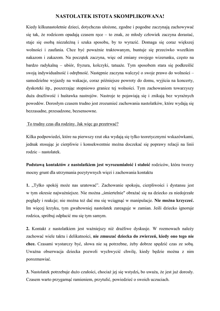 NASTOLATEK ISTOTA SKOMPLIKOWANA! Kiedy kilkunastoletnie dzieci, dotychczas ułożone, zgodne i pogodne zaczynają zachowywać się tak, że rodzicom opadają czasem ręce – to znak, ze młody człowiek zaczyna dorastać, staje się osobą niezależną i szuka sposobu, by to wyrazić. Domaga się coraz większej wolności i zaufania. Chce być poważnie traktowanym, buntuje się przeciwko wszelkim nakazom i zakazom. Na początek zaczyna, więc od zmiany swojego wizerunku, często na bardzo radykalną – ubiór, fryzura, kolczyki, tatuaże. Tym sposobem stara się podkreślić swoją indywidualność i odrębność. Następnie zaczyna walczyć o swoje prawo do wolności – samodzielne wyjazdy na wakacje, coraz późniejsze powroty do domu, wyjścia na koncerty, dyskoteki itp., poszerzając stopniowo granice tej wolności. Tym zachowaniom towarzyszy duża drażliwość i huśtawka nastrojów. Nastroje te pojawiają się i znikają bez wyraźnych powodów. Dorosłym czasem trudno jest zrozumieć zachowania nastolatków, które wydają się bezzasadne, przesadzone, bezsensowne. To trudny czas dla rodziny. Jak więc go przetrwać? Kilka podpowiedzi, które na pierwszy rzut oka wydają się tylko teoretycznymi wskazówkami, jednak stosując je cierpliwie i konsekwentnie można doczekać się poprawy relacji na linii rodzic – nastolatek. Podstawą kontaktów z nastolatkiem jest wyrozumiałość i stałość rodziców, która tworzy mocny grunt dla utrzymania pozytywnych więzi i zachowania kontaktu 1. „Tylko spokój może nas uratować”. Zachowanie spokoju, cierpliwości i dystansu jest w tym okresie najważniejsze. Nie można „śmiertelnie" obrażać się na dziecko za niedojrzałe poglądy i reakcje; nie można też dać mu się wciągnąć w manipulacje. Nie można krzyczeć. Im więcej krzyku, tym gwałtowniej nastolatek zareaguje w zamian. Jeśli dziecko ignoruje rodzica, spróbuj odpłacić mu się tym samym. 2. Kontakt z nastolatkiem jest ważniejszy niż drażliwe dyskusje. W rozmowach należy zachować wiele taktu i delikatności, nie zmuszać dziecka do zwierzeń, kiedy ono tego nie chce. Czasami wystarczy być, słowa nie są potrzebne, żeby dobrze spędzić czas ze sobą. Uważna obserwacja dziecka pozwoli wychwycić chwilę, kiedy będzie można z nim porozmawiać. 3. Nastolatek potrzebuje dużo czułości, chociaż jej się wstydzi, bo uważa, że jest już dorosły. Czasem warto przygarnąć ramieniem, przytulić, powiedzieć o swoich uczuciach. 4. Docenianie, chwalenie, mówienie komplementów (w psychologii – wzmocnienia pozytywne) wpływają na kształtowanie obrazu siebie. Im więcej dziecko dostanie takich „głasków”, tym lepiej będzie funkcjonowało w środowisku. Nastolatek i tak już jest zakompleksiony, niezadowolony z przemian, które zachodzą w jego organizmie i psychice. Nie można także popadać w pułapkę wzajemnego krytykowania się pokoleń w stylu: „ja w twoim wieku", „w moich czasach". Lepiej zrezygnować z takich rozmów, bo one nic nie dają, często nasilają konflikt. 5. Normy i zasady powinny obowiązywać w każdym domu ( dot. obowiązków dzieci, czasu powrotu do domu, reguł życia rodzinnego).Rodzice muszą dbać, aby były przestrzegane, a nieprzestrzegania przez dziecko ustalonych zasad powinno się wiązać z konsekwencjami. NIE unikajcie wyrażania swoich opinii, nie rezygnujcie ze swojego zdania, nawet, gdy to nie przynosi rezultatu. W przyszłości dzieci mogą mieć słuszne pretensje, „dlaczego mi tego nie zabroniliście", „dlaczego mi nie powiedziałeś tego tato", „to przecież wy byliście wtedy dorośli, mieliście większą wiedzę i doświadczenie, „mogliście mi zabronić”. Bycie dobrym rodzicem często polega na trudnych rozmowach i podejmowaniu niepopularnych decyzji. Należy też pamiętać, że jeśli czegoś wymagamy od dziecka, to najpierw wymagajmy tego od siebie. 6. Trzeba pogodzić się z faktem, że przyjaciele i życie towarzyskie mają dla nastolatka większe znaczenie, niż to, co dzieje się w domu. Jeżeli jednak w przeszłości, (kiedy dziecko było młodsze) dom rodzinny był dla niego ważnym elementem życia, przystanią w trudnych chwilach – ono do niego wróci. Rodzice znów staną się autorytetem. 7. Nastolatek ma prawo do własnego życia. Nie jest projekcją marzeń rodziców, nie musi, więc swoim życiem spełniać ich oczekiwań. Trzeba mu pozwolić na odmienne, niż mieliśmy, zamierzenia i plany, na inną wizję osobistego szczęścia. Zaakceptować jego pomysł na życie. Trzeba uszanować tajemnicę jego kieszeni, szuflad i korespondencji, nie domagać się w sposób natarczywy odpowiedzi, nie "ciągnąć za język", jeżeli milczy. Właśnie, bowiem wtedy, gdy młody człowiek wie, że to zależy tylko od niego, będzie skłonny do zwierzeń i zwrócenia się o radę. Ale równocześnie trzeba interesować się pozadomowym życiem nastoletniego dziecka, jego kolegami, zainteresowaniami, sposobami spędzania wolnego czasu. Trzeba też być czujnym wobec istniejących zagrożeń dla jego psychicznego rozwoju. I trzeba szukać pomocy, gdy mimo wszystko nie uda nam się Państwu dotrzeć do dorastającego dziecka. Życzę wszystkim Rodzicom odnalezienia jak najkrótszej drogi do swoich dojrzewających dzieci. Opracowałam na podstawie: I. Obuchowska ,,Drogi dorastania“ Warszawa 1996, artykułu T. Biernat oraz dostępnej literatury.