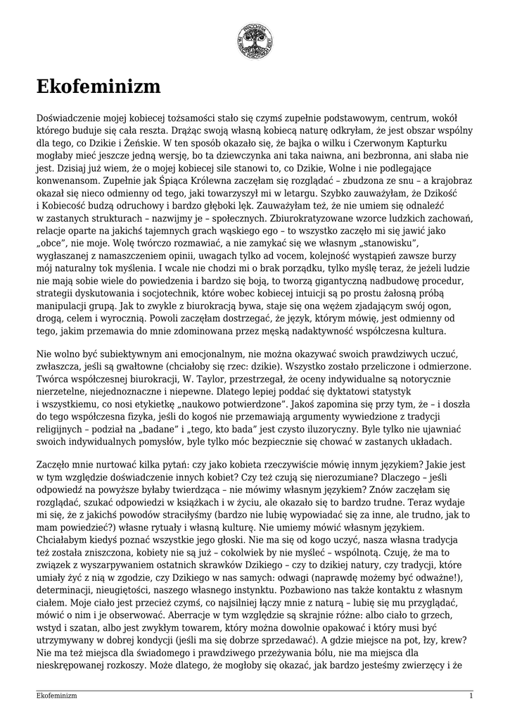 Ekofeminizm Doświadczenie mojej kobiecej tożsamości stało się czymś zupełnie podstawowym, centrum, wokół którego buduje się cała reszta. Drążąc swoją własną kobiecą naturę odkryłam, że jest obszar wspólny dla tego, co Dzikie i Żeńskie. W ten sposób okazało się, że bajka o wilku i Czerwonym Kapturku mogłaby mieć jeszcze jedną wersję, bo ta dziewczynka ani taka naiwna, ani bezbronna, ani słaba nie jest. Dzisiaj już wiem, że o mojej kobiecej sile stanowi to, co Dzikie, Wolne i nie podlegające konwenansom. Zupełnie jak Śpiąca Królewna zaczęłam się rozglądać – zbudzona ze snu – a krajobraz okazał się nieco odmienny od tego, jaki towarzyszył mi w letargu. Szybko zauważyłam, że Dzikość i Kobiecość budzą odruchowy i bardzo głęboki lęk. Zauważyłam też, że nie umiem się odnaleźć w zastanych strukturach – nazwijmy je – społecznych. Zbiurokratyzowane wzorce ludzkich zachowań, relacje oparte na jakichś tajemnych grach wąskiego ego – to wszystko zaczęło mi się jawić jako „obce”, nie moje. Wolę twórczo rozmawiać, a nie zamykać się we własnym „stanowisku”, wygłaszanej z namaszczeniem opinii, uwagach tylko ad vocem, kolejność wystąpień zawsze burzy mój naturalny tok myślenia. I wcale nie chodzi mi o brak porządku, tylko myślę teraz, że jeżeli ludzie nie mają sobie wiele do powiedzenia i bardzo się boją, to tworzą gigantyczną nadbudowę procedur, strategii dyskutowania i socjotechnik, które wobec kobiecej intuicji są po prostu żałosną próbą manipulacji grupą. Jak to zwykle z biurokracją bywa, staje się ona wężem zjadającym swój ogon, drogą, celem i wyrocznią. Powoli zaczęłam dostrzegać, że język, którym mówię, jest odmienny od tego, jakim przemawia do mnie zdominowana przez męską nadaktywność współczesna kultura. Nie wolno być subiektywnym ani emocjonalnym, nie można okazywać swoich prawdziwych uczuć, zwłaszcza, jeśli są gwałtowne (chciałoby się rzec: dzikie). Wszystko zostało przeliczone i odmierzone. Twórca współczesnej biurokracji, W. Taylor, przestrzegał, że oceny indywidualne są notorycznie nierzetelne, niejednoznaczne i niepewne. Dlatego lepiej poddać się dyktatowi statystyk i wszystkiemu, co nosi etykietkę „naukowo potwierdzone”. Jakoś zapomina się przy tym, że – i doszła do tego współczesna fizyka, jeśli do kogoś nie przemawiają argumenty wywiedzione z tradycji religijnych – podział na „badane” i „tego, kto bada” jest czysto iluzoryczny. Byle tylko nie ujawniać swoich indywidualnych pomysłów, byle tylko móc bezpiecznie się chować w zastanych układach. Zaczęło mnie nurtować kilka pytań: czy jako kobieta rzeczywiście mówię innym językiem? Jakie jest w tym względzie doświadczenie innych kobiet? Czy też czują się nierozumiane? Dlaczego – jeśli odpowiedź na powyższe byłaby twierdząca – nie mówimy własnym językiem? Znów zaczęłam się rozglądać, szukać odpowiedzi w książkach i w życiu, ale okazało się to bardzo trudne. Teraz wydaje mi się, że z jakichś powodów straciłyśmy (bardzo nie lubię wypowiadać się za inne, ale trudno, jak to mam powiedzieć?) własne rytuały i własną kulturę. Nie umiemy mówić własnym językiem. Chciałabym kiedyś poznać wszystkie jego głoski. Nie ma się od kogo uczyć, nasza własna tradycja też została zniszczona, kobiety nie są już – cokolwiek by nie myśleć – wspólnotą. Czuję, że ma to związek z wyszarpywaniem ostatnich skrawków Dzikiego – czy to dzikiej natury, czy tradycji, które umiały żyć z nią w zgodzie, czy Dzikiego w nas samych: odwagi (naprawdę możemy być odważne!), determinacji, nieugiętości, naszego własnego instynktu. Pozbawiono nas także kontaktu z własnym ciałem. Moje ciało jest przecież czymś, co najsilniej łączy mnie z naturą – lubię się mu przyglądać, mówić o nim i je obserwować. Aberracje w tym względzie są skrajnie różne: albo ciało to grzech, wstyd i szatan, albo jest zwykłym towarem, który można dowolnie opakować i który musi być utrzymywany w dobrej kondycji (jeśli ma się dobrze sprzedawać). A gdzie miejsce na pot, łzy, krew? Nie ma też miejsca dla świadomego i prawdziwego przeżywania bólu, nie ma miejsca dla nieskrępowanej rozkoszy. Może dlatego, że mogłoby się okazać, jak bardzo jesteśmy zwierzęcy i że Ekofeminizm 1 cały ten gmach cywilizacji nie zdołał nas jednak pozbawić przynależności do świata natury. Przynależność do tego świata czuję całym ciałem i całe moje ciało buntuje się, kiedy widzę wycinkę pod trasy narciarskie na Jaworzynie. To przecież moja rodzina, moje plemię. I w takich chwilach nie ma miejsca na intelektualne dywagacje, statystyki i epatowanie elokwencją. Nic się nie liczy, trzeba coś zrobić, już, natychmiast, nagle odkrywam, że nie boję się niczego/nikogo i mam prawo do moich uczuć, mojego ciała i wspólnoty z tym, co mnie otacza, nawet, jeśli nie jest to „naukowo uzasadnione”. Doświadczenie = reakcja. Z głową nabitą takimi myślami i takimi obrazami wyruszyłam na spotkanie w Spale (Ogólnopolskie Spotkanie Ruchów Ekologicznych). Mniej więcej wiedziałam, jak to może wyglądać uczestnicząc we wcześniejszych przygotowaniach. Myślałam sobie: znów będę zagryzać wargi znając ten ton głosu, którym reagują na proste babskie pytanie: po co to wszystko? Znów będzie mnie ogarniał lęk przed wystąpieniem obok Festiwalu Niczym Nieskrępowanego Męskiego Ego. Obiecałam sobie jednak kiedyś nie być pokrzywdzoną ofiarą męskiej dominacji – prawda jest taka, że pokrzywdzonym jest się na własne życzenie. Tak się złożyło, że byłam świeżo po lekturze „Technopolu” Neila Postmana. To dziwne, jak wiele obserwacji przystawało do tej nielicznej grupy ludzi, która ma odwagę przeciwstawiać się wszechobecnej wojnie z przyrodą. Choćby taka: […] tec