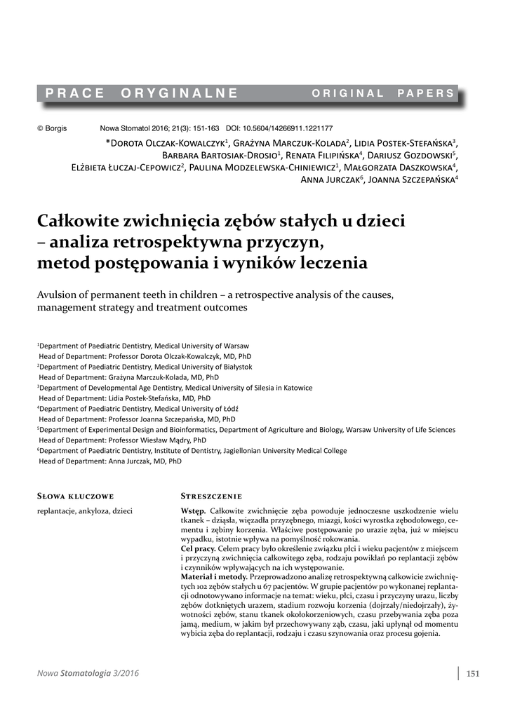 PRACE © Borgis ORYGINALNE ORIGINAL PA P E R S Nowa Stomatol 2016; 21(3): 151-163 DOI: 10.5604/14266911.1221177 *Dorota Olczak-Kowalczyk1, Grażyna Marczuk-Kolada2, Lidia Postek-Stefańska3, Barbara Bartosiak-Drosio1, Renata Filipińska4, Dariusz Gozdowski5, Elżbieta Łuczaj-Cepowicz2, Paulina Modzelewska-Chiniewicz1, Małgorzata Daszkowska4, Anna Jurczak6, Joanna Szczepańska4 Całkowite zwichnięcia zębów stałych u dzieci – analiza retrospektywna przyczyn, metod postępowania i wyników leczenia Avulsion of permanent teeth in children – a retrospective analysis of the causes, management strategy and treatment outcomes Department of Paediatric Dentistry, Medical University of Warsaw Head of Department: Professor Dorota Olczak-Kowalczyk, MD, PhD 2 Department of Paediatric Dentistry, Medical University of Białystok Head of Department: Grażyna Marczuk-Kolada, MD, PhD 3 Department of Developmental Age Dentistry, Medical University of Silesia in Katowice Head of Department: Lidia Postek-Stefańska, MD, PhD 4 Department of Paediatric Dentistry, Medical University of Łódź Head of Department: Professor Joanna Szczepańska, MD, PhD 5 Department of Experimental Design and Bioinformatics, Department of Agriculture and Biology, Warsaw University of Life Sciences Head of Department: Professor Wiesław Mądry, PhD 6 Department of Paediatric Dentistry, Institute of Dentistry, Jagiellonian University Medical College Head of Department: Anna Jurczak, MD, PhD 1 Słowa kluczowe Streszczenie replantacje, ankyloza, dzieci Wstęp. Całkowite zwichnięcie zęba powoduje jednoczesne uszkodzenie wielu tkanek – dziąsła, więzadła przyzębnego, miazgi, kości wyrostka zębodołowego, cementu i zębiny korzenia. Właściwe postępowanie po urazie zęba, już w miejscu wypadku, istotnie wpływa na pomyślność rokowania. Cel pracy. Celem pracy było określenie związku płci i wieku pacjentów z miejscem i przyczyną zwichnięcia całkowitego zęba, rodzaju powikłań po replantacji zębów i czynników wpływających na ich występowanie. Materiał i metody. Przeprowadzono analizę retrospektywną całkowicie zwichniętych 102 zębów stałych u 67 pacjentów. W grupie pacjentów po wykonanej replantacji odnotowywano informacje na temat: wieku, płci, czasu i przyczyny urazu, liczby zębów dotkniętych urazem, stadium rozwoju korzenia (dojrzały/niedojrzały), żywotności zębów, stanu tkanek okołokorzeniowych, czasu przebywania zęba poza jamą, medium, w jakim był przechowywany ząb, czasu, jaki upłynął od momentu wybicia zęba do replantacji, rodzaju i czasu szynowania oraz procesu gojenia. Nowa Stomatologia 3/2016 151 Dorota Olczak-Kowalczyk, Grażyna Marczuk-Kolada, Lidia Postek-Stefańska, Barbara Bartosiak-Drosio, Renata Filipińska, Dariusz Gozdowski, Elżbieta Łuczaj-Cepowicz, Paulina Modzelewska-Chiniewicz i wsp. Wyniki. Najczęściej wybiciu ulegały przyśrodkowe zęby sieczne szczęki. Do urazu zwykle dochodziło na ulicy lub podwórku, a większość urazów związana była z aktywnością sportową. Nie replantowano 10% zębów. Czas, jaki upłynął od urazu do udzielenia pierwszej pomocy, wahał się od 2 minut do 4 dni. Zęby przechowywano najczęściej na sucho. Obserwowano niewłaściwy sposób lub zbyt długie unieruchamiania związane z nieterminowym zgłaszaniem się pacjentów. Najczęściej obserwowanym powikłaniem była ankyloza. Ryzyko powikłań zmniejszały: brak współistniejących uszkodzeń pourazowych, replantacja < 60 minut od urazu, przechowywanie zęba w ślinie, prawidłowy sposób unieruchamiania oraz antybiotykoterapia. Wnioski. Nieudzielenie pomocy na miejscu wypadku, niewłaściwe przechowywanie zęba całkowicie zwichniętego, błędy postępowania lekarskiego i niezgłaszanie się pacjentów na wyznaczone wizyty będące przyczynami powikłań gojenia wskazują na konieczność powszechnej edukacji dotyczącej postępowania w przypadku całkowitego zwichnięcia zęba. 152 Keywords Summary replantation, ankylosis, children Introduction. Avulsion of the tooth results in a simultaneous damage of many tissues – gingiva, periodontal ligament, pulp, alveolar bone, cement and dentin of the root. Proper management after tooth injury, already at the site of the accident, has a significant impact on successful prognosis. Aim. The aim of the study was to determine the relationship between patient gender/age and the place/cause of tooth avulsion, the type of complications after tooth replantation as well as factors influencing their occurrence. Material and methods. A retrospective analysis of 102 avulsed permanent teeth was performed in 67 patients. The following data was recorded in the group of patients after replantation: age, gender, time and cause of the injury, number of affected teeth, the stage of root maturation (mature/immature), vitality of the affected teeth, condition of supporting tissues, extra-oral time of avulsed teeth, storage media, time elapsed between injury and replantation, type and duration of splinting, and the healing process. Results. Maxillary central incisors were most frequently avulsed. Dental trauma usually occurred in the street or courtyard, and most of the injuries were associated with sports activities. A total of 10% of teeth were not replanted. The time elapsed between the injury and first-aid ranged from 2 minutes to 4 days. Most teeth were stored dry. Improper or prolonged splinting due to untimely reporting on dental visits was observed. Ankylosis was the most common complication. The risk of complications was reduced due to: the lack of concomitant traumatic lesions, replantation < 60 minutes post-injury, tooth storage in saliva, correct splinting and antibiotic therapy. Conclusions. Lack of first-aid at the accident site, improper storage of the avulsed tooth, medical errors and patients’ missing scheduled visits, all of which cause healing complications, indicate the need for public education on the manag