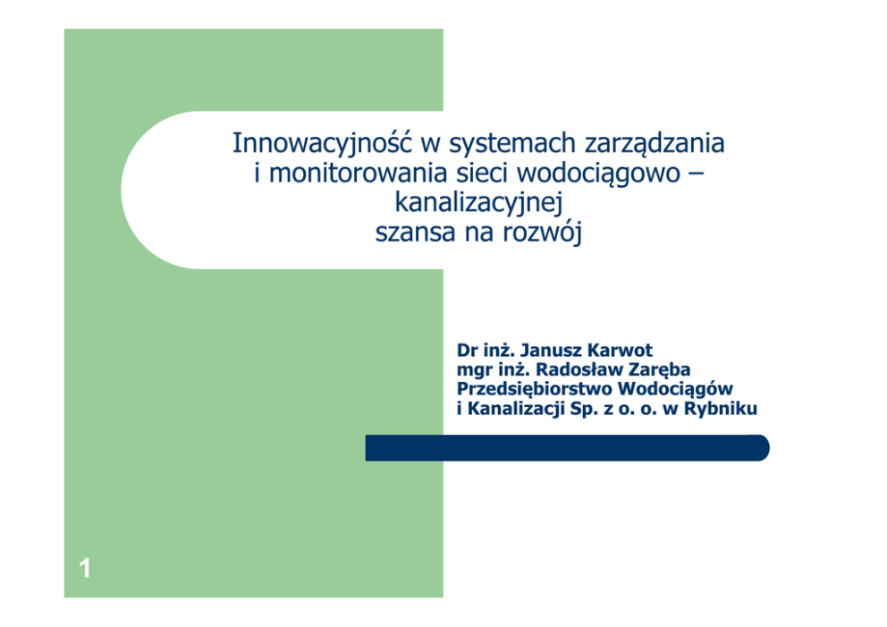 Innowacyjność w systemach zarządzania i monitorowania sieci wodociągowo – kanalizacyjnej szansa na rozwój Dr inż. Janusz Karwot mgr inż. Radosław Zaręba Przedsiębiorstwo Wodociągów i Kanalizacji Sp. z o. o. w Rybniku 1 Plan prezentacji 1. 2. 3. 4. 5. 2 Wprowadzenie Uwarunkowania zarządzania przedsiębiorstwem sieciowym Zarządzanie przedsiębiorstwem wodociągowokanalizacyjnym Przykładowe systemy informatyczne w zarządzaniu przedsiębiorstwem wodociągowo-kanalizacyjnym Podsumowanie Wprowadzenie 3 Pojęcie innowacji pochodzi z języka łacińskiego; innovare czyli "tworzenie czegoś nowego". Stąd najczęstsza definicja innowacji podkreśla, iż "innowacja jest procesem polegającym na przekształceniu istniejących możliwości w nowe idee i wprowadzenie ich do praktycznego zastosowania" oraz ”innowacja to zastosowanie nowej wiedzy w procesie produkcji" Wprowadzenie Źródła innowacji 4 Działalność badawcza (B+R); Zakup nowej wiedzy w postaci patentów, licencji, usług technicznych itp. Nabycie tzw. technologii materialnej, czyli innowacyjnych urządzeń i maszyn o podwyższonych parametrach technicznych Wprowadzenie Innowacje technologiczne/techniczne. 5 przynoszą największą wartość dodaną oraz najwyższe dochody przedsiębiorcy, są najbardziej kosztowne, przyczyniają się one do rozwoju produktów i usług. bazują na wynikach prac naukowych i działalności badawczej (B+R). Wprowadzenie Innowacje organizacyjne. powodują zmianę w sposobie funkcjonowania przedsiębiorstwa, zmiana organizacji pracy, czy organizacji zarządzania, związane są z racjonalizacją organizacji lub dostosowaniem jej do zmieniających się przepisów prawa, czy wymogów ze strony klientów. często mają charakter bezkosztowy 6 Polska Innowacyjność Innowacje odzwierciedlają poziom innowacyjności gospodarki poprzez swoją liczbę. Każdy kraj rozwinięty stara się podnieść poziom innowacyjności swojej gospodarki, ponieważ ten bezpośrednio wpływa na konkurencyjność całego kraju. 7 Polska Innowacyjność Strategia Lizbońska • innowacja wszędzie • wiedza dla innowacji • inwestycje w innowacje • efektywne zarządzanie innowacjami Wiedza szansą dla Polski i przemysłu • wiedza wykorzystanie funduszy strukturalnych jako instrument wsparcia 8 Polska Innowacyjność Word Economic Forum – Polska w światowym rankingu innowacyjności. Miejsce w rankingu Ocena 9 2006 2012 2006 2012 Jakość instytucji badawczych 3,8 4,1 58 45 Inwestycje firm w B+R 3,8 2,9 31 88 Współpraca uczelni i biznesu w dziedzinie B+R 3,6 3,6 38 67 Czym kieruje się rząd kupując zaawansowane technologicznie produkty (ceną -1, zaawansowaniem technologicznym i innowacyjnością -7) 3,6 3,2 76 101 Dostępność naukowców i inżynierów 4,2 4,2 75 58 Zdolność do innowacji (firmy kupują technologie -1, firmy tworzą własne nowe technologie -7) 4,1 3,3 30 54 Innowacyjność łącznie 3,5 3,3 44 63 Źródło: Krzysztof Rybiński, ”Fundusze pomocowe Unii Europejskiej a rozwój innowacyjności w polskiej gospodarce” Polska Innowacyjność Poziom innowacyjności w krajach UE. EU Member States’ innovation performance Źródło: http://ec.europa.eu/enterprise/policies/innovation/facts-figures-analysis/innovation-scoreboard/index_en.htm 10 Zarządzanie przedsiębiorstwem wodociągowo-kanalizacyjnym Jedną z podstaw prawidłowego zarządzania nowoczesnym przedsiębiorstwem wodociągowym jest posiadanie możliwie pełnej informacji o stanie technicznym sieci wodno-kanalizacyjnej. Podejmowanie prawidłowych decyzji wymaga uwzględnienia wielu różnorakich czynników występujących zarówno w danej chwili jak i okresach przyszłych. Naturalnym sposobem wspomagania tego typu działań jest stosowanie odpowiednich narzędzi informatycznych. 11 Zarządzanie przedsiębiorstwem wodociągowo-kanalizacyjnym Rosnące wymagania odbiorców wody dotyczące zaopatrzenia w wodę o odpowiedniej jakości, ilości oraz pod odpowiednim ciśnieniem spowodowały konieczność ograniczenia bieżących kosztów i strat. Cztery podstawowe działania zmierzające w tym kierunku to: 12 Aktywna kontrola wycieków (ang. Active Leakage Control) Zarządzanie ciśnieniem w sieciach wodociągowych (ang. Pressure Management) Szybkość i jakość napraw (ang. Speed and Quallity of Repairs) Odnowa oraz wymiana rur i armatury (ang. Pipe Materials Management) Nowoczesne zintegrowane zarządzanie przedsiębiorstwem Do zarządzania zasobami przedsiębiorstwa wdrożono system informatyczny ERP. System ten zawiera m.in.: o o o 13 ewidencję obiektów technicznych, gospodarkę remontową, utrzymanie ruchu Nowoczesne zintegrowane zarządzanie przedsiębiorstwem W eksploatacji sieci wod-kan jednym z ważniejszych modułów jest moduł Remontów i Obsługi Technicznej. Serwis maszyn i urządzeń jako harmonogramowe i planowe realizacje służb utrzymania ruchu. 14 Przykładowe systemy wspomagające w zarządzaniu przedsiębiorstwem wodociągowo-kanalizacyjnym 15 Rys.2. Wizualizacja komory pomiarowej w PWiK Rybnik Sp z .o.o Przykładowe systemy wspomagające w zarządzaniu przedsiębiorstwem wodociągowo-kanalizacyjnym P o w s ta ją c a a w a ria s ie c i w o d o c ią g o w e j 16 U s u n ię c ie a w a rii s ie c i w o d o c ią g o w e j Rys.3. Moment wykrycia wycieku na sieci wodociągowej w PWiK Rybnik Sp. z .o.o. w strefie Chwałowice za pomocą badania przepływu nocnego Przykładowe systemy wspomagające w zarządzaniu przedsiębiorstwem wodociągowo-kanalizacyjnym Zarządzanie ciśnieniem w sieciach wodociągowych Regulacja ciśnień w systemie wodociągowym ściśle wiąże się z wyodrębnieniem stref wodociągowych. Polega ona na redukcji ciśnienia zbyt wysokiego i podnoszenia ciśnienia dla obszarów z jego niedoborem. Zarządzanie ciśnieniem w strefie polega najczęściej na ustawieniu stałej nastawy ciśnienia na wyjściu reduktora lub zastosowaniu układów hydroforowych z falownikami. 17 Przykładowe systemy 