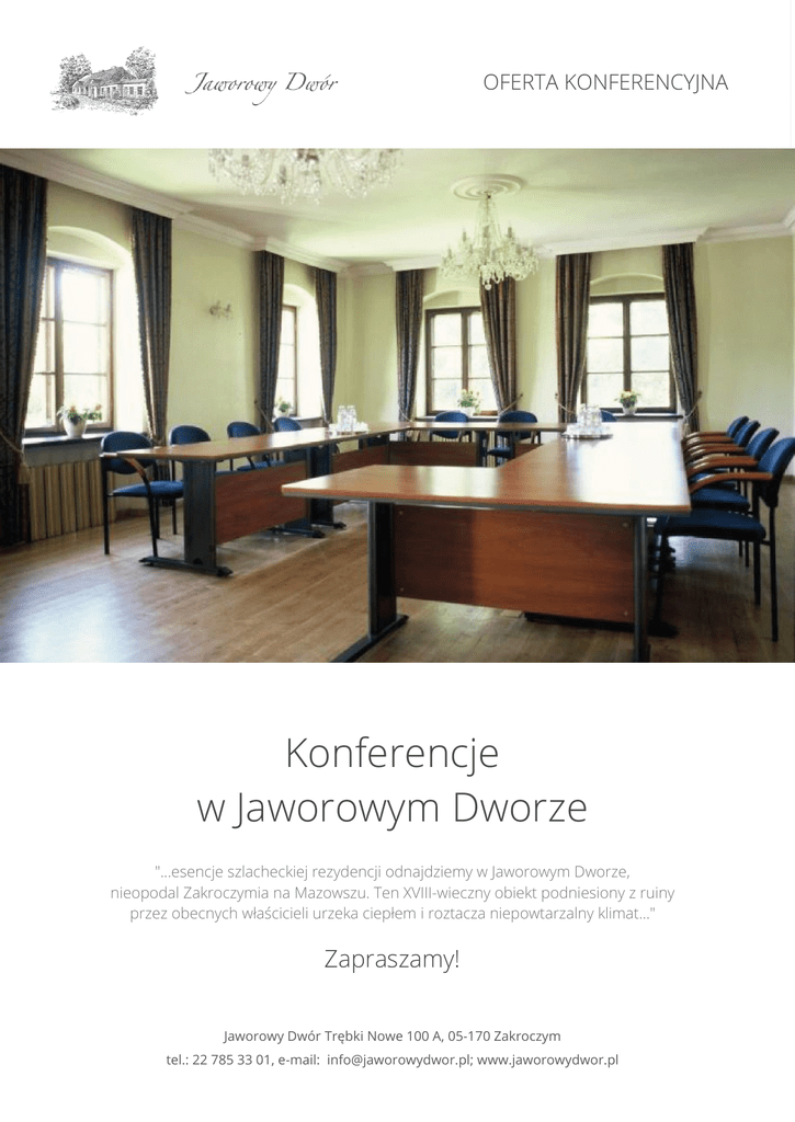 OFERTA KONFERENCYJNA Konferencje w Jaworowym Dworze "...esencje szlacheckiej rezydencji odnajdziemy w Jaworowym Dworze, nieopodal Zakroczymia na Mazowszu. Ten XVIII-wieczny obiekt podniesiony z ruiny przez obecnych właścicieli urzeka ciepłem i roztacza niepowtarzalny klimat..." Zapraszamy! Jaworowy Dwór Trębki Nowe 100 A, 05-170 Zakroczym tel.: 22 785 33 01, e-mail: [email protected]; www.jaworowydwor.pl OFERTA KONFERENCYJNA Kilka słów o nas Jaworowy Dwór położony jest nieopodal Zakroczymia na Mazowszu. Ten XVIII – wieczny obiekt podniesiony z ruiny przez obecnych właścicieli urzeka ciepłem i roztacza niepowtarzalny klimat. Dwór został zbudowany w pierwszej połowie XVIII wieku w klasycystycznym stylu szlacheckich dworków polskich przez rodzinę Jaworskich pieczętujących się herbem Orsza. Dzięki staraniom aktualnych właścicieli obiekt został wpisany do Krajowego Rejestru Zabytków. Dwór otacza zagospodarowany park z liczącym sobie czterysta lat dębem - pomnikiem przyrody, stawem i zabytkowym wiatrakiem, w którym przygotowano pokoje w unikatowym, folkowym stylu. Dodatkowo do dyspozycji Gości są: pole golfowe, wielofunkcyjne boisko z utwardzoną powierzchnią, świetnie nadającym się do gry w siatkówkę, koszykówkę czy tenisa ziemnego, biblioteka, sala kominkowa, bilard, SPA oraz wiele innych atrakcji. Jaworowy Dwór zlokalizowany jest w spokojnej okolicy, 11 km od Twierdzy Modlin i lotniska w Modlinie. Na miejscu dostępny jest bezpłatny parking i Internet WiFi. Zakwaterowanie Jaworowy Dwór oddaje do dyspozycji Gości 20 komfortowo wyposażonych pokoi dla około 40 osób. Wszystkie urządzone są z wielkim smakiem, każdy z wyczuciem niepowtarzalnego stylu, z nadzwyczajną dbałością o autentyczne meble i bibeloty. Ich wysoki standard uzupełnia wszechobecna ciepła atmosfera. Prócz dworkowych pokoi, na Gości czekają również dwa apartamenty w Domku Ogrodnika oraz trzy pokoje w drewnianym wiatraku. Wszystkie pokoje posiadają: łazienkę (z prysznicem lub wanną), suszarkę do włosów, kosmetyki hotelowe, telefon, TV satelitarną i dostęp do Internetu Wi-Fi. Pokoje są indywidualnie zaprojektowane i wyposażone w akcesoria oraz meble firmy Period. Sale konferencyjne Jaworowy Dwór oferuje wszechstronne usługi w zakresie organizacji konferencji, szkoleń i imprez firmowych. Do dyspozycji są 4 sale konferencyjne, w pełni wyposażone w profesjonalny sprzęt multimedialny. Każda z sal wyposażona jest w: ekran, rzutnik multimedialny, flipchart z zapasem papieru i mazakami, notesy i długopisy, kamerę cyfrową, dostęp do Internetu. Jaworowy Dwór Trębki Nowe 100 A, 05-170 Zakroczym, [email protected], www.jaworowydwor.pl OFERTA KONFERENCYJNA Nazwa sali Powierzchnia Ustawienie podkowa Ustawienie - szkolne Ustawienie teatralne Ustawienie bankiet Cena netto Jaworowa Dębowa Restauracyjna 50m2 72m2 112m2 20 20 60 20 20 60 40 40 100 40 40 100 900 zł 900 zł 1 200 zł Gastronomia Nasza restauracja kusi Gości feerią niepowtarzalnych barw, smaków i aromatów. Serwujemy potrawy kuchni staropolskiej przygotowane wedle przepisów mistrzów sztuki kulinarnej oraz dania regionalne. Stosownie do pory roku, na stołach królują świeże warzywa i owoce, leśne grzyby, dziczyzna urozmaicona ziołami z ogrodu... Aż się roi od uciech dla podniebienia! W swojej ofercie proponujemy organizację przerw kawowych, obiadów, kolacji (także w formie uroczystej, bankietowej, grillowej czy z ogniskiem). Atrakcje dodatkowe Na terenie kompleksu dworkowo - parkowego do dyspozycji Gości jest odkryty basen (czynny w sezonie letnim), kort tenisowy, boisko do siatkówki, bilard, sauna oraz profesjonalne pole golfowe. Na grupy przyjeżdżające na spotkania i konferencje, w czasie wolnym od zajęć czekają różnorodne atrakcje: akompaniament instrumentalny do kolacji (między innymi fortepian Steinway), dyskoteka, karaoke, zabawy teambuildingowe, wieczory tematyczne, kabaret i artyści scen polskich, zespoły muzyczne i wybrani przez Państwa soliści, przejażdżka wozami cygańskimi z pochodniami, bryczkami, kulig z ogniskiem i grzanym winem. Dla wszystkich Gości zmęczonych pędem dnia codziennego proponujemy zabiegi relaksacyjne w naszym SPA. Jaworowy Dwór to także 3 ha zabytkowego parku, idealnego do organizacji imprez plenerowych. Nasz dworski piknik to: doskonałe jedzenie, świetne pomysły na scenariusze, różnorodne programy artystyczne, rekreacyjne czy sportowe, a przede wszystkim piękny teren stworzony do imprez plenerowych. wiata grillowa z występami artystycznymi (np. zespół ludowy, cygański), Jaworowy Dwór Trębki Nowe 100 A, 05-170 Zakroczym, www.jaworowydwor.pl OFERTA KONFERENCYJNA Pole golfowe Najnowsza inwestycja, która poszerzyła ofertę Jaworowego Dworu to obiekt golfowy krótkiej gry (typu chip & putt). Obiekt w chwili obecnej składa się z jednego toru o długości ok. 60 m od miejsca tee do greenu. Na torze gracze odnajdą przeszkody odzwierciedlające wiele sytuacji i uderzeń spotykanych na mistrzowskim polu golfowym: od uderzeń z bunkra, przeszkody wodnej, drzewa i krzewy, raf, i inne. Green ukrywa w sobie 5 dołków (piny), rozłożone tak, aby prezentowały różne stopnie trudności uderzeń na greenie. Każdy z pinów może stanowić zakończenie gry dołka rozpoczynanego z innego miejsca tee, tym sposobem gracz może rozegrać 5-dołkową rundę na całym torze. W zamyśle projektanta tor ukształtowany jest tak, aby dać radość z gry zarówno początkującym graczom jak i wytrawnym już wielbicielom golfa. Satysfakcję sprawi w grze indywidualnej jak i w grupowej_zabawie. Zasady rozgrywanego tu golfa obowiązują takie, jak na pełnowymiarowym polu golfowym z ujęciem tzw. reguł miejscowych. Nowością obiektu w Jaworowym Dworze jest fakt, że w całości wykonany jest z wysokiej jakościowo nawierzchni sztucznej, dzięki temu utrzymuje bardzo dobrą kondycję toru gry niemalże przez cały rok. Opiekę nad obiektem
