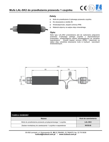 Mufa LAL-SK2 do przedłużania przewodu 1 czujnika Zalety Mufa do przedłużania 2-żyłowego przewodu czujnika. Do stosowania w strefie Z0. Wodoodporność, stopień ochrony IP68. Materiał odporny na wpływ oleju mineralnego. Opis: Mufa typu LAL-SK2 przewidziana jest do wykonania połączenia przewodu 2-żyłowego jednego czujnika z doprowadzonym przewodem, przedłużającym obwód iskrobezpieczny do zacisków sygnalizatora. Wysoki stopień ochrony (IP68) i odporność na wpływ oleju umożliwia stosowanie mufy w trudnych warunkach środowiskowych. TABELA DOBORU Nazwa Kod do zamówienia Mufa do przedłużania przewodu przyłączeniowego 1 czujnika LAL-SK2 Zestaw montażowy do zawieszania 1 czujnika w separatorze NVO5-B 05-092 Łomianki, ul. Warszawska 50, 22 7664560, 22 7664570; fax. 22 7513638 [email protected] * www.luxbud.com.pl Mufa LAL-SK2 do przedłużania przewodu 1 czujnika Dane techniczne LAL-SK2 Stopień ochrony : IP68 (zgodnie z IEC 60529) o o o o Temperatura otoczenia : od -20 C do +60 C Temperatura przechowywania : od -20 C do +60 C 2 dławiki kablowe M20x1,5; 2 żółte uszczelki z TPE dla przewodu o średnicy od 4 do 6,5mm 1 czarna uszczelka z TPE dla przewodu o średnicy od 6,5 do 9,5mm 1 czerwona uszczelka z TPE dla przewodu o średnicy od 9,0 do 13,0mm 2 2 2 złączki, 2-drutowe dla żył o przekroju od 0,08mm do 2,5mm Podłączenie : obudowa mufy – St4000 ATEX, kolor czarny, antystatyczny dławik kablowy – Poliamid PA6-3 Materiał : Waga : ~95g Wymiary : 30mm x 30mm x 145mm; dławiki w komplecie Dane dla zastosowań w strefie zagrożonej wybuchem Certyfikat badania typu Grupa, kategoria, typ ochrony i klasa temperaturowa : Napięcie Ui : nie wymagany (urządzenie proste zgodnie z EN 60079-11) II 1G Ex ia IIB T4 II 2G Ex ib IIC T4 60V Prąd Ii : 500mA Moc Pi : 2,0W Zgodność z Dyrektywami : 94/9/WE wg EN 60079-0:2006, EN 60079-11:2007 Sposób montażu z wykorzystaniem mufy przyłączeniowej i zestawu do zawieszania: 05-092 Łomianki, ul. Warszawska 50, 22 7664560, 22 7664570; fax. 22 7513638 [email protected] * www.luxbud.com.pl