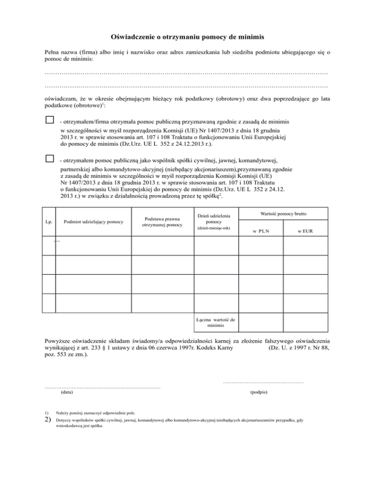 Oświadczenie o otrzymaniu pomocy de minimis Pełna nazwa (firma) albo imię i nazwisko oraz adres zamieszkania lub siedziba podmiotu ubiegającego się o pomoc de minimis: ……………………………………………………………………………………………………………………… ……………………………………………………………………………………………………………………… oświadczam, że w okresie obejmującym bieżący rok podatkowy (obrotowy) oraz dwa poprzedzające go lata podatkowe (obrotowe)1: □ - otrzymałem/firma otrzymała pomoc publiczną przyznawaną zgodnie z zasadą de minimis w szczególności w myśl rozporządzenia Komisji (UE) Nr 1407/2013 z dnia 18 grudnia 2013 r. w sprawie stosowania art. 107 i 108 Traktatu o funkcjonowaniu Unii Europejskiej do pomocy de minimis (Dz.Urz. UE L 352 z 24.12.2013 r.). □ - otrzymałem pomoc publiczną jako wspólnik spółki cywilnej, jawnej, komandytowej, partnerskiej albo komandytowo-akcyjnej (niebędący akcjonariuszem),przyznawaną zgodnie z zasadą de minimis w szczególności w myśl rozporządzenia Komisji Komisji (UE) Nr 1407/2013 z dnia 18 grudnia 2013 r. w sprawie stosowania art. 107 i 108 Traktatu o funkcjonowaniu Unii Europejskiej do pomocy de minimis (Dz.Urz. UE L 352 z 24.12. 2013 r.) w związku z działalnością prowadzoną przez tę spółkę2. Lp. Podmiot udzielający pomocy Podstawa prawna otrzymanej pomocy Dzień udzielenia pomocy (dzień-miesiąc-rok) Wartość pomocy brutto w PLN w EUR .... Łączna wartość de minimis Powyższe oświadczenie składam świadomy/a odpowiedzialności karnej za złożenie fałszywego oświadczenia wynikającej z art. 233 § 1 ustawy z dnia 06 czerwca 1997r. Kodeks Karny (Dz. U. z 1997 r. Nr 88, poz. 553 ze zm.). ………………………………………… …………………………………………………………… (data) 1) 2) (podpis) Należy poniżej zaznaczyć odpowiednie pole. Dotyczy wspólników spółki cywilnej, jawnej, komandytowej albo komandytowo-akcyjnej (niebędących akcjonariuszami)w przypadku, gdy wnioskodawcą jest spółka.