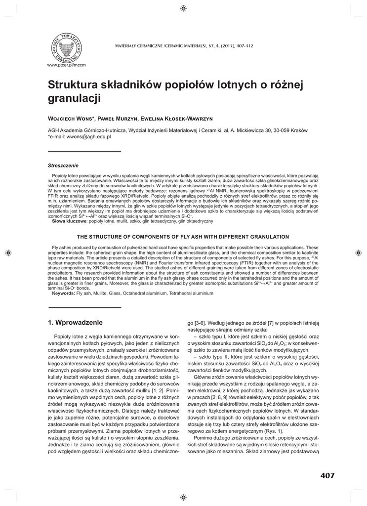 MATERIA£Y CERAMICZNE /CERAMIC MATERIALS/, 67, 4, (2015), 407-412 www.ptcer.pl/mccm Struktura składników popiołów lotnych o różnej granulacji W W *, P M ,E K -W AGH Akademia Górniczo-Hutnicza, Wydział Inżynierii Materiałowej i Ceramiki, al. A. Mickiewicza 30, 30-059 Kraków *e-mail: [email protected] Streszczenie Popioły lotne powstające w wyniku spalania węgli kamiennych w kotłach pyłowych posiadają specyficzne właściwości, które pozwalają na ich różnorakie zastosowanie. Właściwości te to między innymi kulisty kształt ziaren, duża zawartość szkła glinokrzemianowego oraz skład chemiczny zbliżony do surowców kaolinitowych. W artykule przedstawiono charakterystykę struktury składników popiołów lotnych. W tym celu wykorzystano następujące metody badawcze: rezonans jądrowy 27Al NMR, fourierowską spektroskopię w podczerwieni FTIR oraz analizę składu fazowego XRD/Rietveld. Popioły objęte analizą pochodziły z różnych stref elektrofiltrów, przez co różniły się m.in. uziarnieniem. Badania omawianych popiołów dostarczyły informacje o budowie ich składników oraz wykazały szereg różnic pomiędzy nimi. Wykazano między innymi, że glin w szkle popiołów lotnych występuje jedynie w pozycjach tetraedrycznych, a stopień jego zeszklenia jest tym większy im popiół ma drobniejsze uziarnienie i dodatkowo szkło to charakteryzuje się większą ilością podstawień izomorficznych Si4+↔Al3+ oraz większą ilością wiązań terminalnych Si-O–. Słowa kluczowe: popioły lotne, mullit, szkło, glin tetraedyczny, glin oktaedryczny THE STRUCTURE OF COMPONENTS OF FLY ASH WITH DIFFERENT GRANULATION Fly ashes produced by combustion of pulverized hard coal have specific properties that make possible their various applications. These properties include: the spherical grain shape, the high content of aluminosilicate glass, and the chemical composition similar to kaolinite type raw materials. The article presents a detailed description of the structure of components of selected fly ashes. For this purpose, 27Al nuclear magnetic resonance spectroscopy (NMR) and Fourier transform infrared spectroscopy (FTIR) together with an analysis of the phase composition by XRD/Rietveld were used. The studied ashes of different graining were taken from different zones of electrostatic precipitators. The research provided information about the structure of ash constituents and showed a number of differences between the ashes. It has been proved that the aluminium in the fly ash glassy phase occurred only in the tetrahedral positions and the amount of glass is greater in finer grains. Moreover, the glass is characterized by greater isomorphic substitutions Si4+↔Al3+ and greater amount of terminal Si-O– bonds. Keywords: Fly ash, Mullite, Glass, Octahedral aluminium, Tetrahedral aluminium 1. Wprowadzenie Popioły lotne z węgla kamiennego otrzymywane w konwencjonalnych kotłach pyłowych, jako jeden z nielicznych odpadów przemysłowych, znalazły szerokie i zróżnicowane zastosowanie w wielu dziedzinach gospodarki. Powodem takiego zainteresowania jest specyfika właściwości fizyko-chemicznych popiołów lotnych obejmująca drobnoziarnistość, kulisty kształt większości ziaren, dużą zawartość szkła glinokrzemianowego, skład chemiczny podobny do surowców kaolinitowych, a także dużą zawartość mullitu [1, 2]. Pomimo wymienionych wspólnych cech, popioły lotne z różnych źródeł mogą wykazywać niezwykle duże zróżnicowanie właściwości fizykochemicznych. Dlatego należy traktować je jako zupełnie różne, potencjalne surowce, a docelowe zastosowanie musi być w każdym przypadku potwierdzone próbami przemysłowymi. Ziarna popiołów lotnych w przeważającej ilości są kuliste i o wysokim stopniu zeszklenia. Jednakże i te ziarna cechują się zróżnicowaniem, głównie pod względem gęstości i wielkości oraz składu chemiczne- go [3-6]. Według jednego ze źródeł [7] w popiołach istnieją następujące skrajne odmiany szkła: – szkło typu I, które jest szkłem o niskiej gęstości oraz o wysokim stosunku zawartości SiO2 do Al2O3; w konsekwencji szkło to zawiera małą ilość tlenków modyfikujących, – szkło typu II, które jest szkłem o wysokiej gęstości, niskim stosunku zawartości SiO2 do Al2O3 oraz o wysokiej zawartości tlenków modyfikujących. Główne zróżnicowanie właściwości popiołów lotnych wynikają przede wszystkim z rodzaju spalanego węgla, a zatem elektrowni, z której pochodzą. Jednakże jak wykazano w pracach [2, 8, 9] również selektywny pobór popiołów, z tak zwanych stref elektrofiltrów, może być źródłem zróżnicowania cech fizykochemicznych popiołów lotnych. W standardowych instalacjach do odpylania spalin w elektrowniach stosuje się trzy lub cztery strefy elektrofiltrów ułożone szeregowo za kotłem energetycznym (Rys. 1). Pomimo dużego zróżnicowania cech, popioły ze wszystkich stref składowane są w jednym silosie retencyjnym i stosowane jako mieszanina. Skład ziarnowy jest podstawową 407 W. W , P. M , E. K -W Rys.1. Schemat instalacji odpylania za pomocą elektrofiltrów [8]. Fig.1. Scheme of dust extraction by ESP [8]. cechą różniącą popioły pochodzące z różnych stref elektrofiltrów. W mniejszym stopniu różnią się one składem chemicznym i fazowym. Najbardziej gruboziarnisty jest popiół lotny pochodzący z pierwszej strefy, czyli wychwytywany najbliższej kotła. Pod względem składu chemicznego cechuje się on najmniejszą zawartością tlenków alkalicznych, a największą ilością krzemionki. Pod względem składu fazowego cechuje się on największą zawartością składników krystalicznych, czyli mullitu i kwarcu, a w konsekwencji najmniejszą zawartością fazy szklistej. Analogicznie popiół lotny z ostatniej strefy będzie posiadał cechy dokładnie odwrotne [8, 9]. Celem badawczym prezentowanej pracy było sprawdzenie czy szk