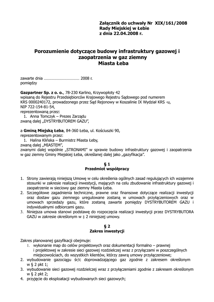 Załącznik do uchwały Nr XIX/161/2008 Rady Miejskiej w Łebie z dnia 22.04.2008 r. Porozumienie dotyczące budowy infrastruktury gazowej i zaopatrzenia w gaz ziemny Miasta Łeba zawarte dnia …………………………… 2008 r. pomiędzy Gazpartner Sp. z o. o., 78-230 Karlino, Krzywopłoty 42 wpisaną do Rejestru Przedsiębiorców Krajowego Rejestru Sądowego pod numerem KRS 0000240172, prowadzonego przez Sąd Rejonowy w Koszalinie IX Wydział KRS -u, NIP 722-154-81-54, reprezentowaną przez: 1. Anna Tomczyk – Prezes Zarządu zwaną dalej „DYSTRYBUTOREM GAZU”, a Gminą Miejską Łeba, 84-360 Łeba, ul. Kościuszki 90, reprezentowanym przez: 1. Halina Klińska – Burmistrz Miasta Łeby, zwaną dalej „MIASTEM”, zwanymi dalej wspólnie „STRONAMI” w sprawie budowy infrastruktury gazowej i zaopatrzenia w gaz ziemny Gminy Miejskiej Łeba, określanej dalej jako „gazyfikacja”. §1 Przedmiot współpracy 1. Strony zawierają niniejszą Umowę w celu określenia ogólnych zasad regulujących ich wzajemne stosunki w zakresie realizacji inwestycji, mających na celu zbudowanie infrastruktury gazowej i zaopatrzenie w sieciowy gaz ziemny Miasta Łeba. 2. Szczegółowe zagadnienia techniczne, prawne oraz finansowe dotyczące realizacji inwestycji oraz dostaw gazu ziemnego uregulowane zostaną w umowach przyłączeniowych oraz w umowach sprzedaży gazu, które zostaną zawarte pomiędzy DYSTRYBUTOREM GAZU i indywidualnymi odbiorcami gazu. 3. Niniejsza umowa stanowi podstawę do rozpoczęcia realizacji inwestycji przez DYSTRYBUTORA GAZU w zakresie określonym w § 2 niniejszej umowy. §2 Zakres inwestycji Zakres planowanej gazyfikacji obejmuje: 1. wykonanie map do celów projektowych oraz dokumentacji formalno – prawnej i projektowej w zakresie sieci gazowej rozdzielczej wraz z przyłączami w poszczególnych miejscowościach, do wszystkich klientów, którzy zawrą umowy przyłączeniowe; 2. wybudowanie gazociągu śr/c doprowadzającego gaz zgodnie z zakresem określonym w § 2 pkt 1; 3. wybudowanie sieci gazowej rozdzielczej wraz z przyłączeniami zgodnie z zakresem określonym w § 2 pkt 2; 4. przyjęcie do eksploatacji wybudowanych sieci gazowych; 5. obsługę odbiorców gazu; 6. organizację Gazowego Pogotowia Technicznego oraz edukację techniczną miejscowej ludności na terenie gazyfikowanej części powiatu lęborskiego. §3 Harmonogram prac STRONY ustalają następujący harmonogram czasowo – zadaniowy dotyczący gazyfikacji: 1. Wykonanie dokumentacji formalno – prawnej i dokumentacji projektowej w zakresie określonym w § 2 pkt 1 i pkt 2 w terminie do dnia 31.12.2008 r. ( ok. 3 miesiące od uzyskania decyzji lokalizacyjnej ) 2. Wybudowanie sieci gazowych w zakresie określonym w § 2 ust. 3 i ust. 4 w terminie do dnia 30.06.2009 r. ( ok. 3 miesiące od uzyskania pozwolenia na budowę ) 3. Przyjęcie do eksploatacji wybudowanych sieci gazowych na podstawie zawartych umów o przyłączenie zgodnie z ustawą z dnia 10.04.1997 r. Prawo energetyczne (Dz. U. z 2006 r., Nr 89, poz. 625 z późn. zm.). 4. Uruchomienie Gazowego Pogotowia Technicznego na terenie gazyfikowanej części powiatu lęborskiego do dnia 30.06.2009 r. §4 Zakres zobowiązań i kompetencji STRONY ustalają następujący zakres zobowiązań i kompetencji w podjętym zadaniu inwestycyjnym związanym z gazyfikacją. I. Zobowiązania MIASTA: 1. MIASTO zobowiązuje się do wyznaczenia osoby z ramienia MIASTA Koordynatora ds. gazyfikacji odpowiedzialnego za pomoc w uzgodnieniu dokumentacji formalno – prawnej, w szczególności uzbrojenia podziemnego należącego do MIASTA, 2. MIASTO zobowiązuje się do: a) Wprowadzenie zmiany w § 1 ust.3 uchwały nr III/18/2006 Rady Miejskiej w Łebie z dnia 28.12.2006 r. w sprawie ustalenia wysokości stawek opłaty za zajęcie pasa drogowego dla dróg gminnych na obszarze miasta Łeby polegającej na wprowadzeniu stawek obniżonych o 50 % w przypadku umieszczania w pasie drogowym urządzeń gazowych (analogicznie do sieci wodociągowych i kanalizacyjnych), b) corocznego przedłożenia przez Burmistrza Radzie Miasta projektu w sprawie zwolnienia DYSTRYBUTORA GAZU z podatku od nieruchomości powstałej w wyniku realizacji inwestycji opisanej w §1 przez okres 10 lat, po corocznym złożeniu wniosku o zwolnienie z podatku od nieruchomości DYSTRYBUTORA GAZU, II. Zobowiązania DYSTRYBUTORA GAZU: 1. DYSTRYBUTOR GAZU zobowiązuje się do zapewnienia dostawy gazu ziemnego, 2. DYSTRYBUTOR GAZU zobowiązuje się do sfinansowania dokumentacji projektowej sieci gazowej w zakresie określonym w § 2 ust. 1 i ust. 2, 3. DYSTRYBUTOR GAZU zobowiązuje się do sfinansowania budowy sieci gazowych w zakresie określonym w § 2 ust. 3 i ust. 4, 4. DYSTRYBUTOR GAZU zobowiązuje się do przyjęcia do eksploatacji wybudowanych sieci gazowych na podstawie zawartych umów o przyłączenie z mieszkańcami ww. miejscowości zgodnie z ustawą Prawo energetyczne. 5. DYSTRYBUTOR GAZU zobowiązuje się do zorganizowania Gazowego Pogotowia Technicznego, które zagwarantuje kompleksową obsługę mieszkańców oraz utrzymanie w dbałości wybudowanych sieci gazowych, 6. DYSTRYBUTOR GAZU zobowiązuje się do przeprowadzania akcji informacyjnych mających na celu edukację mieszkańców, 7. DYSTRYBUTOR GAZU zobowiązuje się do prowadzenia dystrybucji gazu i obsługi odbiorców gazu, 8. DYSTRYBUTOR GAZU zobowiązuje się do prowadzenia rachunków inkaso i rozliczeń z odbiorcą gazu na warunkach zawartych w umowie sprzedaży gazu. §5 Klauzula salwatoryjna 1. Jeżeli jakiekolwiek części postanowienia zostałyby uznane przez obie STRONY niniejszej umowy, sąd lub inną właściwą władzę za nieważne lub nie nadające się do wykonania w całości lub części (w tym na skutek niezgodności z prawem obowiązującym na obszarze Unii Europejskiej), inne postanowienia niniejszej umowy i pozostałe części kwestionowanych postanowień pozostaną w mocy. 2. W odniesieniu do postanowień uznanyc