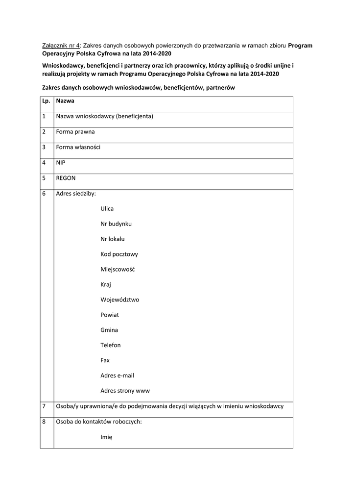 Załącznik nr 4: Zakres danych osobowych powierzonych do przetwarzania w ramach zbioru Program Operacyjny Polska Cyfrowa na lata 2014-2020 Wnioskodawcy, beneficjenci i partnerzy oraz ich pracownicy, którzy aplikują o środki unijne i realizują projekty w ramach Programu Operacyjnego Polska Cyfrowa na lata 2014-2020 Zakres danych osobowych wnioskodawców, beneficjentów, partnerów Lp. Nazwa 1 Nazwa wnioskodawcy (beneficjenta) 2 Forma prawna 3 Forma własności 4 NIP 5 REGON 6 Adres siedziby: Ulica Nr budynku Nr lokalu Kod pocztowy Miejscowość Kraj Województwo Powiat Gmina Telefon Fax Adres e-mail Adres strony www 7 Osoba/y uprawniona/e do podejmowania decyzji wiążących w imieniu wnioskodawcy 8 Osoba do kontaktów roboczych: Imię Nazwisko Numer telefonu Adres e-mail Numer faksu Adres Ulica Nr budynku Nr lokalu Kod pocztowy Miejscowość 9 Partnerzy 10 Nazwa organizacji/instytucji 11 Forma prawna 12 Forma własności 13 NIP 14 REGON 15 Adres siedziby: Ulica Nr budynku Nr lokalu Kod pocztowy Miejscowość Kraj Województwo Powiat Gmina Telefon Fax Adres e-mail Adres strony www 16 Osoba/y uprawniona/e do podejmowania decyzji wiążących w imieniu partnera 17 Symbol partnera Dane pracowników zaangażowanych w przygotowanie i realizację projektów, oraz dane pracowników instytucji zaangażowanych we wdrażanie Programu Operacyjnego Polska Cyfrowa 2014 2020, którzy zajmują się obsługą projektów Lp. Nazwa 1 Imię 2 Nazwisko 3 Adres e-mail 4 Rodzaj użytkownika 6 Miejsce pracy 7 Numer telefonu 9 Nazwa wnioskodawcy/beneficjenta Dane dotyczące personelu projektu Lp. Nazwa 1 Imię 2 Nazwisko 3 PESEL 4 Forma zaangażowania w projekcie 5 Okres zaangażowania osoby w projekcie 6 Wymiar czasu pracy 7 Godziny czasu pracy Uczestnicy szkoleń, konkursów, konferencji, grup roboczych i Komitetu Monitorującego POPC Lp. Nazwa 1 Imię 2 Nazwisko 3 Nazwa instytucji/organizacji 4 Adres e-mail 5 Specjalne potrzeby 6 Nr telefonu Załącznik nr 5: Zakres danych osobowych powierzonych do przetwarzania w ramach zbioru Centralny system teleinformatyczny wspierający realizację programów operacyjnych. Zakres danych osobowych użytkowników wnioskodawców, beneficjentów/partnerów Lp. Centralnego systemu teleinformatycznego, Nazwa Użytkownicy Centralnego systemu teleinformatycznego ze strony instytucji zaangażowanych w realizację programów 1 Imię 2 Nazwisko 3 Miejsce pracy 4 Adres e-mail 5 Login Użytkownicy Centralnego systemu teleinformatycznego ze strony beneficjentów/partnerów projektów (osoby uprawnione do podejmowania decyzji wiążących w imieniu beneficjenta/partnera) 1 Imię 2 Nazwisko 3 Telefon 4 Adres e-mail 5 Kraj 6 PESEL Wnioskodawcy 1 Nazwa wnioskodawcy 2 Forma prawna 3 Forma własności 4 NIP 5 Kraj 6 Adres: Ulica Nr budynku Nr lokalu Kod pocztowy Miejscowość Telefon Fax Adres e-mail Beneficjenci/ Partnerzy 1 Nazwa beneficjenta/partnera 2 Forma prawna beneficjenta /partnera 3 Forma własności 4 NIP 5 REGON 6 Adres: Ulica Nr budynku Nr lokalu Kod pocztowy Miejscowość Telefon Fax Adres e-mail 7 Kraj 8 Numer rachunku beneficjenta/odbiorcy Dane uczestników instytucjonalnych (osób fizycznych prowadzących jednostkową działalność gospodarczą) Lp. Nazwa 1 Kraj 2 Nazwa instytucji 3 NIP 4 Typ instytucji 5 Województwo 6 Powiat 7 Gmina 8 Miejscowość 9 Ulica 10 Nr budynku 11 Nr lokalu 12 Kod pocztowy 13 Obszar wg stopnia urbanizacji (DEGURBA) 15 Telefon kontaktowy 16 Adres poczty elektronicznej (e-mail) 17 Data rozpoczęcia udziału w projekcie 18 Data zakończenia udziału w projekcie 19 Czy wsparciem zostali objęci pracownicy instytucji 20 Rodzaj przyznanego wsparcia 21 Data rozpoczęcia udziału we wsparciu 22 Data zakończenia udziału we wsparciu Dane dotyczące personelu projektu Lp. Nazwa 1 Imię 2 Nazwisko 3 Kraj 4 PESEL 5 Forma zaangażowania 6 Okres zaangażowania w projekcie 7 Wymiar czasu pracy 8 Stanowisko Wykonawcy realizujący umowy o zamówienia publiczne, których dane przetwarzane będą w związku z badaniem kwalifikowalności środków w projekcie (osoby fizyczne prowadzące działalność gospodarczą) Lp. Nazwa 1 Nazwa wykonawcy 2 Kraj 3 NIP wykonawcy Załącznik nr 6: Wzór upoważnienia do przetwarzania powierzonych do przetwarzania danych osobowych UPOWAŻNIENIE Nr ……… do przetwarzania powierzonych do przetwarzania danych osobowych Z dniem…..…r na podstawie art. 37 w związku z art. 31 ustawy z dnia 29 sierpnia 1997 r. o ochronie danych osobowych (Dz. U. z 2015 r. poz. 2135 i 2281), upoważniam Pana/nią*………………………………………….. do przetwarzania danych osobowych powierzonych do przetwarzania przez Ministerstwo Rozwoju na podstawie Porozumienia z dnia……………………. w ramach zbioru Program Operacyjny Polska Cyfrowa na lata 2014-2020; (pieczątka i podpis Administratora Bezpieczeństwa Informacji lub osoby upoważnionej do wydawania upoważnienia) Oświadczam, że zapoznałem/am się z przepisami dotyczącymi ochrony danych osobowych, w tym z ustawą z dnia 29 sierpnia 1997 r. o ochronie danych osobowych (Dz. U. z 2015 r. poz. 2135 i 2281), a także z obowiązującymi w ….. ………Polityką Bezpieczeństwa Ochrony Danych Osobowych oraz Instrukcją zarządzania systemem informatycznym służącym do przetwarzania danych osobowych i zobowiązuję się do przestrzegania zasad przetwarzania danych osobowych określonych w tych dokumentach. Zobowiązuję się do zachowania w tajemnicy przetwarzanych danych osobowych, z którymi zapoznałem się oraz sposobów ich zabezpieczania, zarówno w okresie zatrudnienia w ……….., jak też po jego ustaniu. Upoważnienie wygasa z chwilą ustania zatrudnienia Pana/Pani* w……………………………………………………………………lub z chwilą jego odwołania. …………………………………………… (czytelny podpis osoby upoważnionej) Upoważnienie otrzymałem/am ………………………………… miejscowość, data, pod