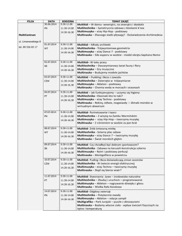 FILIA DATA 30.06.2014 GODZINA 9.30-11.00 PN 11.30-14.00 14.30-16.30 MultiCentrum TEMAT ZAJĘĆ Multikid – W domu- wewnątrz, na zewnątrz i dookoła Multitechnika – Symetryczna zabawa z klockami k’nex Multimuzyka – eJay Hip-Hop - podstawy Multinauka – Dlaczego statki pływają? - Doświadczenie Archimedesa ul. Limanowskiego 8 tel. 89 526 65 17 01.07.2014 9.30-11.00 WT 11.30-14.00 14.30-16.30 02.07.2014 9.30-11.00 SR 11.30-14.00 14.30-16.30 03.07.2014 9.30-11.00 CZW 11.30-14.00 14.30-16.30 04.07.2014 9.30-11.00 PT 11.30-14.00 14.30-16.30 07.07.2014 9.30-11.00 PN 11.30-14.00 14.30-16.30 08.07.2014 9.30-11.00 WT 11.30-14.00 14.30-16.30 09.07.2014 9.30-11.00 ŚR 11.30-14.00 14.30-16.30 10.07.2014 9.30-11.00 CZW 11.30-14.00 14.30-16.30 11.07.2014 9.30-11.00 PT 11.30-14.00 14.30-16.30 14.07.2014 9.30-11.00 PN 11.30-14.00 14.30-16.30 Multikid – Młody architekt Multitechnika - Trójwymiarowa geometria Multimuzyka – eJay Dance 7 - podstawy Multinauka – Siła wyporu w wodzie - model okrętu kapitana Nemo Multikid– W toku pracy Multitechnika – Dwuwymiarowy świat fauny i flory Multimuzyka – Gry muzyczne Multinauka – Budujemy modele jachtów Multikid – Pudding i Beza z zawodu Multitechnika – Zwierzęta w trójwymiarze Multimuzyka – Ableton - podstawy Multinauka – Chemia wody w morzach i oceanach Multikid – Jak funkcjonujemy – uczymy się higieny Multitechnika –Ekoznaki-kto to taki? Multimuzyka – eJay Techno - podstawy Multinauka – Rekiny, żółwie, rozgwiazdy i ślimaki morskie w wirtualnym akwarium Multikid- Portretowanie i twarz Multitechnika – Z wizytą na Zamku Warmińskim Multimuzyka – eJay Hip-Hop – tworzymy muzykę Multinauka – Z ciśnieniem w wodzie za pan brat Multikid- Zrób śmieszną minkę Multitechnika - Solarny plac zabaw Multimuzyka – eJay Dance 7 – tworzymy muzykę Multinauka – Świat morskich głębin Multikid- Czy chciałbyś być dobrym sportowcem? Multitechnika - Zabawa na karuzeli-konstrukcja solarna Multimuzyka – Rytm i podstawy perkusji Multinauka – Montgolfiera w powietrzu Multikid- Puding i Beza doświadczają zmian sezonów Multitechnika - W świecie energii elektrycznej Multimuzyka – eJay Techno – tworzymy muzykę Multinauka – Skąd się bierze wiatr? Multikid- Stworzenia żywe – środowisko naturalne Multitechnika – Zbuduj i uruchom – programowanie Multimuzyka – Ableton – nagrywanie dźwięku i głosu Multinauka – Wielka Rafa Koralowa Multikid- Odgłosy zwierząt Multitechnika – Pożyteczne owady Multimuzyka – Ableton – edycja sampli Multigrafika – Park Jurajski – puzzle z dinozaurami Multinauka – Badamy własne ciało - wpływ ćwiczeń fizycznych na tętno i temperaturę 15.07.2014 9.30-11.00 WT 11.30-14.00 14.30-16.30 16.07.2014 9.30-11.00 SR 11.30-14.00 14.30-16.30 17.07.2014 9.30-11.00 CZW 11.30-14.00 14.30-16.30 18.07.2014 9.30-11.00 PT 11.30-14.00 14.30-16.30 21.07.2014 9.30-11.00 PN 11.30-14.00 14.30-16.30 22.07.2014 9.30-11.00 WT 11.30-14.00 14.30-16.30 23.07.2014 9.30-11.00 SR 11.30-14.00 14.30-16.30 24.07.2014 9.30-11.00 CZW 11.30-14.00 14.30-16.30 25.07.2014 9.30-11.00 PT 11.30-14.00 DNI JAKUBOWE 14.30-16.30 28.07.2014 9.30-11.00 PN 11.30-14.00 14.30-16.30 Multikid- Kolejność etapów rozwoju motyli Multitechnika – Roboty XXI wieku Multimuzyka – Ableton – tworzenie sampli z utworów Multigrafika – W krzywym zwierciadle - zajęcia z programem Kai's Super Goo Multinauka – Czy woda morska przewodzi prąd? Multikid- Barwy motyli Multitechnika – Kosmiczna podróż rakietą 2D Multimuzyka – Ableton – gramy na żywo (sample) Multigrafika – Kolorowy świat - kolorowanki Multinauka – Zabawy ze światłem spójnym i niespójnym Multikid- Zabawa z cieniem Multitechnika – Eko auta z klocków K’nex Multimuzyka – Muzyczne gry Multigrafika – Pocztówki z wakacji - fotomontaż Multinauka – Ogniwa elektryczne-jak to działa? Multikid- Szukaj aż znajdziesz-wizyta w laboratorium Multitechnika – Wyścigi napędzane słońcem Multimuzyka – Ableton – wirtualne instrumenty Multigrafika – Kto dogoni psa – jak widzi pies – zabawy z kolorami Multinauka – Zróbmy sobie nasze EKG Multikid- Urządzenia elektryczne Multitechnika – Pływamy łodzią z napędem kołowym Multimuzyka – Ableton – wirtualne instrumenty cz.II Multigrafika – Wesoła ferma – zajęcia rysunkowe Multinauka – Złudzenia optyczne Multikid- Obwód elektryczny Multitechnika - Znaczenie koła w przemyśle-mechanizm dźwigni Multimuzyka – Ableton - remix Multigrafika – Wakacje z duchami - malowanie światłem Multinauka – Jak działa termometr? Multikid- Zapal żarówkę Multitechnika - Poznajemy elementy roweru-przekładnia Multimuzyka – Ableton – remix cz.II Multigrafika – Alfabet świetlny – malowanie światłem Multinauka – Ładunki są wśród nas. Elektrostatyka Multikid- Nawyki higieniczne , które każdy powinien sobie przyswojć Multitechnika - Rowerem na plażę-konstrukcje wykorzystujące energię solarną Multimuzyka – eJay Hip-Hop - efekty Multigrafika – Układ solarny – zajęcia z wykorzystaniem masek w programie ArtRage Multinauka – Pomiar prędkości dźwięku w Multicentrum Multikid- Puding balony i liczby Multitechnika – Zabytkowy Olsztyn Multimuzyka – Ableton – gramy (kontroler) Multigrafika – Za miastem – zajęcia z wykorzstaniem gotowych obiektów w programie ArtRage Multinauka – Gdzie spotkamy drugą zasadę Newtona? Multitechnika - Na placu zabaw – konstrukcje wykorzystujące energię wiatrową Multimuzyka – Zabawy z głosem Multigrafika – Podróż marzeń – zajęcia z wykorzystaniem aparatu cyfrowego i programu ArtRage Multinauka – Zabawy z dźwiękiem-budujemy kamertony 29.07.2014 9.30-11.00 WT 11.30-14.00 14.30-16.30 30.07.2014 9.30-11.00 SR 11.30-14.00 14.30-16.30 31.07.2014 9.30-11.00 CZW 11.30-14.00 14.30-16.30 Multitechnika - Zabawy z zieloną energię-wiatrak Multimuzyka – Instrumenty muzyczne Mul