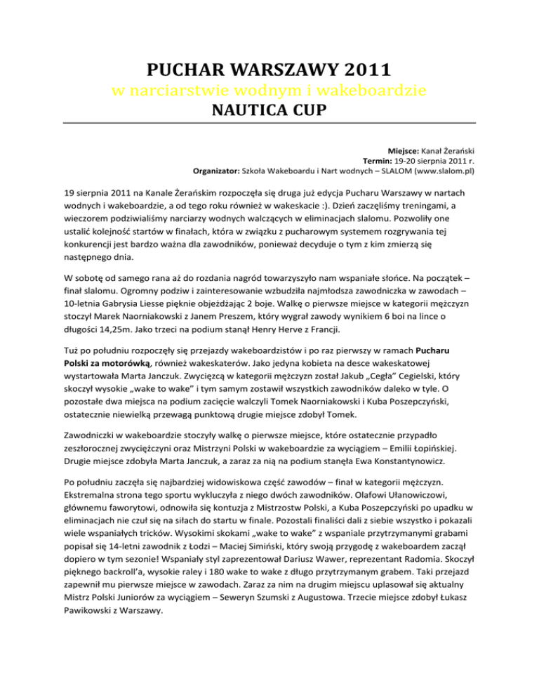 PUCHAR WARSZAWY 2011 w narciarstwie wodnym i wakeboardzie NAUTICA CUP Miejsce: Kanał Żerański Termin: 19-20 sierpnia 2011 r. Organizator: Szkoła Wakeboardu i Nart wodnych – SLALOM (www.slalom.pl) 19 sierpnia 2011 na Kanale Żerańskim rozpoczęła się druga już edycja Pucharu Warszawy w nartach wodnych i wakeboardzie, a od tego roku również w wakeskacie :). Dzień zaczęliśmy treningami, a wieczorem podziwialiśmy narciarzy wodnych walczących w eliminacjach slalomu. Pozwoliły one ustalić kolejność startów w finałach, która w związku z pucharowym systemem rozgrywania tej konkurencji jest bardzo ważna dla zawodników, ponieważ decyduje o tym z kim zmierzą się następnego dnia. W sobotę od samego rana aż do rozdania nagród towarzyszyło nam wspaniałe słońce. Na początek – finał slalomu. Ogromny podziw i zainteresowanie wzbudziła najmłodsza zawodniczka w zawodach – 10-letnia Gabrysia Liesse pięknie objeżdżając 2 boje. Walkę o pierwsze miejsce w kategorii mężczyzn stoczył Marek Naorniakowski z Janem Preszem, który wygrał zawody wynikiem 6 boi na lince o długości 14,25m. Jako trzeci na podium stanął Henry Herve z Francji. Tuż po południu rozpoczęły się przejazdy wakeboardzistów i po raz pierwszy w ramach Pucharu Polski za motorówką, również wakeskaterów. Jako jedyna kobieta na desce wakeskatowej wystartowała Marta Janczuk. Zwycięzcą w kategorii mężczyzn został Jakub „Cegła” Cegielski, który skoczył wysokie „wake to wake” i tym samym zostawił wszystkich zawodników daleko w tyle. O pozostałe dwa miejsca na podium zacięcie walczyli Tomek Naorniakowski i Kuba Poszepczyński, ostatecznie niewielką przewagą punktową drugie miejsce zdobył Tomek. Zawodniczki w wakeboardzie stoczyły walkę o pierwsze miejsce, które ostatecznie przypadło zeszłorocznej zwyciężczyni oraz Mistrzyni Polski w wakeboardzie za wyciągiem – Emilii Łopińskiej. Drugie miejsce zdobyła Marta Janczuk, a zaraz za nią na podium stanęła Ewa Konstantynowicz. Po południu zaczęła się najbardziej widowiskowa część zawodów – finał w kategorii mężczyzn. Ekstremalna strona tego sportu wykluczyła z niego dwóch zawodników. Olafowi Ułanowiczowi, głównemu faworytowi, odnowiła się kontuzja z Mistrzostw Polski, a Kuba Poszepczyński po upadku w eliminacjach nie czuł się na siłach do startu w finale. Pozostali finaliści dali z siebie wszystko i pokazali wiele wspaniałych tricków. Wysokimi skokami „wake to wake” z wspaniale przytrzymanymi grabami popisał się 14-letni zawodnik z Łodzi – Maciej Simiński, który swoją przygodę z wakeboardem zaczął dopiero w tym sezonie! Wspaniały styl zaprezentował Dariusz Wawer, reprezentant Radomia. Skoczył pięknego backroll’a, wysokie raley i 180 wake to wake z długo przytrzymanym grabem. Taki przejazd zapewnił mu pierwsze miejsce w zawodach. Zaraz za nim na drugim miejscu uplasował się aktualny Mistrz Polski Juniorów za wyciągiem – Seweryn Szumski z Augustowa. Trzecie miejsce zdobył Łukasz Pawikowski z Warszawy. Chwilę po ostatnim przejeździe finałowym odbyła się dekoracja zwycięzców. Każdy z nich otrzymał unikalne puchary przygotowane specjalnie na tę okazję i nagrody rzeczowe (zegarki NAUTICA, gadżety BMW, kapoki i czapki od sklepu Surf7, słuchawki ScullCandy, iPoda Shuffle i wiele innych). W zawodach wzięło udział 27 zawodników z 8 klubów z całej Polski. W tym roku również na brzegu nie brakowało atrakcji. Można było poznać specyfikację, a nawet osobiście wypróbować BMW X1! Zjeść pyszne mięso z grilla przygotowane przez restaurację Via Verde i podziwiać przejazdy zawodników leżąc na wygodnych leżakach dostarczonych przez 19 Dzielnicę. Całość imprezy była nagłośniona dzięki chłopakom ze S.P.A.. Oprawę muzyczną zapewniło Antyradio, a komentowaniem co się dzieje na akwenie i jak zwykle wspaniałym kontaktem z publicznością popisał się Seweryn Majkowski. Oczywiście zawody nie odbyłyby się bez sędziów – w slalomie byli to Grażyna i Jacek Naorniakowscy, natomiast w wake’u – Marek Łojek i Przemo Kuc. Bardzo serdecznie dziękujemy im za udział. Podziękowania należą się również wszystkim sponsorom – firmom: NAUTICA, Dealer BMW Bawaria Motors, 19dzielnica, Surf7.pl, Scullcandy, Partnerom S.P.A. I oczywiście patronowi medialnemu: Antyradio W trakcie zawodów odwiedziły nas następujące media: OrangeSport, TVP (Teleexpress i Teleplotki), oognet i NEXT 3D Puchar Warszawy w tym roku odbył się po raz drugi i mamy nadzieję, że było przynajmniej tak samo fajnie jak w zeszłym roku – na pewno nie były to nasze ostatnie zawody! :). Do zobaczenia za rok! Magda i Tomek