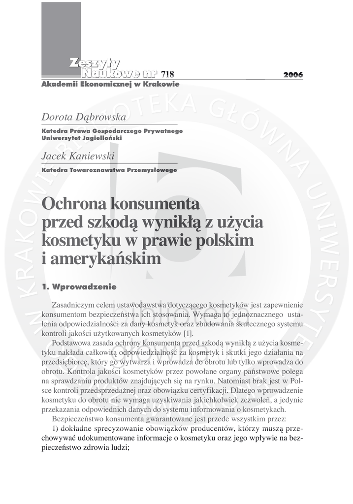 Zeszyty Naukowe nr 718 Akademii Ekonomicznej w Krakowie 2006 Dorota Dąbrowska Katedra Prawa Gospodarczego Prywatnego Uniwersytet Jagielloński Jacek Kaniewski Katedra Towaroznawstwa Przemysłowego Ochrona konsumenta przed szkodą wynikłą z użycia kosmetyku w prawie polskim i amerykańskim 1. Wprowadzenie Zasadniczym celem ustawodawstwa dotyczącego kosmetyków jest zapewnienie konsumentom bezpieczeństwa ich stosowania. Wymaga to jednoznacznego ustalenia odpowiedzialności za dany kosmetyk oraz zbudowania skutecznego systemu kontroli jakości użytkowanych kosmetyków [1]. Podstawowa zasada ochrony konsumenta przed szkodą wynikłą z użycia kosmetyku nakłada całkowitą odpowiedzialność za kosmetyk i skutki jego działania na przedsiębiorcę, który go wytwarza i wprowadza do obrotu lub tylko wprowadza do obrotu. Kontrola jakości kosmetyków przez powołane organy państwowe polega na sprawdzaniu produktów znajdujących się na rynku. Natomiast brak jest w Polsce kontroli przedsprzedażnej oraz obowiązku certyfikacji. Dlatego wprowadzenie kosmetyku do obrotu nie wymaga uzyskiwania jakichkolwiek zezwoleń, a jedynie przekazania odpowiednich danych do systemu informowania o kosmetykach. Bezpieczeństwo konsumenta gwarantowane jest przede wszystkim przez: 1) dokładne sprecyzowanie obowiązków producentów, którzy muszą przechowywać udokumentowane informacje o kosmetyku oraz jego wpływie na bezpieczeństwo zdrowia ludzi; 50 Dorota Dąbrowska, Jacek Kaniewski 2) ustalenie listy substancji niedozwolonych i dozwolonych do stosowania w kosmetykach w ograniczonych ilościach oraz listy dozwolonych do stosowania barwników, substancji konserwujących i substancji promieniochronnych; 3) ujednolicenie procedur przeprowadzania badań laboratoryjnych kosmetyków; 4) organizację krajowego systemu informacji o kosmetykach oraz gromadzenie danych o niepożądanych skutkach dla zdrowia ludzi; 5) informację dostarczaną konsumentowi w postaci wykazu składników, instrukcji prawidłowego użytkowania kosmetyku oraz dodatkowych ostrzeżeń, opisujących cechy kosmetyku oraz sytuacje, których należy unikać, tak by cechy te nie doprowadziły do powstania niebezpieczeństwa; 6) bieżącą kontrolę kosmetyków wprowadzonych do obrotu rynkowego; 7) system sankcji prawnych nakładanych na producentów i dystrybutorów nie przestrzegających zasad bezpieczeństwa. W ostatnich latach polskie ustawodawstwo kosmetyczne zostało dostosowane do wymogów prawa Unii Europejskiej i jest spójne z ustawodawstwem wszystkich państw należących do Unii. Natomiast pomiędzy prawem polskim i amerykańskim z tego zakresu występuje szereg podobieństw, ale istnieją też różnice, których wskazanie może być pomocne w ocenie ustawodawstwa europejskiego na tle innych systemów prawnych, w zakresie prawa kosmetyków [4, 16, 17]. Celem opracowania jest porównanie elementów ochrony konsumenta, które wiążą się z kosmetykami funkcjonującymi w obrocie i użytkowaniu, z pominięciem sankcji nakładanych na producentów i dystrybutorów oraz zasad odpowiedzialności odszkodowawczej w razie wyrządzenia konsumentowi szkody. 2. Podstawy prawne W Polsce podstawowym aktem prawnym dotyczącym kosmetyków jest Ustawa z dnia 30 marca 2001 r. o kosmetykach [33]. Ustawa ta dostosowuje polskie prawo kosmetyczne do standardów europejskich wyznaczonych treścią tzw. dyrektywy kosmetycznej, tj. Dyrektywy 76/768/EWG z dnia 27 lipca 1976 r. [14]. Normuje ona swobodny obrót środkami kosmetycznymi w ramach Unii, wprowadzając jednocześnie gwarancje bezpieczeństwa tych środków. Dyrektywa określa wymogi, które musi spełnić kosmetyk, by mógł być wprowadzony do obrotu. Dyrektywa stanowi, że kosmetyk nie może zawierać substancji wymienionych w aneksach jako składniki zabronione. Nie może też zawierać barwników, konserwantów oraz substancji promieniochronnych innych niż te, które znajdują się w aneksach na listach składników dopuszczonych do stosowania. Listy te opracowywane są przez unijną komisję, w skład której wchodzą przedstawiciele ministerstw zdrowia państw członkowskich. Komisja współpracuje z przedstawicielami środowisk Ochrona konsumenta przed szkodą… 51 naukowych, reprezentantami przemysłu oraz przedstawicielami agencji chroniących prawa konsumenta w poszczególnych państwach członkowskich. Na podstawie konsultacji prowadzonych z wymienionymi podmiotami, listy składników dopuszczonych do stosowania ulegają regularnej nowelizacji. Dyrektywa wymaga także, by producent przechowywał dokumentację dotyczącą składu kosmetyku oraz dokumentację dotyczącą bezpieczeństwa kosmetyku dla zdrowia ludzkiego. Państwa członkowskie Unii mają obowiązek zapewnić na swoich rynkach realizację postanowień dyrektywy, zaś wszystkie kosmetyki spełniające jej wymagania mają równy i nieograniczony dostęp do wszystkich rynków tych państw. W Stanach Zjednoczonych podstawowym aktem prawnym odnoszącym się na szczeblu federalnym do kosmetyków jest Federalna ustawa o żywności, lekach i kosmetykach z 1938 r. [15]. Głównym jej założeniem jest ochrona konsumenta przed szkodliwymi kosmetykami oraz przed producentami wprowadzającymi w błąd użytkownika kosmetyku. Ustawa statuuje wymogi, które musi spełniać kosmetyk i jego opakowanie, aby legalnie funkcjonować na rynku. Podobnie jak w przypadku regulacji europejskiej ustawa zawiera wymogi pozytywne, które muszą być spełnione, określając równocześnie praktyki, których producentowi stosować nie wolno. W załącznikach do ustawy określono substancje zakazane w produkcji kosmetyków. Natomiast w załączniku z 1960 r. [7] wymieniono barwniki, których używanie w produkcji kosmetyku jest dozwolone. Wszelkich innych barwników stosować nie wolno. 3. Organy i organizacje Spośród polskich instytucji publicznych zdrowie konsumenta chronią: 1) Państwowa Inspekcja Sanitarna, która na bieżąco kontroluje 