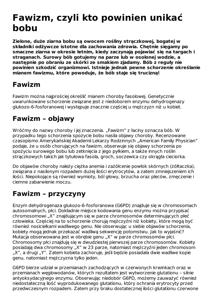 Fawizm, czyli kto powinien unikać bobu Zielone, duże ziarna bobu są owocem rośliny strączkowej, bogatej w składniki odżywcze istotne dla zachowania zdrowia. Chętnie sięgamy po smaczne ziarna w okresie letnim, kiedy zaczynają pojawiać się na targach i straganach. Surowy bób gotujemy na parze lub w osolonej wodzie, a następnie po obraniu ze skórki ze smakiem zjadamy. Bób z reguły nie powinien szkodzić organizmowi. Istnieje jednak pewne schorzenie określanie mianem fawizmu, które powoduje, że bób staje się trucizną! Fawizm Fawizm można najprościej określić mianem choroby fasolowej. Genetycznie uwarunkowane schorzenie związane jest z niedoborem enzymu dehydrogenazy glukozo-6-fosforanowej i występuje znacznie częściej u mężczyzn niż u kobiet. Fawizm – objawy Wróćmy do nazwy choroby i jej znaczenia. „Fawizm” z łaciny oznacza bób. W przypadku tego schorzenia spożycie bobu nasila objawy choroby. Recenzowane czasopismo Amerykańskiej Akademii Lekarzy Rodzinnych „American Family Physician” podaje, że u osób chorujących na fawizm, obserwuje się objawy schorzenia po spożyciu surowego bobu lub zetknięcia z jego pyłkiem, a także innych roślin strączkowych takich jak tytułowa fasola, groch, soczewica czy okrągła cieciorka. Do objawów choroby należy ciężka anemia i zażółcenie powłok skórnych (żółtaczka), związana z nasilonym rozpadem dużej ilości erytrocytów, a zatem zmniejszeniem ich ilości. Niepokojące są również wymioty, ból głowy, brzucha oraz pleców, zmęczenie i ciemne zabarwienie moczu. Fawizm – przyczyny Enzym dehydrogenaza glukozo-6-fosforanowa (G6PD) znajduje się w chromosomach autosomalnych, płci. Dokładnie miejsce kodowania genu enzymu można przypisać chromosomowi „X” znajdującym się w parze chromosomów determinujących płeć człowieka. Częściej na to schorzenie chorują mężczyźni niż kobiety, które mogą być również nosicielkami wadliwego genu. Nie obserwując u siebie objawów schorzenia, kobiety mogą jednak przekazać wadliwą sekwencję potomstwu. Jak to wyjaśnić? Mutacja obserwowana jest w obrębie genu „X” w parze chromosomów płci. Chromosomy płci znajdują się w dwudziestej pierwszej parze chromosomów. Kobiety posiadają dwa chromosomy „X” w 23 parze, natomiast mężczyźni jeden chromosom „X”, a drugi „Y”. Zatem kobieta zachoruje, jeśli będzie posiadała dwie wadliwe kopie genu, natomiast mężczyzna tylko jeden. G6PD bierze udział w przemianach zachodzących w czerwonych krwinkach oraz w przemianach węglowodanów, których rezultatem jest wytworzenie glutationu – silnie antyoksydacyjnego enzymu. Obserwując niedobór G6PD, możemy zauważyć również niedostateczną ilość wyprodukowanego glutationu, który ochrania erytrocyty przed przedwczesnym rozpadem. Zatem przy braku dostatecznej ilości glutationu czerwone krwinki rozpadają się, czego skutkiem jest obserwowana w badaniach morfologicznych krwi tętniczej anemia oraz widoczna żółta barwa powłok skórnych. Pozostałe objawy takie jak ból głowy, wymioty czy zmęczenie są wynikiem anemii. Fawizm – czynniki ryzyka Fawizm jest chorobą dziedziczną, a matka może przekazać dziecku wadliwy gen. Znacznie częściej chorują mężczyźni niż kobiety. Ponadto schorzenie znacznie częściej obserwowane jest u mieszkańców okolic Morza Śródziemnego, Afryki oraz Azji. Fawizm rozpoznaje się u ok. 0,1% Polaków. Zachęcam więc, aby nie wykluczać ze swojej diety cennych w składniki odżywcze roślin strączkowych, jeśli nie ma ku temu przeciwwskazań. Spożywanie ich w alternatywie do różnych gatunków mięs, pozwoli odkryć nowe wymiary smaków, jak i sprawić, że nasza dieta będzie różnorodna, smaczna i zdrowa! Literatura: „Gorączka, żółtaczka, wymioty, bóle głowy, brzucha i pleców oraz groźna niedokrwistość – taki może być efekt zjedzenia bobu przez osobę cierpiącą na fawizm. Na czym polega to schorzenie?”; American Family Physician „Fawizm – kiedy bób staje się niebezpieczny”; Justyna Bylinowska ; 07/07/2013 „Niedobór dehydrogenazy glukozo-6-fosforanowej”;Milena Szewruk Author: Martyna Jaros Link do artykułu: http://bonavita.pl/fawizm-czyli-kto-powinien-unikac-bobu