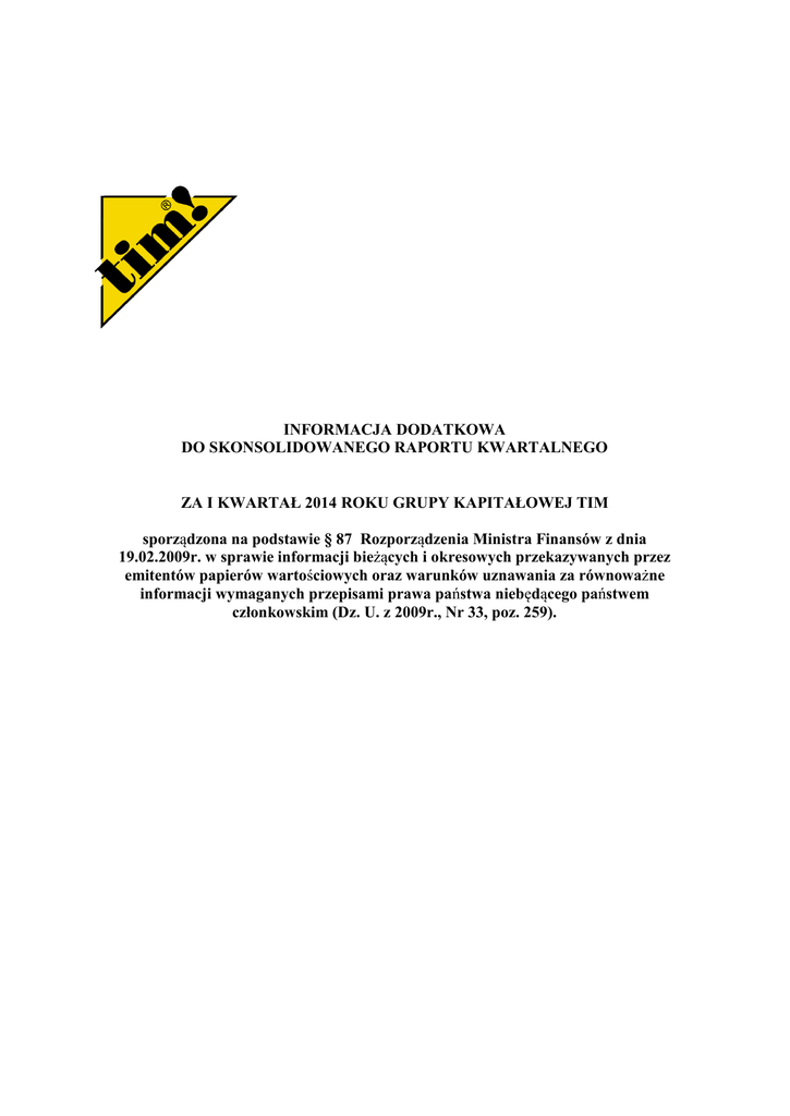 INFORMACJA DODATKOWA DO SKONSOLIDOWANEGO RAPORTU KWARTALNEGO ZA I KWARTAŁ 2014 ROKU GRUPY KAPITAŁOWEJ TIM sporządzona na podstawie § 87 Rozporządzenia Ministra Finansów z dnia 19.02.2009r. w sprawie informacji bieżących i okresowych przekazywanych przez emitentów papierów wartościowych oraz warunków uznawania za równoważne informacji wymaganych przepisami prawa państwa niebędącego państwem członkowskim (Dz. U. z 2009r., Nr 33, poz. 259). 1. Opis zasad (polityki) rachunkowości . Informacje o zasadach przyjętych przy sporządzeniu raportu, w szczególności informacje o zmianach stosowanych zasad (polityki) rachunkowości, oraz informacje o istotnych zmianach wielkości szacunkowych, w tym o korektach z tytułu rezerw, rezerwie i aktywach z tytułu odroczonego podatku dochodowego, o których mowa w ustawie o rachunkowości, dokonanych odpisach aktualizujących wartość składników aktywów są szczegółowo opisane w raporcie rocznym za 2013 r. przekazanym do publicznej wiadomości w dniu 20.03.2014 r. Z dniem 01.01.2007 r. zgodnie z Uchwałą WZA nr 17/24.06.2006 r. z dnia 24.06.2006 r. TIM S.A. wprowadziła do stosowania MSR i MSSF. Skrócone sprawozdanie finansowe za okres od 01.01.2014r. do 31.03.2014r. zostało sporządzone zgodnie z zasadami MSR/MSSF. 2. Zwięzły opis istotnych dokonań lub niepowodzeń Emitenta w okresie, którego dotyczy raport, wraz z wykazem najważniejszych zdarzeń ich dotyczących; TIM SA jest podmiotem dominującym w Grupie Kapitałowej TIM. TIM SA jest jednostką zdecydowanie większą w porównaniu do ROTOPINO.PL SA: przychody ze sprzedaży TIM SA stanowią 93% przychodów ze sprzedaży Grupy Kapitałowej TIM za I kwartał 2014, koszty TIM SA stanowią 93 % kosztów Grupy Kapitałowej TIM za I kwartał 2014 (liczonych jako koszty podstawowej działalności operacyjnej z wyłączeniem wartości sprzedanych towarów i materiałów). Wyniki osiągane przez TIM SA, determinują wyniki Grupy Kapitałowej TIM. W I kwartale bieżącego roku, sprzedaży Grupy Kapitałowej wzrosła o 41%, w porównaniu do analogicznego roku ubiegłego. Decydujący wpływ na wyniki Grupy Kapitałowej TIM, mają wyniki osiągane przez podmiot dominujący, tzn. TIM SA. Wielkość przychodów wygenerowanych przez TIM SA w I kwartale bieżącego roku stanowi 93,2% wartości przychodów całej Grupy Kapitałowej TIM. W związku z powyższym, wzrost sprzedaży w TIM SA o 29.013 tys. PLN - tj. o 43,6 %, zdeterminował wielkość przychodów Grupy Kapitałowej TIM w I kwartale 2013r. TIM SA Wzrost przychodów ze sprzedaży w TIM SA, jest związany z dwoma czynnikami. Czynnik pierwszy to łagodna zima, która pozwoliła na sprzedaż asortymentu inwestycyjnego. Wynik ten byłby trudny do osiągnięcia w normalnych warunkach pogodowych panujących w okresie zimy. Sektor budownictwa dzięki sprzyjającej pogodzie wzrósł w I kwartale o 10,6% (Źródło: Raport GUS - Produkcja Budowlano Montażowa za miesiąc marzec). Czynnik drugi to nowi klienci przekonani do sprzedaży multikanałowej, która oznacza dla klienta zakupy poprzez sklep internetowy ze wsparciem i doradztwem technicznym naszych przedstawicieli handlowych. W kolejnych kwartałach spodziewamy się utrzymania tempa wzrostu przychodów na zbliżonym poziomie. Wzrost poziomu sprzedaży, zmiana oddziałów z lokalnym magazynem na biura handlowe, wzrost ilości produktów występujących w ofercie spółki oraz modernizacja magazynu centralnego uwzględniająca tak duży skokowy wzrost przychodów i perspektywę dalszego rozwoju nie została obojętna dla kosztów spółki. Koszty w I kwartale 2014 roku wyniosły 20.186 tys PLN i były o 5.122 tys PLN wyższe, niż w analogicznym okresie roku ubiegłego. Największy wzrost kosztów związany jest ze wzrostem usług obcych, tj. wzrost o 2.725 tys PLN w stosunku do analogicznego okresu roku ubiegłego. Jest to związane ze wzrostem kosztów transportu. Dodatkowymi kosztami poniesionymi przez TIM SA w omawianym okresie, były koszty likwidacji magazynów lokalnych, czyli relokacja towarów z zamykanych oddziałów do Centrum Logistycznego TIM SA w Siechnicach. Kolejnym znacznym kosztem jest wzrost wynagrodzeń i ubezpieczeń społecznych o 1.395 tys PLN. Wzrost wynika z rosnących prowizji dla służby sprzedażowych TIM SA w związku ze znacznym wzrostem sprzedaży. Ponadto wzrosło zatrudnienia na magazynie centralnym, który umożliwia przejęcie obsługi klienta końcowego z oddziałów, a na oddziałach lokalnych nadal pracują magazynierzy obsługujący magazyny oddziałowe. Na wzrost kosztów wpłynęły również odprawy wypłacane zwalnianym pracownikom magazynów oddziałowych. Dodatkowo nadmienić należy, iż nie zmniejszyły się jeszcze koszty najmu oddziałów lokalnych. Pierwsze efekty obniżenia kosztów w związku z reorganizacją sieci sprzedaży będą widoczne od IV kwartału 2014r, kiedy zakończy się proces ww. reorganizacji. Powyżej omówione czynniki kosztowe przesądziły w głównej mierze o wyniku spółki za I kwartał 2014. Spadek marży procentowej jest przez nas uwzględniany w analizie przyszłych dochodów i nie będzie przesądzał o osiąganych wynikach tak istotnie, jak poziom kosztów. Marża na poziomie 15-16%, a może nawet niższa, jest oczekiwaną marżą handlową w przyszłości. Jednak jej spadek w I kwartale 2014r nie pozostał bez wpływu na wynik. Za I kwartał 2014 spółka TIM S.A. osiągnęła stratę na działalności operacyjnej w wysokości 4.968 tys PLN, natomiast strata netto wyniosła 5.367 tys PLN, są to wyniki dalekie od oczekiwanych, jednak przy tak dużej zmianie wydają się nieuniknione. Zarząd TIM SA na bieżąco monitoruje proces wdrożenia nowej strategii, który jest realizowany. W opinii Zarządu TIM SA aktualnie nie ma zagrożenia dla przyjętego harmonogramu wdrożenia podanego w Sprawozdaniu Zarządu z działalności za rok 2013. Rok 2014 przy utrzymaniu tempa wprowadzanych zmian oraz dynamiki