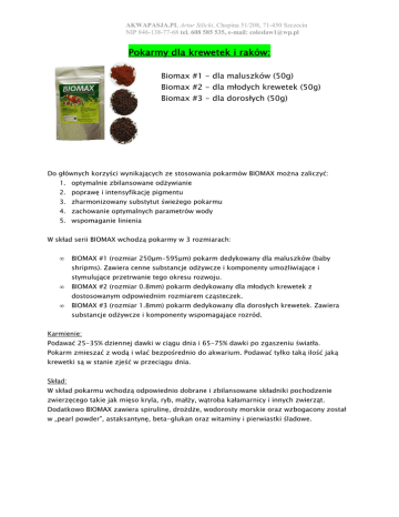 AKWAPASJA.PL Artur Silicki, Chopina 51/208, 71-450 Szczecin NIP 846-138-77-68 tel. 608 585 535, e-mail: [email protected] Pokarmy dla krewetek i raków: Biomax #1 - dla maluszków (50g) Biomax #2 - dla młodych krewetek (50g) Biomax #3 - dla dorosłych (50g) Do głównych korzyści wynikających ze stosowania pokarmów BIOMAX moŜna zaliczyć: 1. optymalnie zbilansowane odŜywianie 2. poprawę i intensyfikację pigmentu 3. zharmonizowany substytut świeŜego pokarmu 4. zachowanie optymalnych parametrów wody 5. wspomaganie linienia W skład serii BIOMAX wchodzą pokarmy w 3 rozmiarach: • BIOMAX #1 (rozmiar 250µm-595µm) pokarm dedykowany dla maluszków (baby shripms). Zawiera cenne substancje odŜywcze i komponenty umoŜliwiające i stymulujące przetrwanie tego okresu rozwoju. • BIOMAX #2 (rozmiar 0.8mm) pokarm dedykowany dla młodych krewetek z dostosowanym odpowiednim rozmiarem cząsteczek. • BIOMAX #3 (rozmiar 1.8mm) pokarm dedykowany dla dorosłych krewetek. Zawiera substancje odŜywcze i komponenty wspomagające rozród. Karmienie: Podawać 25-35% dziennej dawki w ciągu dnia i 65-75% dawki po zgaszeniu światła. Pokarm zmieszać z wodą i wlać bezpośrednio do akwarium. Podawać tylko taką ilość jaką krewetki są w stanie zjeść w przeciągu dnia. Skład: W skład pokarmu wchodzą odpowiednio dobrane i zbilansowane składniki pochodzenie zwierzęcego takie jak mięso kryla, ryb, małŜy, wątroba kałamarnicy i innych zwierząt. Dodatkowo BIOMAX zawiera spirulinę, droŜdŜe, wodorosty morskie oraz wzbogacony został w „pearl powder”, astaksantynę, beta-glukan oraz witaminy i pierwiastki śladowe. AKWAPASJA.PL Artur Silicki, Chopina 51/208, 71-450 Szczecin NIP 846-138-77-68 tel. 608 585 535, e-mail: [email protected] Biomax raki - 50g specjalna formuła pokarmu do codziennego karmienia raków. Stosowanie BIOMAX CRAYFISH zapewnia: 1. poprawę strawności 2. dzięki zawartości odpowiedniego białka - redukcję kanibalizmu Karmienie: Zmoczyć pokarm i podać bezpośrednio do akwarium. Nie podawać więcej niŜ raki są w stanie zjeść w ciągu dnia! Skład: Białka zwierząt morskich, białka roślinne (łącznie z glonami), droŜdŜe, cholesterol, skrobia, witaminy, spirulina, astaksantyna, β-glukan oraz minerały. Preparaty enzymatyczne: Biozyme - 50g Działanie i korzyści ze stosowania BIOZYME: 1. Zmniejsza azotyny (NO2-) i amoniak (NH4+) 2. Poprawia i przyspiesza metabolizm systemu trawiennego 3. MoŜe stanowić pierwszy pokarm dla młodych krewetek Sposób uŜycia: Krewetki dorosłe: 1/3 łyŜeczki* raz dziennie wieczorem na 10l/wody Krewetki młode: ½ łyŜeczki dwa razy dziennie na 10l/wody * - łyŜeczka dołączona z produktem. Ma wielkość połówki wiśni ;-) Skład: Proteaza, α - amylaza, celuloza AKWAPASJA.PL Artur Silicki, Chopina 51/208, 71-450 Szczecin NIP 846-138-77-68 tel. 608 585 535, e-mail: [email protected] Polytase - 50g Stosowanie POLYTASE zapewnia: 1. niezbędne enzymy krewetkom i rybom 2. poprawię jakość wody poprzez redukcję amoniaku i azotynów 3. redukcję substancji szkodliwych w organizmie 4. optymalne wyniki i wyŜszy poziom rozrodczości w całym okresie stosowania Dawkowanie: Podawać po zgaszeniu światła ½ łyŜeczki dziennie. UWAGA Polytase moŜna uŜywać równieŜ do karmienia swobodnie pływających form larwalnych skorupiaków. Preparat naleŜy stosować w ilość 2-5ppm kaŜdorazowo, od stadium Zoea do momentu przeniesienia larw do zbiornika podchowowego. Główne składniki: Proteaza, lipaza, amylaza, Bacillus subtilis Suplement wapnia: White Pellet - 50g Produkt WHITE PELLET zapewnia: 1. długotrwałe utrzymanie pigmentu 2. poprawię linienia WHITE PELLET moŜe być stosowany jako pokarm codzienny. codzienny Dawkowanie: Dawkę naleŜy dostosować do ilości karmionych krewetek. Skład: Wapń (Ca), fosfor (P), enzymy i pierwiastki śladowe AKWAPASJA.PL Artur Silicki, Chopina 51/208, 71-450 Szczecin NIP 846-138-77-68 tel. 608 585 535, e-mail: [email protected] Witaminy: AminovitaAminovita-P - 50g AMINOVITA - P - wysoce skuteczny i zaawansowany suplement diety zawierający multi-witaminy, aminokwasy i enzymy Produkt AMINOVITA - P zapewnia: 1. pobudzanie podziałów komórkowych i intensyfikację ich wzrostu 2. stymulację odporności i Ŝywotności komórek Dawkowanie: 1 łyŜeczka* lub 0,5g na 100l/wody dwa razy w tygodniu lub w zaleŜności od potrzeb * - łyŜeczka dołączona z produktem. Ma wielkość połówki wiśni ;-) Skład: Multiwitaminy, aminokwasy i enzymy Analiza laboratoryjna: Białko min. 50%, tłuszcz min. 3%, błonnik max. 1,5%, popiół max. 8% Eikoso - 50g EIKOSO - kompleksowy preparat multiwitaminowy Produkt EIKOSO zapewnia: 1. Przywrócenie naturalnej witalności krewetek i ryb 2. Wzrost odporności na choroby Sposób uŜycia: 1/10 łyŜeczki* na 100l/wody jeden raz w tygodniu EIKOSO moŜe być takŜe wykorzystywany do przygotowywania tzw. mixów pokarmowych. * - łyŜeczka dołączona z produktem. Ma wielkość połówki wiśni ;-) Skład: multiwitaminy AKWAPASJA.PL Artur Silicki, Chopina 51/208, 71-450 Szczecin NIP 846-138-77-68 tel. 608 585 535, e-mail: [email protected] Preparaty Preparaty wybarwiające i biostymulatory: Astaxanthin - 50g naturalna astaksantyna, suplement diety. Produkt ASTAXANTHIN zapewnia: 1. znakomite źródło naturalnego barwnika 2. pobudzanie dojrzewania i częstotliwości rozmnaŜania 3. poprawę i intensyfikację barw krewetek i ryb Dawkowanie: 1/5 łyŜeczki* na 100l/wody raz w tygodniu * - łyŜeczka dołączona z produktem. Ma wielkość połówki wiśni ;-) Skład: Astaksantyna i karotenoidy. Beta-G - 50g BETA – GLUKANS - preparat wzmacniający odporność Korzyści ze stosowania BETA - GLUKANU: 1. Pobudza funkcje odpornościowe organizmu 2. Zwiększa aktywność przeciwbakteryjną komórek Sposób uŜycia: 1/5 łyŜeczki* dwa razy w tygodniu na 100l/wody * - łyŜeczka dołączona z produktem. Ma wielkość połówki wiśni ;-) Skład: ß 1-3 i 1- 6 gluka