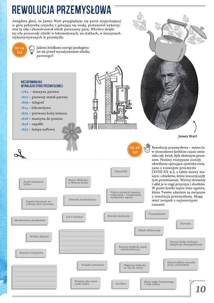 ReWoLuCjA PrZeMySłOwA Anegdota głosi, że James Watt przyglądając się parze wypychającej w górę pokrywkę czajnika z gotującą się wodą, postanowił wykorzystać tę siłę i skonstruował silnik poruszany parą. Wkrótce dzięki tej sile pracowały silniki w lokomotywach, na statkach, w maszynach wykorzystywanych w przemyśle. 10-14 lat Jakimi źródłami energii posługiwano się przed wynalezieniem silnika parowego? NiEzApOmInAjKa wYnAlAzKi ePoKi pRzEmYsŁoWeJ: 1784 – maszyna parowa 1807 – pierwszy statek parowy 1809 – telegraf 1814 – lokomotywa 1825 – pierwsza kolej żelazna 1828 – maszyna do pisania 1848 – zapałki 1853 – lampa naftowa James Watt 12-18 lat Rewolucja przemysłowa – mimo że w stosunkowo krótkim czasie zmieniła cały świat, była złożonym procesem. Poniżej rozsypane zostały określenia opisujące zjawiska związane z rozwojem przemysłu (XVIII-XX w.), a także nazwy maszyn i obiektów, które towarzyszyły tym przemianom. Wytnij elementy i ułóż je w ciągi przyczyn i skutków. W puste kratki wpisz inne ogniwa, które Twoim zdaniem są związane z rewolucją przemysłową. Mogą mieć związek z najnowszymi czasami. Samochód Zanik lokalnych kultur Zapotrzebowanie na większą ilość żywności Statua Wolności w Nowym Jorku Siewnik mechaniczny Lot w kosmos Użycie prostych maszyn rolniczych – zwiększenie wydajności upraw Transatlantyk Rozwój medycyny Mechaniczna przędzarka Parowóz Silnik elektryczny Wielkie fabryki Rozwój wielkich miast - industrializacja Wzrost liczby ludności (eksplozja demograficzna) Rozwój transportu Związki zawodowe Kolonie jako nowe rynki zbytu Migracja ludności ze wsi do miast Gruźlica Katastrofalne warunki pracy robotników Złoża węgla kamiennego i rudy żelaza 10