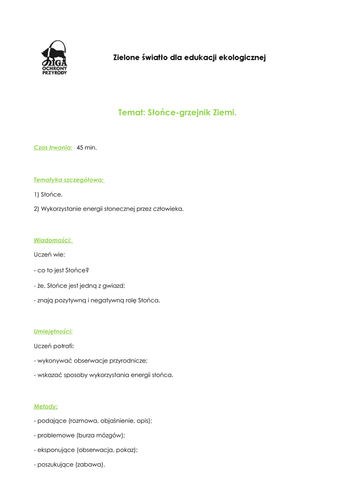 Temat: Słońce-grzejnik Ziemi. Czas trwania: 45 min. Tematyka szczegółowa: 1) Słońce. 2) Wykorzystanie energii słonecznej przez człowieka. Wiadomości: Uczeń wie: - co to jest Słońce? - że, Słońce jest jedną z gwiazd; - znają pozytywną i negatywną rolę Słońca. Umiejętności: Uczeń potrafi: - wykonywać obserwacje przyrodnicze; - wskazać sposoby wykorzystania energii słońca. Metody: - podające (rozmowa, objaśnienie, opis); - problemowe (burza mózgów); - eksponujące (obserwacja, pokaz); - poszukujące (zabawa). Formy: - praca indywidualna; - praca w grupach. Środki dydaktyczne: - gotowa tablica lub rysunek, gdzie przedstawiona jest budowa układu słonecznego; - latarka; - globus; - kalkulator; - zegarek; - zdjęcie kolektora słonecznego umieszczonego na dachu; - kartki z rysunkiem słońca i napisami: pozytywna rola, negatywna rola; - rysunki obrazujące pozytywną i negatywną rolę Słońca. Miejsce zajęć: - duża sala lekcyjna lub świetlica. PRZEBIEG LEKCJI: Nauczyciel rozmawia z uczniami na temat: Słońca, budowy układu słonecznego. Warto tu posłużyć się gotową tablicą lub rysunkiem gdzie przedstawiona jest budowa układu słonecznego. Nauka piosenki o słońcu pt. ,,Dobre zwyczaje” sł. Cz. Janczarski, muz. W. Szpilman Nauczyciel uczy się z uczniami słów piosenki. Dzieci śpiewając tańczą w kółku, a przy słowie ‘dzień dobry’ – kłaniają się. „Słonko ma bardzo dobre zwyczaje, Dzień dobry mówi, gdy rano wstaje! Dzień dobry, dzień dobry Dzień dobry wam Sto jasnych promyków Każdemu dam”. Zabawa – Ziemia krąży wokół Słońca. Przeprowadzenie tego doświadczenia ma uświadomić dzieciom teorie krążenia Ziemi wokół Słońca- ruchu obrotowego i wirowego. Nauczyciel trzyma w ręku globus -Ziemię, a uczeń zapaloną latarkę - Słońce. Nauczyciel powoli obraca globus – Ziemię jednocześnie poruszając się po okręgu wokół Ziemi. W trakcie doświadczenia dzieci pokazują to miejsce na Ziemi, które jest w danym momencie oświetlone. Wspólnie omawiają z nauczycielem, kiedy na Ziemi jest dzień, a kiedy noc. Wykorzystanie energii słonecznej przez człowieka. Ze względu na wiek dzieci nie należy zagłębiać się w szczegóły, jedynie pokazać na przykładach zastosowanie energii słonecznej np. - do wytwarzania energii elektrycznej (kalkulator, zegarek, zdjęcie znaku drogowego lub tablicy informacyjnej posiadającej ogniwa słoneczne), - do wytwarzania energii cieplnej (zdjęcie kolektora słonecznego umieszczonego na dachu jako przykład zastosowania do ogrzewania wody w domach). Należy zwrócić uwagę dzieci, że energia słoneczna jest energią ekologiczną, odnawialną. Nauczyciel na tablicy umieszcza rysunek słońca i po dwóch jego stronach umieszcza napisy: pozytywna roli, negatywna rola i rozdaje dzieciom rysunki np.: zwierząt, kwitnącej rośliny, zdjęcia ciepłej i zimnej pory roku, kolektora słonecznego, kalkulatora, mocno opalonego człowieka, pustyni, szklanej butelki w lesie itd. Dzieci umieszczają na tablicy po odpowiednich stronach otrzymane rysunki. Zabawa daje okazję do dyskusji na temat roli Słońca, sposobów wykorzystania energii słonecznej. Słońce – rola pozytywna: • dzieli dobę na dzień i noc, wyznacza rytm życia i pracy, • promienie słoneczne nagrzewają atmosferę oraz powierzchnię Ziemi, co umożliwia wegetację roślin, zwierząt, • jest głównym „twórcą” klimatu, • wyznacza pory roku, • jest „ekologicznym dawcą energii odnawialnej” (kolektory słoneczne) • oczyszcza powietrze, którym oddychamy, • w umiarkowanych dawkach wzmacnia nasz system odpornościowy, uczestniczy w wytwarzaniu wit. D . Słońce ma również wpływ negatywny: • na niektórych ternach np. w Dolinie Śmierci i pustyniach uniemożliwia istnienie życia, • jest czynnikiem wywołującym liczne choroby i dolegliwości (nowotwory, oparzenia, udar słoneczny) u człowieka, • wywołuje samoczynne pożary na wysuszonych obszarach, Zabawa w skojarzenia. Nauczyciel pisze na tablicy słowo: energia słoneczna, a uczniowie podają wyrazy lub samodzielnie zapisują na tablicy wyrazy, które im się kojarzą z tą formą energii. Energia słoneczna Np.: - życie roślin i zwierząt; - kalkulator; - susze; - pustynie; - pożary; - dzień i noc; - pory roku; - kolektory słoneczne;