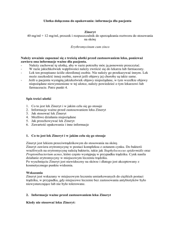 Ulotka dołączona do opakowania: informacja dla pacjenta Zineryt 40 mg/ml + 12 mg/ml, proszek i rozpuszczalnik do sporządzania roztworu do stosowania na skórę Erythromycinum cum zinco Należy uważnie zapoznać się z treścią ulotki przed zastosowaniem leku, ponieważ zawiera ona informacje ważne dla pacjenta. Należy zachować tę ulotkę, aby w razie potrzeby móc ją ponownie przeczytać. W razie jakichkolwiek wątpliwości należy zwrócić się do lekarza lub farmaceuty. Lek ten przepisano ściśle określonej osobie. Nie należy go przekazywać innym. Lek może zaszkodzić innej osobie, nawet jeśli objawy jej choroby są takie same. Jeśli u pacjenta wystąpią jakiekolwiek objawy niepożądane, w tym wszelkie objawy niepożądane niewymienione w tej ulotce, należy powiedzieć o tym lekarzowi lub farmaceucie. Patrz punkt 4. Spis treści ulotki 1. 2. 3. 4. 5. 6. Co to jest lek Zineryt i w jakim celu się go stosuje Informacje ważne przed zastosowaniem leku Zineryt Jak stosować lek Zineryt Możliwe działania niepożądane Jak przechowywać lek Zineryt Zawartość opakowania i inne informacje 1. Co to jest lek Zineryt i w jakim celu się go stosuje Zineryt jest lekiem przeciwtrądzikowym do stosowania na skórę. Zineryt zawiera erytromycynę w postaci kompleksu z octanem cynku. Do bakterii wrażliwych na erytromycynę należą bakterie, takie jak Staphylococcus epidermidis oraz Propionibacterium acnes, które często występują w przypadku trądziku. Cynk nasila działanie erytromycyny w miejscowym leczeniu trądziku. Po wyschnięciu Zineryt jest niewidoczny na skórze i dlatego jest akceptowany z kosmetycznego punktu widzenia. Wskazania Zineryt jest wskazany w miejscowym leczeniu umiarkowanych do ciężkich postaci trądziku, w przypadku, gdy miejscowe leczenie bez zastosowania antybiotyków było niewystarczające lub nie było tolerowane. 2. Informacje ważne przed zastosowaniem leku Zineryt Kiedy nie stosować leku Zineryt: - jeśli pacjent ma uczulenie na substancje czynne lub którykolwiek z pozostałych składników tego leku (wymienionych w punkcie 6). - jeśli występuje nadwrażliwość na inne antybiotyki z grupy makrolidów. Ostrzeżenia i środki ostrożności Przed rozpoczęciem stosowania leku Zineryt należy omówić to z lekarzem lub farmaceutą. Należy unikać kontaktu leku Zineryt z oczami lub błoną śluzową nosa i jamy ustnej. Lek może spowodować pieczenie i podrażnienie tych okolic. W razie kontaktu leku Zineryt z oczami lub błoną śluzową nosa i jamy ustnej, należy je dokładnie przepłukać wodą i powiadomić lekarza. Może wystąpić oporność krzyżowa z innymi antybiotykami z grupy makrolidów oraz z linkomycyną i klindamycyną. Może także wystąpić wzajemna krzyżowa nadwrażliwość pomiędzy makrolidami. Zineryt a inne leki Należy powiedzieć lekarzowi lub farmaceucie o wszystkich lekach przyjmowanych przez pacjenta obecnie lub ostatnio, a także o lekach, które pacjent planuje stosować. Wzajemnie oddziaływania (interakcje) leku Zineryt z innymi lekami nie są znane. Ciąża i karmienie piersią Jeśli pacjentka jest w ciąży lub karmi piersią, przypuszcza, że może być w ciąży lub gdy planuje mieć dziecko, powinna poradzić się lekarza lub farmaceuty przed zastosowaniem tego leku. Leku Zineryt nie należy stosować w okresie ciąży, o ile lekarz nie uzna, że jest to zdecydowanie konieczne. Prowadzenie pojazdów i obsługiwanie maszyn Nie ma danych dotyczących wpływu leku Zineryt na zdolność do prowadzenia pojazdów i obsługiwania maszyn. Jednak działanie takie nie wydaje się prawdopodobne. 3. Jak stosować lek Zineryt Ten lek należy zawsze stosować zgodnie z zaleceniami lekarza. W razie wątpliwości należy zwrócić się do lekarza lub farmaceuty. Dawkowanie: Przed zastosowaniem leku należy dokładnie oczyścić i osuszyć powierzchnię skóry, na która będzie nanoszony lek. Jeżeli lekarz nie zaleci inaczej, Zineryt należy stosować na zmienione chorobowo miejsca na skórze dwa razy na dobę, zwykle przez okres od 10 do 12 tygodni. Znaczący efekt terapeutyczny zwykle osiąga się w ciągu 12 tygodni. W przypadku braku poprawy lub pogorszenia należy skonsultować się z lekarzem. Jeśli lekarz stwierdzi oporność bakterii na lek, należy przerwać stosowanie leku na okres dwóch miesięcy. Sposób podawania Zineryt należy nakładać na skórę całej twarzy lub inne zmienione miejsca (nie tylko samą zmianę chorobową), aż do całkowitego pokrycia leczonego obszaru, każdorazowo zużywając około 0,5 ml roztworu. Aby otrzymać roztwór gotowy do stosowania, należy wykonać czynności opisane w Instrukcji dotyczącej użytkowania leku, zamieszczonej w dalszej części ulotki. Po przygotowaniu roztworu należy odwrócić butelkę z aplikatorem do góry dnem i nanieść lek na zmienioną chorobowo okolicę skóry, przesuwając po niej aplikatorem. Ilość wypływającego z buteleczki roztworu leku reguluje się zwiększając lub zmniejszając siłę nacisku aplikatora na skórę. Instrukcja dotycząca użytkowania leku Przygotowanie roztworu W opakowaniu znajdują się (patrz rysunek): ZINERYT ZINERYT A PROSZEK B ROZPUSZ CZALNIK A B C (A). Butelka z proszkiem do sporządzania roztworu (B). Butelka z rozpuszczalnikiem do sporządzania roztworu (C). Aplikator 1. Po uprzednim zdjęciu nakrętek, należy przelać zawartość butelki z rozpuszczalnikiem (B) do butelki z proszkiem (A). 2. Zakręcić butelkę, w której znajdują się proszek z rozpuszczalnikiem i zmieszać jej zawartość potrząsając butelką przez mniej więcej minutę. 3. Zdjąć nakrętkę z butelki z uzyskanym roztworem. 4. W szyjce butelki z roztworem umieścić aplikator (C), wciskając go zdecydowanym ruchem aż do oporu. 5. Zakręcić butelkę z aplikatorem. 6. Po sporządzeniu roztwór można stosować przez 5 tygodni. Termin ważności należy zapisać na butelce. Zastosowanie większej niż zalecana dawki leku Zineryt