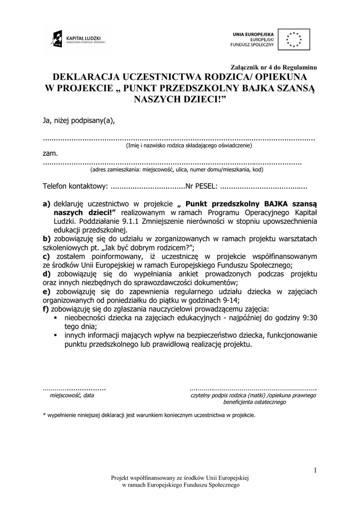 Załącznik nr 4 do Regulaminu DEKLARACJA UCZESTNICTWA RODZICA/ OPIEKUNA W PROJEKCIE „ PUNKT PRZEDSZKOLNY BAJKA SZANSĄ NASZYCH DZIECI!” Ja, niżej podpisany(a), ............................................................................................................................ (Imię i nazwisko rodzica składającego oświadczenie) zam. ...................................................................................................................... (adres zamieszkania: miejscowość, ulica, numer domu/mieszkania, kod) Telefon kontaktowy: ..................................Nr PESEL: ........................................ a) deklaruję uczestnictwo w projekcie „ Punkt przedszkolny BAJKA szansą naszych dzieci!” realizowanym w ramach Programu Operacyjnego Kapitał Ludzki. Poddziałanie 9.1.1 Zmniejszenie nierówności w stopniu upowszechnienia edukacji przedszkolnej. b) zobowiązuję się do udziału w zorganizowanych w ramach projektu warsztatach szkoleniowych pt. „Jak być dobrym rodzicem?”; c) zostałem poinformowany, iż uczestniczę w projekcie współfinansowanym ze środków Unii Europejskiej w ramach Europejskiego Funduszu Społecznego; d) zobowiązuję się do wypełniania ankiet prowadzonych podczas projektu oraz innych niezbędnych do sprawozdawczości dokumentów; e) zobowiązuję się do zapewnienia regularnego udziału dziecka w zajęciach organizowanych od poniedziałku do piątku w godzinach 9-14; f) zobowiązuję się do zgłaszania nauczycielowi prowadzącemu zajęcia: nieobecności dziecka na zajęciach edukacyjnych - najpóźniej do godziny 9:30 tego dnia; innych informacji mających wpływ na bezpieczeństwo dziecka, funkcjonowanie punktu przedszkolnego lub prawidłową realizację projektu. ………….................. miejscowość, data ….……..……………………………………………. czytelny podpis rodzica (matki) /opiekuna prawnego beneficjenta ostatecznego * wypełnienie niniejszej deklaracji jest warunkiem koniecznym uczestnictwa w projekcie. 1 Projekt współfinansowany ze środków Unii Europejskiej w ramach Europejskiego Funduszu Społecznego