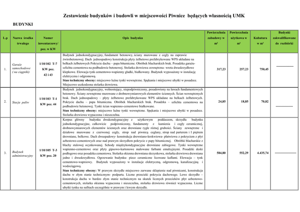 Zestawienie budynków i budowli w miejscowości Piwnice będących własnością UMK BUDYNKI L.p Nazwa środka Numer trwałego inwentarzowy/ Opis budynku Powierzchnia Powierzchnia Budynki zabudowy w użytkowa w Kubatura zakwalifikowane m² m² w m³ do rozbiórki poz. w KW 1. 2. 3. Garaże samochodowe ( na ciągniki) 1/10/102 T-7 KW poz. 42 i 43 1/10/103 T-1 Stacja paliw Budynek administracyjny KW poz. 44 1/10/105 T-3 KW poz. 20 Budynek jednokondygnacyjny, fundament betonowy, ściany murowane z cegły na zaprawie żwirobetonowej. Dach jednospadowy konstrukcja płyty żelbetowe prefabrykowane WPS układane na belkach żelbetowych Pokrycie dachu – papa bitumiczne. Obróbek blacharskich brak. Posadzka garażuszlichta cementowa na podbudowie betonowej. Stolarka drzwiowa zewnętrzna- wrota dwuskrzydłowe klepkowe. Elewacja tynk cementowo-wapienny gładki, białkowany. Budynek wyposażony w instalację elektryczna i odgromową. Stan techniczny obecny: miejscowo luźne tynki wewnętrzne. Spękania i miejscowe ubytki w posadzce. Miejscowo uszkodzona stolarka drzwiowa. Budynek jednokondygnacyjny, wolnostojący, niepodpiwniczony, posadowiony na ławach fundamentowych betonowy. Ściany zewnętrzne murowane z drobnowymiarowych elementów ściennych. Ścian wewnętrznych brak. Dach jednospadowy – płyty żelbetowe prefabrykowane WPS układane na belkach żelbetowych. Pokrycie dachu – papa bitumiczna. Obróbek blacharskich brak. Posadzka – szlichta cementowa na podbudowie betonowej. Tynki ścian wapienno-cementowe białkowane. Stan techniczny obecny: miejscowo luźne tynki wewnętrzne. Spękania i miejscowe ubytki w posadzce. Stolarka drzwiowa wypaczona i nieszczelna. Korpus główny budynku dwukondygnacyjny z użytkowym poddaszem, skrzydła budynku jednokondygnacyjne, całkowicie podpiwniczony, fundamenty z kamienia i cegły ceramicznej, drobnowymiarowych elementów ściennych oraz drewniane rygle różnej grubości. Ściany zewnętrzne i działowe murowane z czerwonej cegły, strop nad piwnicą ceglany, strop nad parterem i I piętrem drewniane, belkowe. Dach dwuspadowy- konstrukcja drewniano-krokwiowa- płatwiowa z pokryciem z płyt azbestowo-cementowych oraz nad prawym skrzydłem pokrycie z papy bitumicznej. Obróbki blacharskie z blachy stalowej ocynkowanej. Schody międzykondygnacyjne drewniane zabiegowe. Tynki wewnętrzne wapienno-cementowe oraz płyty gipsowo-kartonowe malowane farbami emulsyjnymi. Posadzki deski podłogowe oraz posadzka cementowa. Stolarka okienna drewniana skrzynkowa, stolarka drzwiowa drewniana jedno i dwuskrzydłowa. Ogrzewanie budynku- piece ceramiczne licowane kaflami. Elewacja – tynk cementowo-wapniowy. Budynek wyposażony w instalacje elektryczną, odgromową, kanalizacyjną i wodociągową. Stan techniczny obecny: W prawym skrzydle miejscowo zarwane sklepienie nad piwnicami, konstrukcja dachu w złym stanie technicznym- podparta. Liczne przecieki pokrycia dachowego. Lewe skrzydło – konstrukcja dachu w bardzo złym stanie technicznym na skutek licznych przecieków płyt azbestowocementowych, stolarka okienna wypaczona i nieszczelna, stolarka drzwiowa również wypaczona. Liczne ubytki tynku na sufitach szczególnie w prawym i lewym skrzydle. ---------------317,23 257,23 750,45 24,85 18,85 70,82 ---------------- 584,80 552,29 4.435,74 -------------------- 4. Magazyn środków chemicznych ( budynek magazynowo – garażowy ) 5. Kuźnia ze stelmachem 6. 7. Magazyn do maszyn ( warsztat naprawczy ) Magazyn zbożowy 1/10/108 T-2 KW poz. 19 1/10/108 T-3 KW poz. 41 1/10/108 T-4 KW poz. 25 1/10/108 T-5 KW poz. 26 Budynek wolnostojący, jednokondygnacyjny wyniesiony nad poziom przyległego gruntu na średnią wysokość 0,6 m, nie podpiwniczony, posadowiony na ławach fundamentowych. Ściany zewnętrzne murowane z cegły wapienno-piaskowej i ceramicznej oraz drobnowymiarowych elementów ściennych. Ściany wewnętrzne murowane z drobnowymiarowych elementów ściennych różnej grubości. Dach jednospadowy – płyty żelbetowe układane na belkach żelbetowych prefabrykowanych z pokryciem z papy bitumicznej. Obróbki blacharskie z blachy stalowej ocynkowanej. Tynki wewnętrzne ścian wapienno-cementowe białkowane. Podsufitka z płyt azbestowo-cementowych na części powierzchni. Posadzka szlichta cementowa na podbudowie betonowej. Drzwi zewnętrzne metalowe. Stolarka okienna drewniana. Elewacja – tynk cementowo-wapienny gładki. Budynek nie jest wyposażony w żadna instalację wewnętrzną. Stan techniczny obecny: uszkodzona podsufitka, znaczna część powierzchni ścian wewnętrznych pozbawiona tynków. Występują ubytki tynku elewacji. Wypaczona i nieszczelna stolarka okienna. Zdemontowano wszystkie instalacje wewnętrzne Budynek dwubryłowy – składa się z części niższej obejmującej pomieszczenia kuźni i stolarni oraz części wyższej magazynowej. Budynek o jednej kondygnacji nadziemnej, nie podpiwniczony, posadowiony na ławach fundamentowych. Ściany zewnętrzne i wewnętrzne murowane z drobnowymiarowych elementów ściennych. Dach jednospadowy - konstrukcja płyty żelbetowe prefabrykowane WPS układane na belkach żelbetowych. Pokrycie dachu papa bitumiczna. W przypadku pomieszczenia magazynowego dach posiada konstrukcję drewniana krokwiową z deskowaniem szczelnym i pokryciem z płyt azbestowo-cementowych NF. Obróbek blacharskich brak. Budynek od frontu posiada podcień na szerokości kuźni – konstrukcja zadaszenia jak i budynku wsparta jest na słupach. Tynki wewnętrzne ścian wapienno-cementowe. Posadzka szlichta cementowa na podbudowie betonowej. Stolarka drzwiowa wewnętrzna i zewnętrzna- drzwi deskowe ciesielski jedno i dwuskrzydłowe. Okna ramy stalowe -szklone. Elewacja – tynk cementowo-wapienny gładki, białkowany. Budynek wyposażony jest w instalację elektryczną i odgromową. Stan techniczny obecny: miejscowo luźne tynki wewnętrzne, spękania i miejscowe ubytki w posadzce oraz miejscowo uszkodzona stolarka drzwiowa. Bud