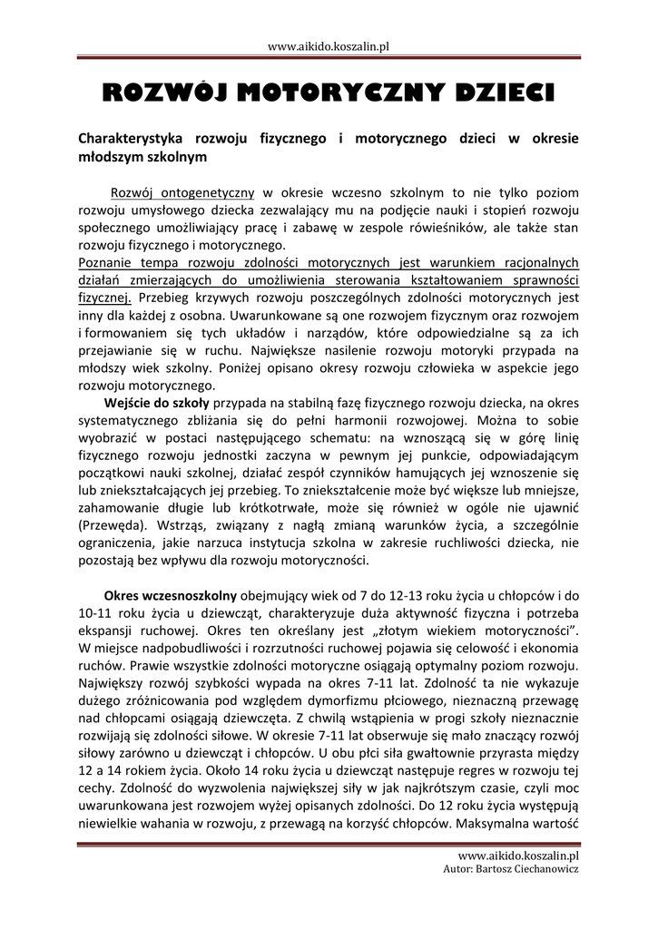 www.aikido.koszalin.pl ROZWÓJ MOTORYCZNY DZIECI Charakterystyka rozwoju fizycznego i motorycznego dzieci w okresie młodszym szkolnym Rozwój ontogenetyczny w okresie wczesno szkolnym to nie tylko poziom rozwoju umysłowego dziecka zezwalający mu na podjęcie nauki i stopieo rozwoju społecznego umożliwiający pracę i zabawę w zespole rówieśników, ale także stan rozwoju fizycznego i motorycznego. Poznanie tempa rozwoju zdolności motorycznych jest warunkiem racjonalnych działao zmierzających do umożliwienia sterowania kształtowaniem sprawności fizycznej. Przebieg krzywych rozwoju poszczególnych zdolności motorycznych jest inny dla każdej z osobna. Uwarunkowane są one rozwojem fizycznym oraz rozwojem i formowaniem się tych układów i narządów, które odpowiedzialne są za ich przejawianie się w ruchu. Największe nasilenie rozwoju motoryki przypada na młodszy wiek szkolny. Poniżej opisano okresy rozwoju człowieka w aspekcie jego rozwoju motorycznego. Wejście do szkoły przypada na stabilną fazę fizycznego rozwoju dziecka, na okres systematycznego zbliżania się do pełni harmonii rozwojowej. Można to sobie wyobrazid w postaci następującego schematu: na wznoszącą się w górę linię fizycznego rozwoju jednostki zaczyna w pewnym jej punkcie, odpowiadającym początkowi nauki szkolnej, działad zespół czynników hamujących jej wznoszenie się lub zniekształcających jej przebieg. To zniekształcenie może byd większe lub mniejsze, zahamowanie długie lub krótkotrwałe, może się również w ogóle nie ujawnid (Przewęda). Wstrząs, związany z nagłą zmianą warunków życia, a szczególnie ograniczenia, jakie narzuca instytucja szkolna w zakresie ruchliwości dziecka, nie pozostają bez wpływu dla rozwoju motoryczności. Okres wczesnoszkolny obejmujący wiek od 7 do 12-13 roku życia u chłopców i do 10-11 roku życia u dziewcząt, charakteryzuje duża aktywnośd fizyczna i potrzeba ekspansji ruchowej. Okres ten określany jest „złotym wiekiem motoryczności”. W miejsce nadpobudliwości i rozrzutności ruchowej pojawia się celowośd i ekonomia ruchów. Prawie wszystkie zdolności motoryczne osiągają optymalny poziom rozwoju. Największy rozwój szybkości wypada na okres 7-11 lat. Zdolnośd ta nie wykazuje dużego zróżnicowania pod względem dymorfizmu płciowego, nieznaczną przewagę nad chłopcami osiągają dziewczęta. Z chwilą wstąpienia w progi szkoły nieznacznie rozwijają się zdolności siłowe. W okresie 7-11 lat obserwuje się mało znaczący rozwój siłowy zarówno u dziewcząt i chłopców. U obu płci siła gwałtownie przyrasta między 12 a 14 rokiem życia. Około 14 roku życia u dziewcząt następuje regres w rozwoju tej cechy. Zdolnośd do wyzwolenia największej siły w jak najkrótszym czasie, czyli moc uwarunkowana jest rozwojem wyżej opisanych zdolności. Do 12 roku życia występują niewielkie wahania w rozwoju, z przewagą na korzyśd chłopców. Maksymalna wartośd www.aikido.koszalin.pl Autor: Bartosz Ciechanowicz www.aikido.koszalin.pl mocy przypada u dziewcząt na wiek 10 lat, u chłopców znacznie później w wieku 15 lat. Zwinnośd osiąga najszybszy rozwój w młodszym wieku szkolnym u chłopców w wieku 10 lat, u dziewcząt nieco wcześniej w wieku 9 lat. W tym okresie tempo rozwoju zdolności zwinnościowych jest słabe i utrzymuje się do następnego okresu rozwojowego. W zakresie wytrzymałości najwyraźniej zaczyna się kształtowad różnica między chłopcami a dziewczętami. U chłopców rozwija się ona progresywnie i w wieku 14-15 lat osiąga największy rozwój. U dziewcząt już od 12 roku życia następuje powolny regres rozwoju wytrzymałości (Okoo). W wieku 7-9 lat i 10-13 u chłopców oraz 10-11 lat u dziewcząt obserwuje się słaby rozwój zdolności gibkościowych. Nieznaczny rozwój gibkości przypada na wiek 9-10 lat u obu płci (Drabik). Młodszy wiek szkolny jest z biologicznych względów korzystnym etapem rozwoju motorycznego dziecka. Po przejściowych wahaniach spowodowanych dostosowywaniem się organizmu do nowych sytuacji szkolnych oraz innymi przemianami, jak na przykład zmianą uzębienia mlecznego na stałe, zanikają dziecięce cechy budowy i funkcji występujące u uczniów klas I— III i stopniowo dziecko zaczyna coraz bardziej upodobniad się w wyglądzie, ruchach i w zachowaniu do dorosłego. Przyrost wzrostu maleje na rzecz przekształceo w budowie. Rozrasta się kościec i układ mięśniowy. Do około dwunastego roku życia włókna mięśni szkieletowych szybko grubieją, a liczba jąder komórkowych zmniejsza się do ilości podobnej jak u dorosłych. Jednocześnie mięśnie ulegają wybitnemu usprawnieniu, wyrażającemu się m. in., wzrostem siły i obniżeniem czasu reakcji. Zmienia się także obraz sylwetki dzieci, przy czym zaczynają występowad wyraźniejsze różnice w budowie ciała chłopców i dziewcząt. Jest to wynikiem rozrostów szerokościowych mocniej akcentowanych u chłopców w obrębie barków, a u dziewcząt bioder. Klatka piersiowa nabiera też dorosłych kształtów. W tym wieku obserwuje się dużą sprawnośd narządów wewnętrznych, jak serce, płuca, układ trawienia. Skład krwi dziecka upodabnia się do składu krwi dorosłego, a tętno staje się regularne. Układ nerwowy nabiera cech równowagi, dzięki czemu maleje niepokój ruchowy dziecka. Z powyższego wynika, że młodszy wiek szkolny w życiu dziecka charakteryzuje się korzystnym układem cech rozwijających się w ontogenezie. Proporcjonalnośd rozrostu i wysoki stopieo rozwoju właściwości morfologicznych, sprawnośd funkcji, dobra współpraca między poszczególnymi układami, wrażliwośd zmysłów, ogólna odpornośd ustroju, znaczne przystosowanie do warunków środowiskowych, duża samodzielnośd biologiczna (przy wysokim poziomie rozwoju umysłowego i swoistej doskonałości motorycznej) — wszystko to pozwala określid młodszy wiek szkolny jako etap 