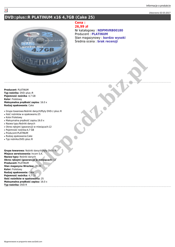 Informacje o produkcie Utworzono 02-03-2017 DVD::plus::R PLATINUM x16 4,7GB (Cake 25) Cena : 26,99 zł iz .p l Nr katalogowy : NDPMVRB00180 Producent : PLATINUM Stan magazynowy : bardzo wysoki Średnia ocena : brak recenzji ● ● ● ● ● ● ● le p ● Grupa towarowa:Nośniki danych\Płyty DVD-/::plus::R Ilość nośników w opakowaniu:25 Kolor:Fioletowy Maksymalna prędkość zapisu:16.0 x Nazwa typu:Nośniki danych Okres rękojmi (gwarancji) w miesiącach:12 Pojemność nośnika:4,7 GB Producent:PLATINUM Rodzaj opakowania:Cake Typ nośnika:DVD::plus::R dz ● .c ● .b Producent: PLATINUM Typ nośnika: DVD::plus::R Pojemność nośnika: 4,7 GB Kolor: Fioletowy Maksymalna prędkość zapisu: 16.0 x Rodzaj opakowania: Cake sk Grupa towarowa: Nośniki danych\Płyty DVD-/ R Miejsce serwisowania: Incom S.A. Nazwa typu: Nośniki danych Okres rękojmi (gwarancji) w miesiącach: 12 Producent: PLATINUM Stan magazynu Wrocław: 30.00 Kolor: Fioletowy Rodzaj opakowania: Cake Pojemność nośnika: 4,7 GB Ilość nośników w opakowaniu: 25 Maksymalna prędkość zapisu: 16.0 x Typ nośnika: DVD R Wygenerowano w programie www.oscGold.com