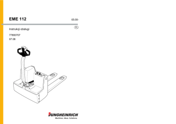 EME 112 Instrukcji obsługi 77800707 07.08 05.00- p Wstęp Wstęp Bezpieczna eksploatacja wózka wymaga dokładnego zapoznania się z informacjami podanymi w niniejszej ORYGINALNEJ INSTRUKCJI OBSŁUGI. Informacje te przedstawiono w zwięzłej i przejrzystej formie. Poszczególne rozdziały oznaczone są literami. Każdy rozdział rozpoczyna się od strony oznaczonej cyfrą 1. Oznakowanie stron składa się z litery odpowiadającej danemu rozdziałowi i numeru strony. Przykład: strona B 2 oznacza drugą stronę rozdziału B. Bezpieczna eksploatacja wózka wymaga dokładnego zapoznania się z informacjami podanymi w niniejszej ORYGINALNEJ INSTRUKCJI OBSŁUGI. Informacje te przedstawiono w zwięzłej i przejrzystej formie. Poszczególne rozdziały oznaczone są literami. Każdy rozdział rozpoczyna się od strony oznaczonej cyfrą 1. Oznakowanie stron składa się z litery odpowiadającej danemu rozdziałowi i numeru strony. Przykład: strona B 2 oznacza drugą stronę rozdziału B. W instrukcji obsługi omówione zostały różne wersje wózków. Przy wykonywaniu prac konserwacyjnych oraz w trakcie eksploatacji należy stosować się do instrukcji odnoszących się do danego typu wózka. W instrukcji obsługi omówione zostały różne wersje wózków. Przy wykonywaniu prac konserwacyjnych oraz w trakcie eksploatacji należy stosować się do instrukcji odnoszących się do danego typu wózka. Wskazówki odnoszące się do bezpieczeństwa pracy i ważniejsze objaśnienia oznaczono poniższymi symbolami: Wskazówki odnoszące się do bezpieczeństwa pracy i ważniejsze objaśnienia oznaczono poniższymi symbolami: f Występuje przed wskazówkami dotyczącymi bezpieczeństwa pracy, których należy przestrzegać w celu zapobiegania zagrożeniom dla zdrowia lub życia. f Występuje przed wskazówkami dotyczącymi bezpieczeństwa pracy, których należy przestrzegać w celu zapobiegania zagrożeniom dla zdrowia lub życia. m Występuje przed wskazówkami, których należy przestrzegać w celu zapobiegania szkodom materialnym. m Występuje przed wskazówkami, których należy przestrzegać w celu zapobiegania szkodom materialnym. A Występuje przed zaleceniami i objaśnieniami. t Oznacza wyposażenie standardowe. t Oznacza wyposażenie standardowe. o Oznacza wyposażenie dodatkowe. o Oznacza wyposażenie dodatkowe. Nasze urządzenia podlegają ciągłemu rozwojowi. Prosimy o zrozumienie, że zastrzegamy sobie prawo do zmian formy, wyposażenia i techniki. Dlatego też treść niniejszej instrukcji obsługi nie może stanowić podstawy do roszczeń w stosunku do określonych właściwości urządzenia. Nasze urządzenia podlegają ciągłemu rozwojowi. Prosimy o zrozumienie, że zastrzegamy sobie prawo do zmian formy, wyposażenia i techniki. Dlatego też treść niniejszej instrukcji obsługi nie może stanowić podstawy do roszczeń w stosunku do określonych właściwości urządzenia. Prawa autorskie Prawa autorskie Prawa autorskie niniejszej instrukcji obsługi należą do firmy JUNGHEINRICH AG. Prawa autorskie niniejszej instrukcji obsługi należą do firmy JUNGHEINRICH AG. Jungheinrich Aktiengesellschaft Jungheinrich Aktiengesellschaft Am Stadtrand 35 22047 Hamburg - NIEMCY Am Stadtrand 35 22047 Hamburg - NIEMCY Telefon: +49 (0) 40 6948-0 Telefon: +49 (0) 40 6948-0 www.jungheinrich.com www.jungheinrich.com 0108.PL 0108.PL A Występuje przed zaleceniami i objaśnieniami. 0108.PL 0108.PL A Zastosowanie zgodne z przeznaczeniem A Zastosowanie zgodne z przeznaczeniem B Opis pojazdu B Opis pojazdu 1 2 2.1 3 3.1 3.2 3.3 3.4 3.5 4 4.1 Opis stosowania ............................................................................... B 1 Opis modułów konstrukcyjnych i sposobu funkcjonowania .............. B 2 Pojazd .............................................................................................. B 3 Dane techniczne wersji standardowej .............................................. B 4 Parametry wydajnościowe dla pojazdów standardowych ................ B 4 Wymiary ........................................................................................... B 4 Moc akumulatora i silnika ................................................................. B 4 Normy EN ......................................................................................... B 6 Warunki eksploatacji ........................................................................ B 6 Tabliczki ........................................................................................... B 7 Tabliczka znamionowa, pojazd ........................................................ B 8 1 2 2.1 3 3.1 3.2 3.3 3.4 3.5 4 4.1 Opis stosowania ............................................................................... B 1 Opis modułów konstrukcyjnych i sposobu funkcjonowania .............. B 2 Pojazd .............................................................................................. B 3 Dane techniczne wersji standardowej .............................................. B 4 Parametry wydajnościowe dla pojazdów standardowych ................ B 4 Wymiary ........................................................................................... B 4 Moc akumulatora i silnika ................................................................. B 4 Normy EN ......................................................................................... B 6 Warunki eksploatacji ........................................................................ B 6 Tabliczki ........................................................................................... B 7 Tabliczka znamionowa, pojazd ........................................................ B 8 C Transport i uruchamianie C Transport i uruchamianie 1 2 3 Załadunek przy pomocy dźwigu ....................................................... C 1 Pierwsze uruchomienie .................................................................... C 1 Przemieszczanie pojazdu bez napędu własnego 