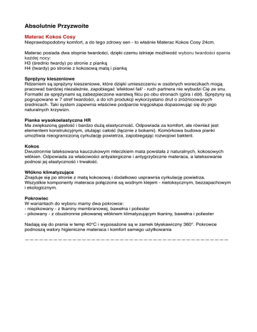 Absolutnie Przyzwoite Materac Kokos Cosy Nieprawdopodobny komfort, a do tego zdrowy sen - to właśnie Materac Kokos Cosy 24cm. Materac posiada dwa stopnie twardości, dzięki czemu istnieje możliwość wyboru twardości spania każdej nocy: H3 (średnio twardy) po stronie z pianką H4 (twardy) po stronie z kokosową matą i pianką Sprężyny kieszeniowe Rdzeniem są sprężyny kieszeniowe, które dzięki umieszczeniu w osobnych woreczkach mogą pracować bardziej niezależnie, zapobiegać 'efektowi fali' - ruch partnera nie wybudzi Cię ze snu. Formatki ze sprężynami są zabezpieczone warstwą filcu po obu stronach (góra i dół). Sprężyny są pogrupowane w 7 stref twardości, a do ich produkcji wykorzystano drut o zróżnicowanych średnicach. Taki system zapewnia właściwe podparcie kręgosłupa dopasowując się do jego naturalnych krzywizn. Pianka wysokoelastyczna HR Ma zwiększoną gęstość i bardzo dużą elastyczność. Odpowiada za komfort, ale również jest elementem konstrukcyjnym, otulając całość (łącznie z bokami). Komórkowa budowa pianki umożliwia nieograniczoną cyrkulację powietrza, zapobiegając rozwojowi bakterii. Kokos Dwustronnie lateksowana kauczukowym mleczkiem mata powstała z naturalnych, kokosowych włókien. Odpowiada za właściwości antyalergiczne i antygrzybiczne materaca, a lateksowanie podnosi jej elastyczność i trwałość. Włókno klimatyzujące Znajduje się po stronie z matą kokosową i dodatkowo usprawnia cyrkulację powietrza. Wszystkie komponenty materaca połączone są wodnym klejem - nietoksycznym, bezzapachowym i ekologicznym. Pokrowiec W wariantach do wyboru mamy dwa pokrowce: - niepikowany - z tkaniny membranowej, bawełna i poliester - pikowany - z obustronnie pikowanej włóknem klimatyzującym tkaniny, bawełna i poliester Nadają się do prania w temp 40°C i wyposażone są w zamek błyskawiczny 360°. Pokrowce podnoszą walory higieniczne materaca i komfort samego użytkowania ———————————————————————————————————————————