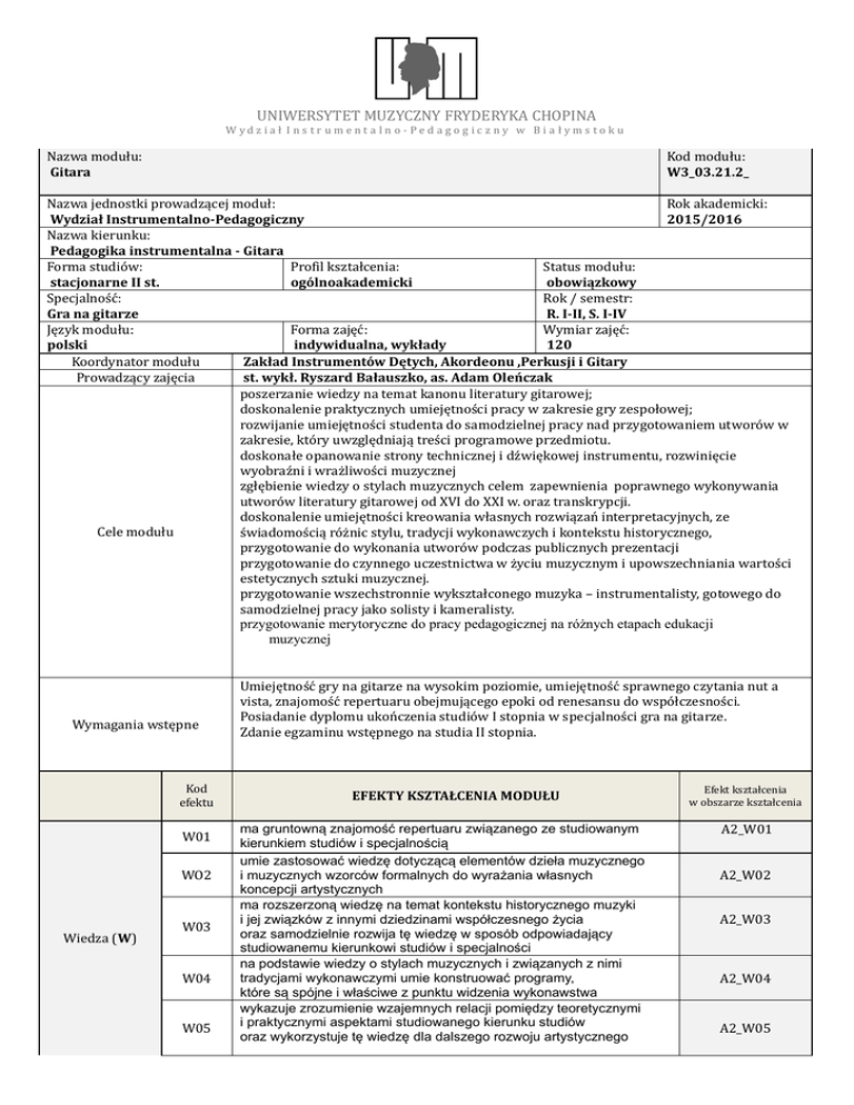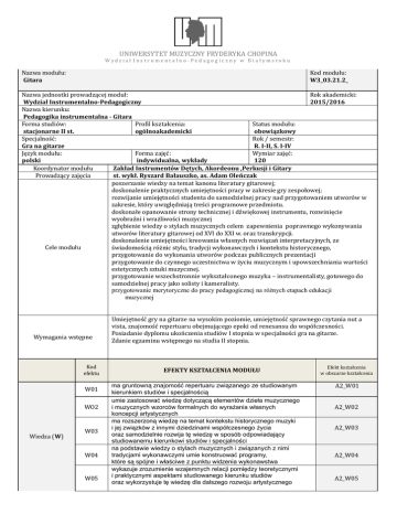 UNIWERSYTET MUZYCZNY FRYDERYKA CHOPINA Wydział Instrumentalno-Pedagogiczny w Białymstoku Nazwa modułu: Gitara Kod modułu: W3_03.21.2_ Nazwa jednostki prowadzącej moduł: Rok akademicki: Wydział Instrumentalno-Pedagogiczny 2015/2016 Nazwa kierunku: Pedagogika instrumentalna - Gitara Forma studiów: Profil kształcenia: Status modułu: stacjonarne II st. ogólnoakademicki obowiązkowy Specjalność: Rok / semestr: Gra na gitarze R. I-II, S. I-IV Język modułu: Forma zajęć: Wymiar zajęć: polski indywidualna, wykłady 120 Koordynator modułu Zakład Instrumentów Dętych, Akordeonu ,Perkusji i Gitary Prowadzący zajęcia st. wykł. Ryszard Bałauszko, as. Adam Oleńczak poszerzanie wiedzy na temat kanonu literatury gitarowej; doskonalenie praktycznych umiejętności pracy w zakresie gry zespołowej; rozwijanie umiejętności studenta do samodzielnej pracy nad przygotowaniem utworów w zakresie, który uwzględniają treści programowe przedmiotu. doskonałe opanowanie strony technicznej i dźwiękowej instrumentu, rozwinięcie wyobraźni i wrażliwości muzycznej zgłębienie wiedzy o stylach muzycznych celem zapewnienia poprawnego wykonywania utworów literatury gitarowej od XVI do XXI w. oraz transkrypcji. doskonalenie umiejętności kreowania własnych rozwiązań interpretacyjnych, ze Cele modułu świadomością różnic stylu, tradycji wykonawczych i kontekstu historycznego, przygotowanie do wykonania utworów podczas publicznych prezentacji przygotowanie do czynnego uczestnictwa w życiu muzycznym i upowszechniania wartości estetycznych sztuki muzycznej. przygotowanie wszechstronnie wykształconego muzyka – instrumentalisty, gotowego do samodzielnej pracy jako solisty i kameralisty. przygotowanie merytoryczne do pracy pedagogicznej na różnych etapach edukacji muzycznej Wymagania wstępne Kod efektu W01 WO2 Wiedza (W) W03 W04 W05 Umiejętność gry na gitarze na wysokim poziomie, umiejętność sprawnego czytania nut a vista, znajomość repertuaru obejmującego epoki od renesansu do współczesności. Posiadanie dyplomu ukończenia studiów I stopnia w specjalności gra na gitarze. Zdanie egzaminu wstępnego na studia II stopnia. EFEKTY KSZTAŁCENIA MODUŁU ma gruntowną znajomość repertuaru związanego ze studiowanym kierunkiem studiów i specjalnością umie zastosować wiedzę dotyczącą elementów dzieła muzycznego i muzycznych wzorców formalnych do wyrażania własnych koncepcji artystycznych ma rozszerzoną wiedzę na temat kontekstu historycznego muzyki i jej związków z innymi dziedzinami współczesnego życia oraz samodzielnie rozwija tę wiedzę w sposób odpowiadający studiowanemu kierunkowi studiów i specjalności na podstawie wiedzy o stylach muzycznych i związanych z nimi tradycjami wykonawczymi umie konstruować programy, które są spójne i właściwe z punktu widzenia wykonawstwa wykazuje zrozumienie wzajemnych relacji pomiędzy teoretycznymi i praktycznymi aspektami studiowanego kierunku studiów oraz wykorzystuje tę wiedzę dla dalszego rozwoju artystycznego Efekt kształcenia w obszarze kształcenia A2_W01 A2_W02 A2_W03 A2_W04 A2_W05 U06 Umiejętności (U) U07 U08 U09 U10 Umiejętności (U) U11 K12 K13 Kompetencje społeczne (K) K14 K15 posiada rozwiniętą osobowość artystyczną, umożliwiającą tworzenie, realizowanie i wyrażanie własnych koncepcji artystycznych potrafi budować obszerny repertuar, pogłębiając go w obszarze związanym ze studiowanym kierunkiem studiów i specjalnością posiada swobodę w interpretowaniu utworów reprezentujących różne style muzyczne i jednocześnie doskonali się w jednym, wybranym stylu jest zdolna do podjęcia wiodącej roli w zespołach muzycznych rozwija techniki ćwiczenia w stopniu wystarczającym do utrzymania i poszerzania zdolności do tworzenia, realizowania i wyrażania własnych koncepcji artystycznych w sposób odpowiedzialny podchodzi do występów estradowych i wykazuje się umiejętnością nawiązania kontaktu z publicznością poprzez wierne, płynne i przekonujące oddanie idei dzieła muzycznego rozumie potrzebę uczenia się przez całe życie, potrafi inspirować i organizować proces uczenia się innych osób jest zdolna do samodzielnego integrowania nabytej wiedzy oraz podejmowania w zorganizowany sposób nowych i kompleksowych działań, także w warunkach ograniczonego dostępu do potrzebnych informacji potrafi w sposób świadomy oraz poparty doświadczeniem wykorzystywać w różnych sytuacjach mechanizmy psychologiczne wspomagające podejmowane działania posiada umiejętność krytycznej oceny TREŚCI PROGRAMOWE MODUŁU A2_U01 A2_U02 A2_U03 A2_U04 A2_U05 A2_U08 A2_K01 A2_K02 A2_K03 A2_K04 Liczba godzin Semestr I – II Poszerzanie repertuaru o oryginalne kompozycje na gitarę oraz transkrypcje gitarowe obejmujące dzieła od XVI w. do współczesności. Doskonalenie techniki wykonawczej, wyobraźni artystycznej, wyczucia formy utworu, Rozwijanie posiadanej wrażliwości na dźwięk, barwę i dynamikę. Doskonalenie wykonawstwa w warunkach koncertowych. Rozwijanie umiejętności posługiwania się różnorodnymi sposobami zapisu muzycznego (tabulatura włoska, tabulatura francuska, tabulatura niemiecka, różne rodzaje zapisu transponującego, współczesne sposoby zapisu nowoczesnych efektów brzmieniowych). Semestr III-IV Rozwijanie wrażliwości artystycznej, rozwijanie indywidualnego podejścia do rozwiązywania problemów estetycznych, rozwijanie wrażliwości na dźwięk, jego barwę, doskonalenie umiejętności operowania zróżnicowaną artykulacją dźwięku, stymulacja indywidualnego podejścia studenta do operowania możliwościami artystycznymi gitary. Drugi rok studiów magisterskich kończy się egzaminem (dyplom magisterski), na którym student podczas swojego recitalu, powinien zaprezentować zróżnicowane pod względem stylistycznym i formalnym, pozycje z literatury gitarowej. 60 60 praca indywidualna praca zespołowa ćwiczenia w grupach preze