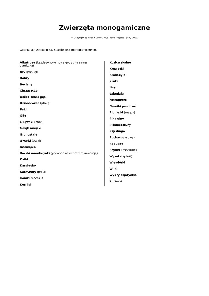 Zwierzęta monogamiczne © Copyright by Robert Surma, wyd. 3bird Projects, Tychy 2010. Ocenia się, że około 3% ssaków jest monogamicznych. Albatrosy (każdego roku nowe gody z tą samą samiczką) Ary (papugi) Bobry Bociany Chrząszcze Dzikie szare gęsi Dzioborożce (ptaki) Foki Gile Głuptaki (ptaki) Gołąb miejski Gronostaje Gwarki (ptaki) Jastrzębie Kaczki mandarynki (podobno nawet razem umierają) Kafki Karaluchy Kardynały (ptaki) Koniki morskie Korniki Kozice skalne Krewetki Krokodyle Kruki Lisy Łabędzie Nietoperze Norniki preriowe Pigmejki (małpy) Pingwiny Piżmoszczury Psy dingo Puchacze (sowy) Ropuchy Scynki (jaszczurki) Wąsatki (ptaki) Wiewiórki Wilki Wydry azjatyckie Żurawie