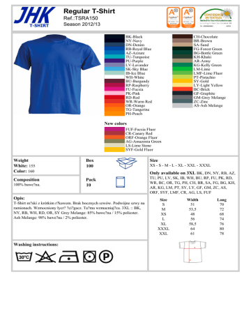 Regular T-Shirt Ref.:TSRA150 Season 2012/13 BK-Black NY-Navy DN-Denim RB-Royal Blue AZ-Azzure TU-Turquoise PU-Purple LV-Lavander SK-Sky Blue IB-Ice Blue WH-White BU-Burgundy RP-Raspberry FU-Fucsia PK-Pink RD-Red WR-Warm Red OR-Orange TG-Tangerine PH-Peach CH-Chocolate BR-Brown SA-Sand FG-Forest Green BG-Bottle Green KH-Khaki AR-Army KG-Kelly Green LM-Lime LMF-Lime Fluor PT-Pistachio SY-Gold LY-Light Yellow BC-Brick GF-Graphite GM-Grey Melange ZC-Zinc AS-Ash Melange New colors FUF-Fucsia Fluor CR-Canary Red ORF-Orange Fluor AG-Amazonia Green LS-Lime Stone SYF-Gold Fluor Weight White: 155 Color: 160 Box 100 Composition Pack 10 100% bawe?na. T-Shirt m?ski z krótkim r?kawem. Brak bocznych szwów. Podwójne szwy na ramionach. Wzmocniony lycr? ?ci?gacz. Ta?ma wzmacniaj?ca. 3XL :: BK, NY, RB, WH, RD, OR, SY Grey Melange: 85% bawe?na / 15% poliester. Ash Melange: 98% bawe?na / 2% poliester. Powered by TCPDF (www.tcpdf.org) XS - S - M - L - XL - XXL - XXXL Only available on 3XL BK, DN, NY, RB, AZ, Opis: Washing instructions: Size TU, PU, LV, SK, IB, WH, BU, RP, FU, PK, RD, WR, BC, OR, TG, PH, CH, BR, SA, FG, BG, KH, AR, KG, LM, PT, SY, LY, GF, GM, ZC, AS, ORF, SYF, LMF, CR, AG, LS, FUF Size S M XS L XL XXXL XXL Width 51 53,5 48 56 58,5 64 61 Long 70 72 68 74 76 80 78